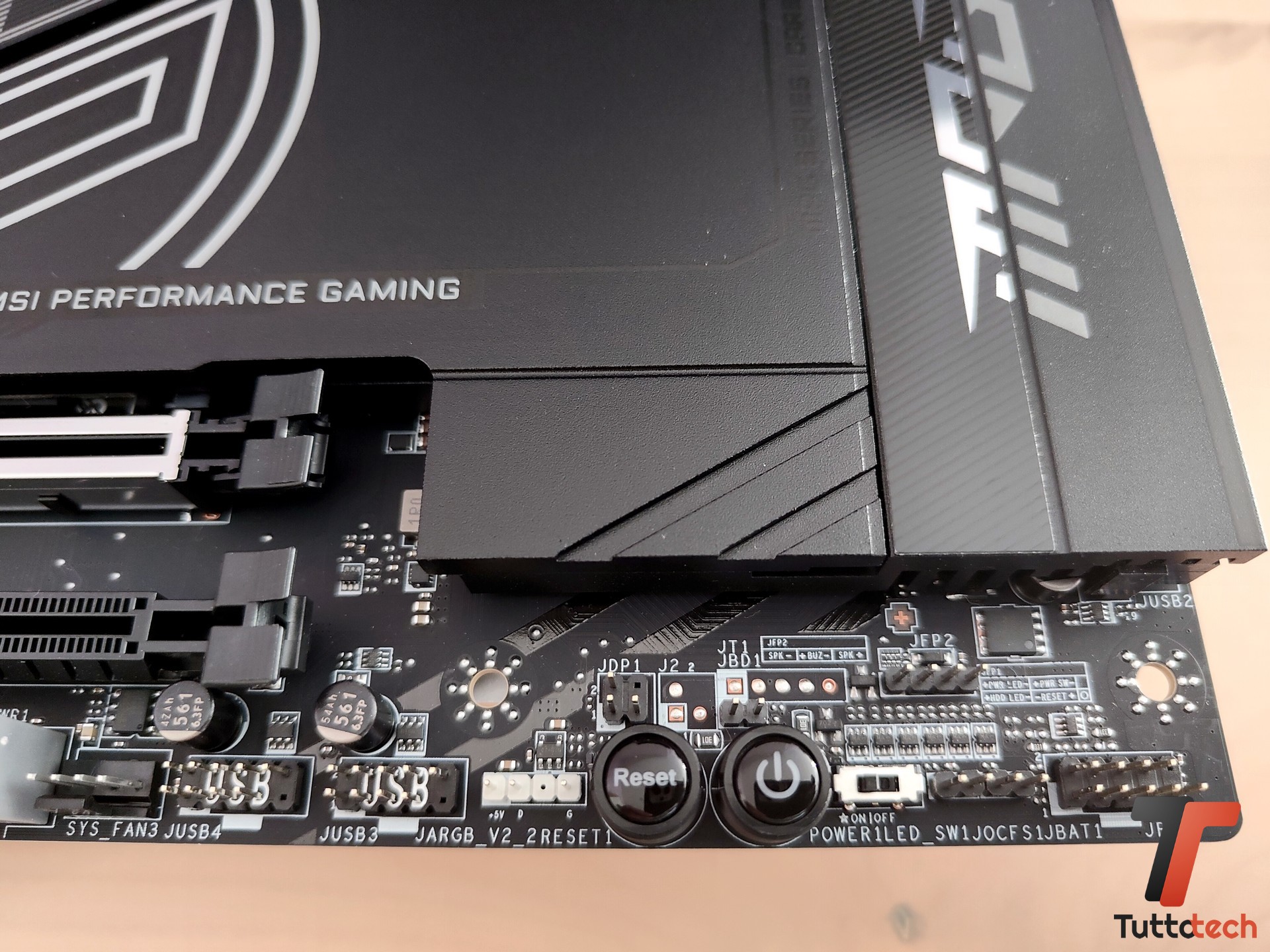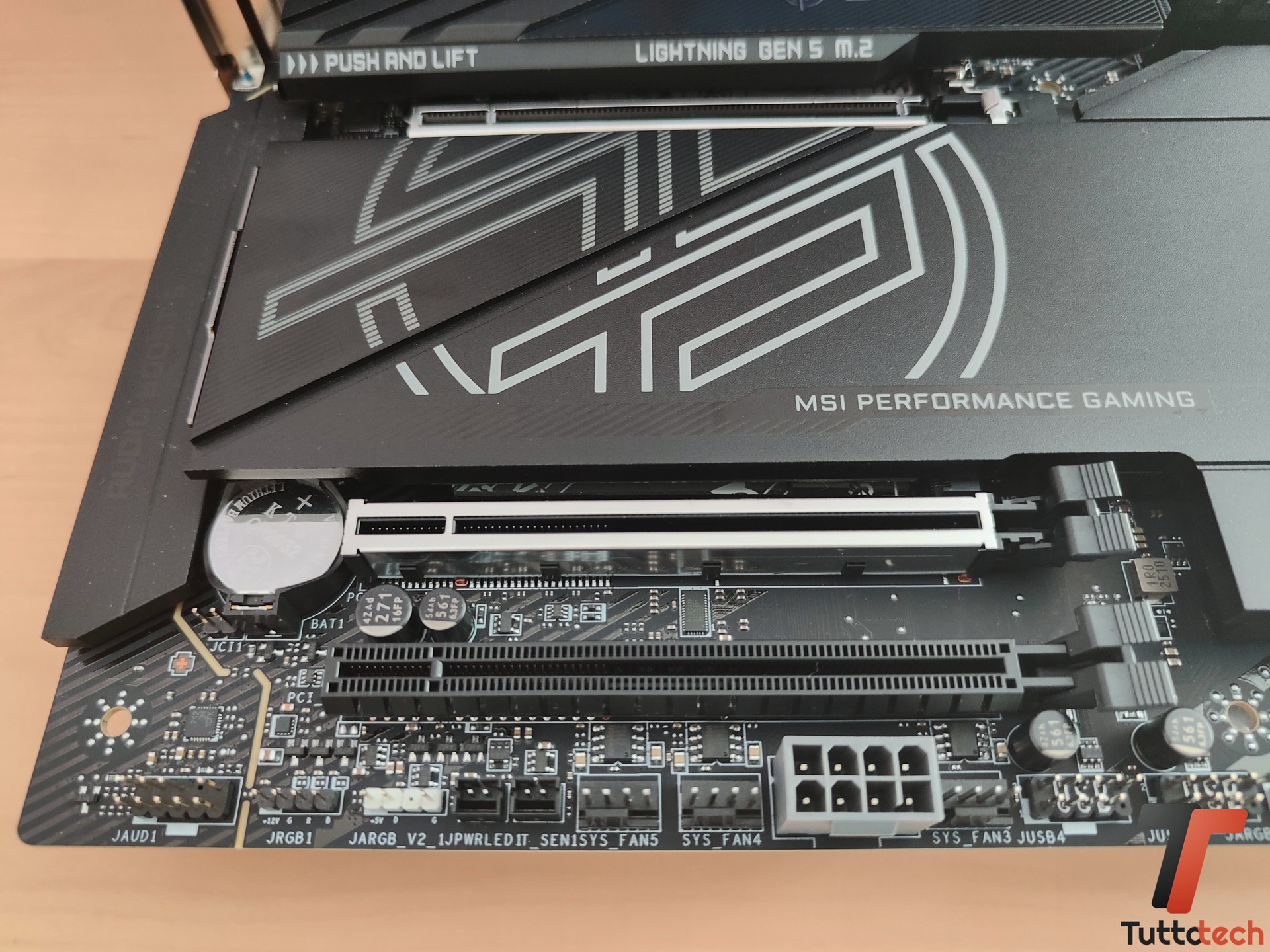 MSI ci dice di aver migliorato sia l’heatsink con heatpipe che i pad termici, non solo su VRM ma anche per gli slot SSD M.2 dotati dell’ormai noto M.2 Shield Frozr. Abbiamo a disposizione 4 slot M.2 dissipati, due Gen 5.0, ma anche un generoso dissipatore sul chipset (anche questo ingrandito).
