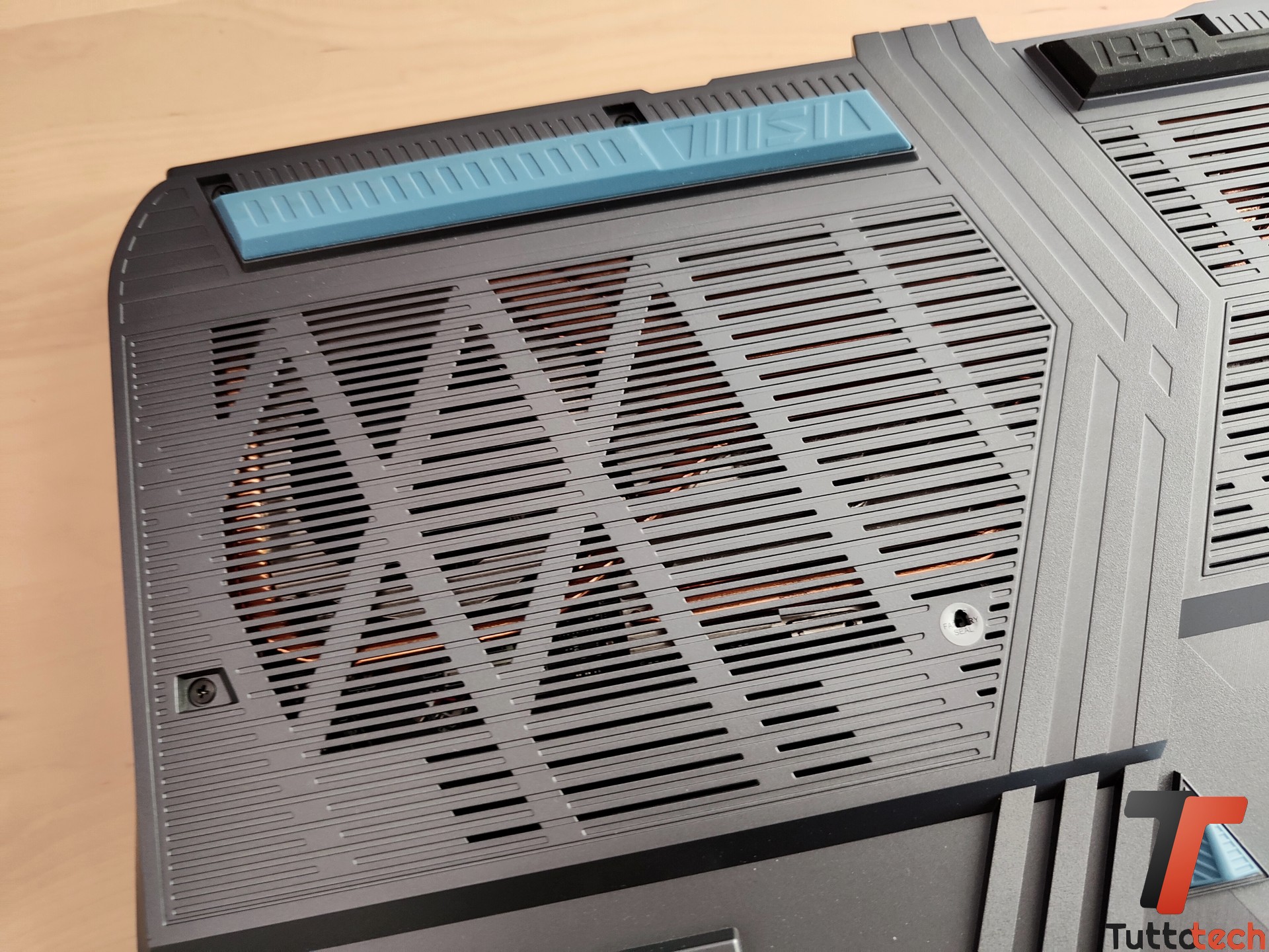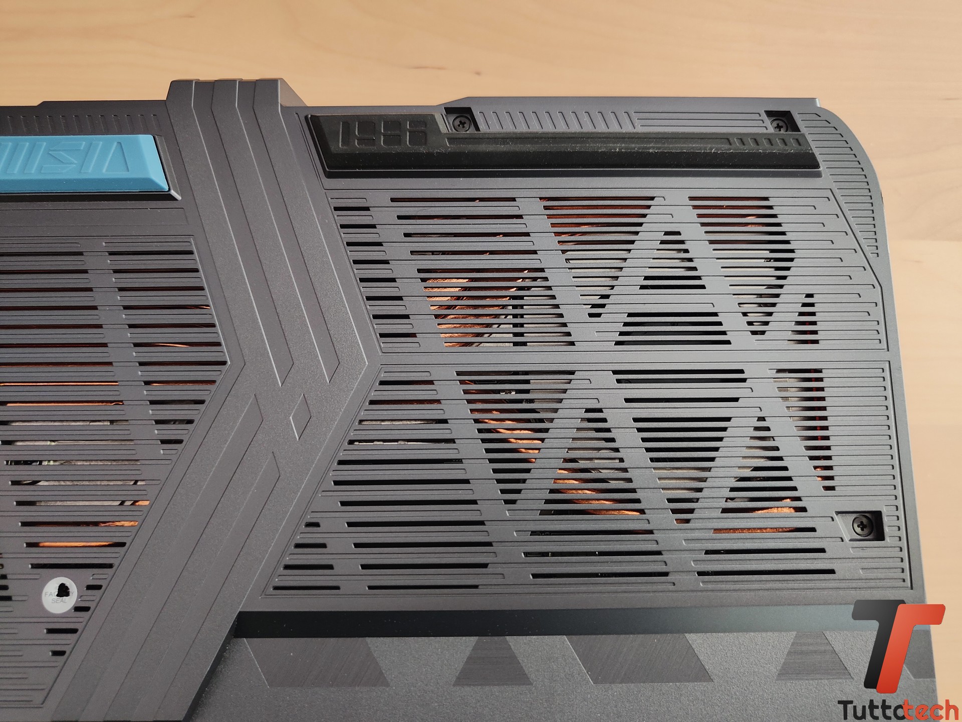 Rimanendo in tema, notiamo che sui lati e sul retro sono previste delle generose prese d’aria che favoriscono l’espulsione dell’aria calda, ambito dove entra in gioco il sistema di dissipazione proprietario Cooler Boost 5, dotato di due ventole e un totale di 7 heatpipe in rame (c’è un modulo termico anche per l’SSD).