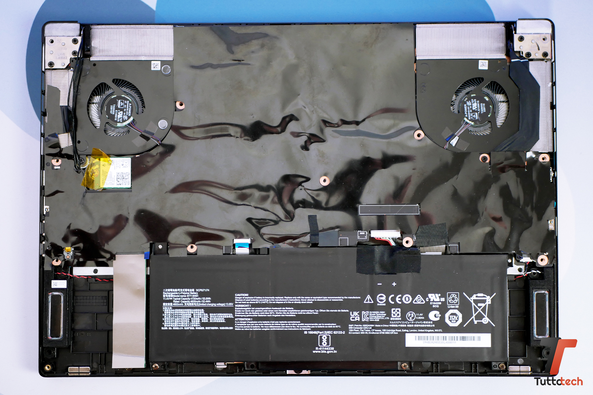Si smonta in due minuti ma la scheda madre è capovolta, quindi è facilmente accessibile solo il modulo SSD M.2 e la scheda Wi-Fi. Non c’è da disperare perché comunque la RAM si può aggiornare ed accedere alla parte frontale della scheda madre non è impossibile con un po’ di pratica. Per quanto riguarda la dissipazione ci sono ben 4 heat pipe di ottima qualità, 4 radiatori, due ventole abbastanza silenziose. L’airflow è ben veicolato, la zona della tastiera non si surriscalda ed il calore generato viene smaltito senza problemi.