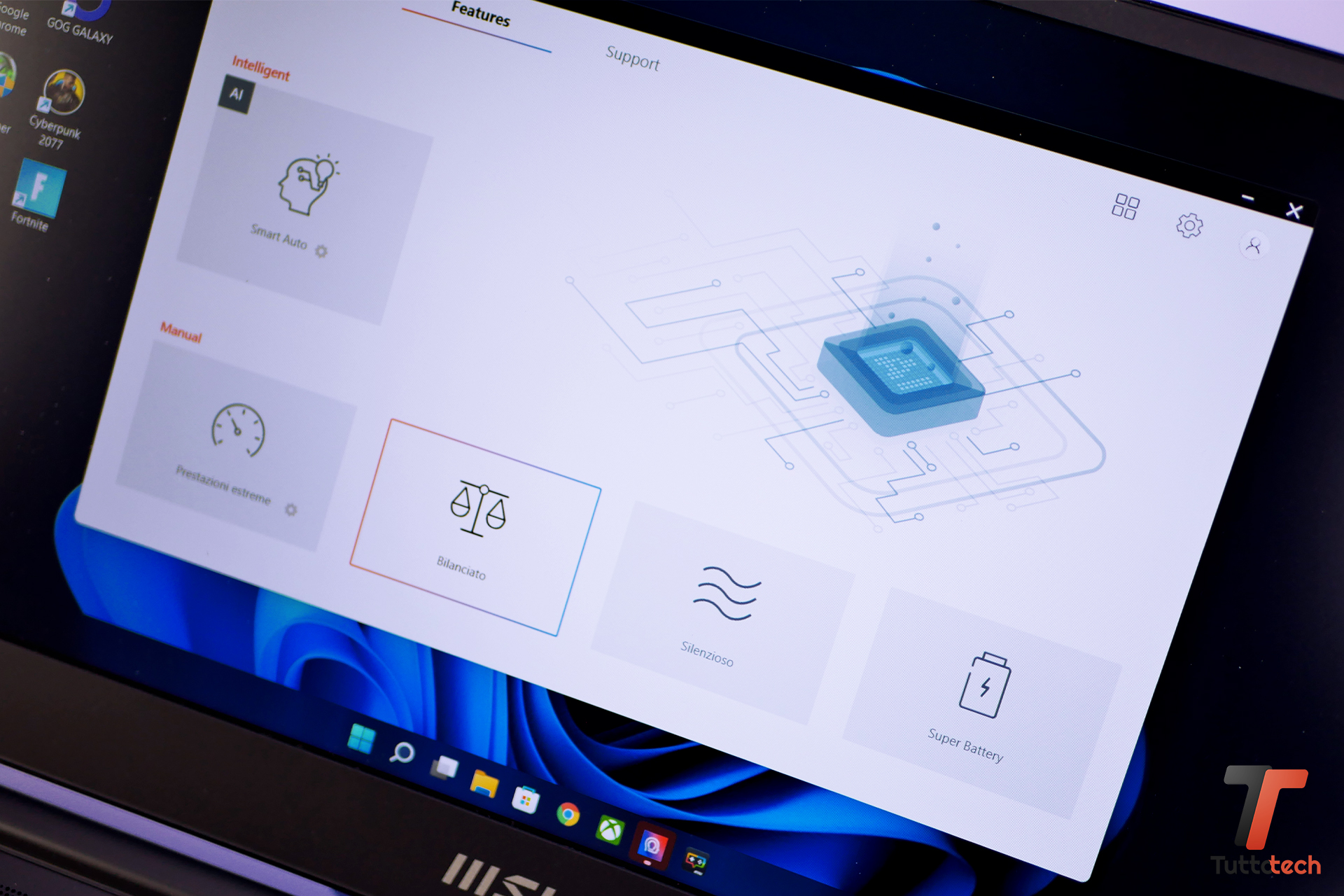Il software di controllo MSI Center è completo, c’è la possibilità di impostare vari profili di utilizzo con una semplice interfaccia per regolare la spinta (anche in overclock) di CPU e GPU con relativa velocità delle ventole. Non solo, MSI ha anche pensato ad una soluzione intuitiva per utilizzare le app Android su Windows 11 con un tool integrato di emulazione che ha anche il Play Store installato. Si chiama MSI App Playter ed è un tool completo, dedicato al gaming ma funziona per tutto, si possono anche installare gli apk con semplicità.