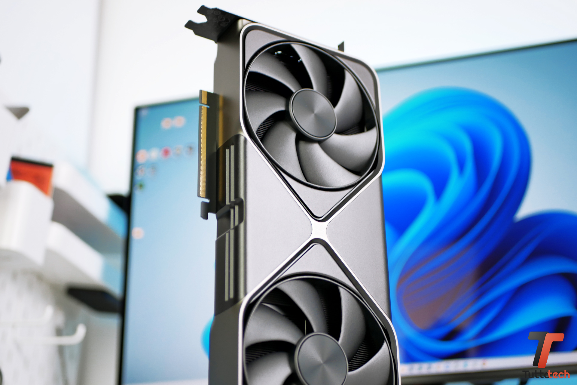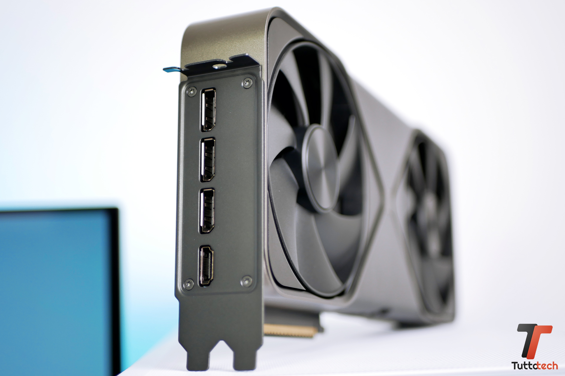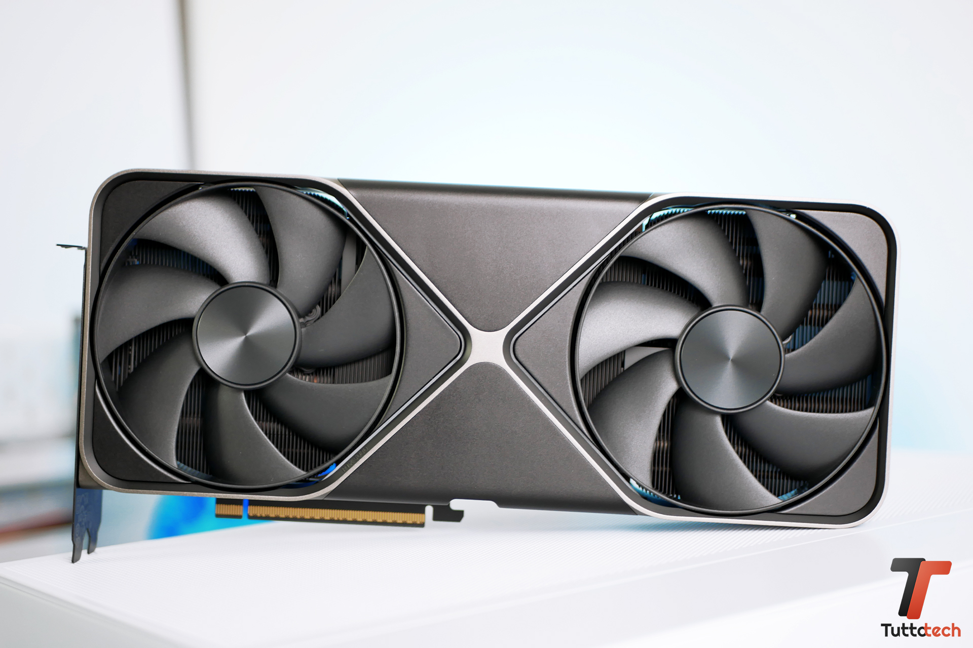 Con questo design qui, NVIDIA strizza l’occhio a builder che vogliono fare una build compatta, un Mini ITX senza dover stare attenti a quanti slot occupi la scheda, alla lunghezza, al cavo troppo piegato. In passato abbiamo visto molte RTX 30 o 40 liquidate custom, difficilmente con questa Founders Edition qualcuno di farà passare in mente questa opzione, è un capolavoro da non toccare. Se vi risulta troppo piccola e non vi sembra di “riempire” il PC, state tranquilli si troveranno più facilmente le personalizzazioni mastodontiche dei brand. Dopo vedremo come funziona in gaming e produttività il design Double Flow Through in termini di rumorosità e temperature. Spoiler, meglio di quanto immaginato.