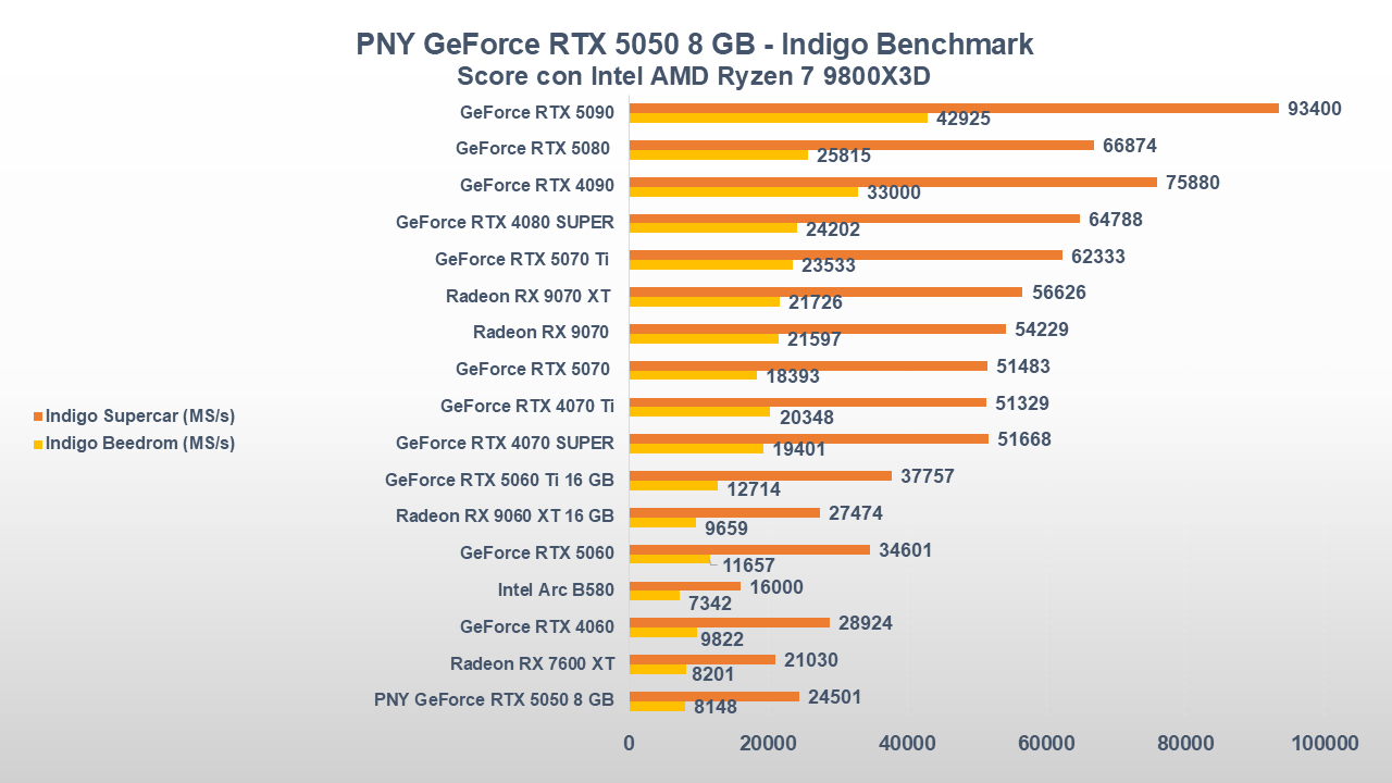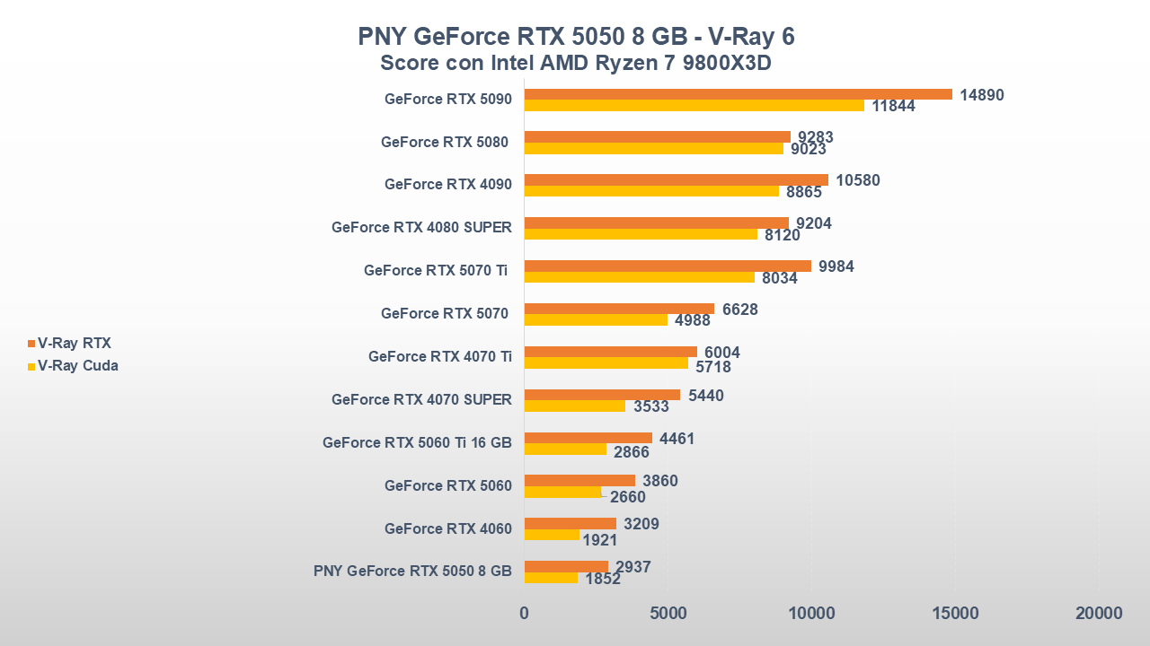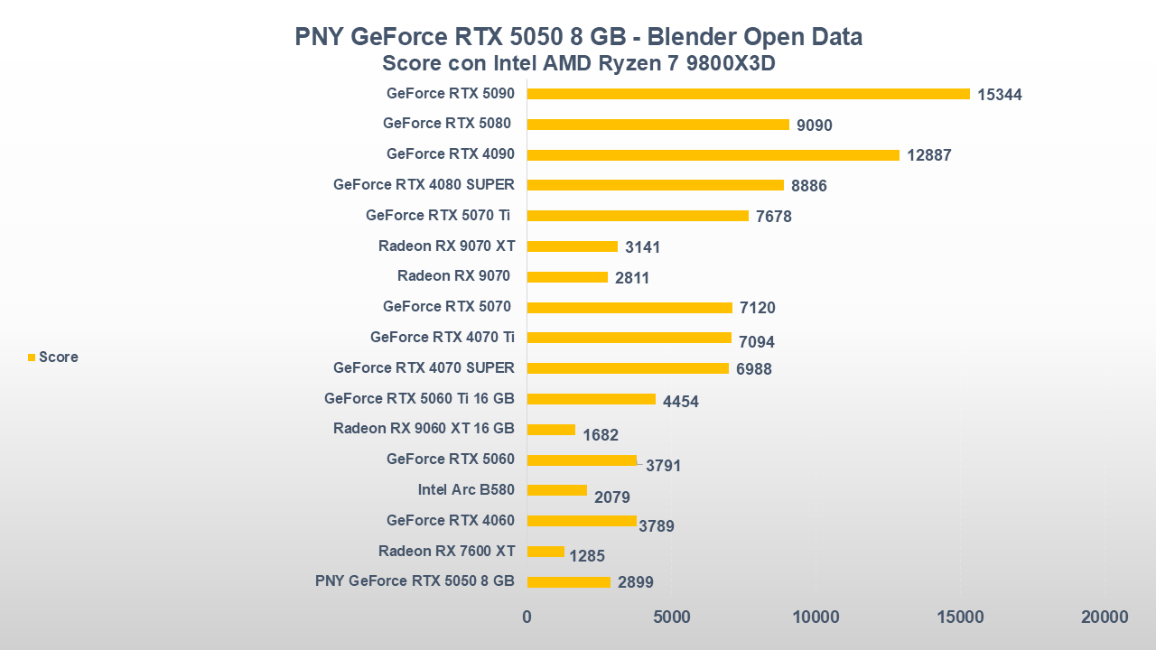 In ambito produttività, calcolo e rendering, senza omettere l’AI, la GeForce RTX 5050 riesce a “riprendersi” rispetto alle sue antagonisti per via della nuova architettura Blackwell.