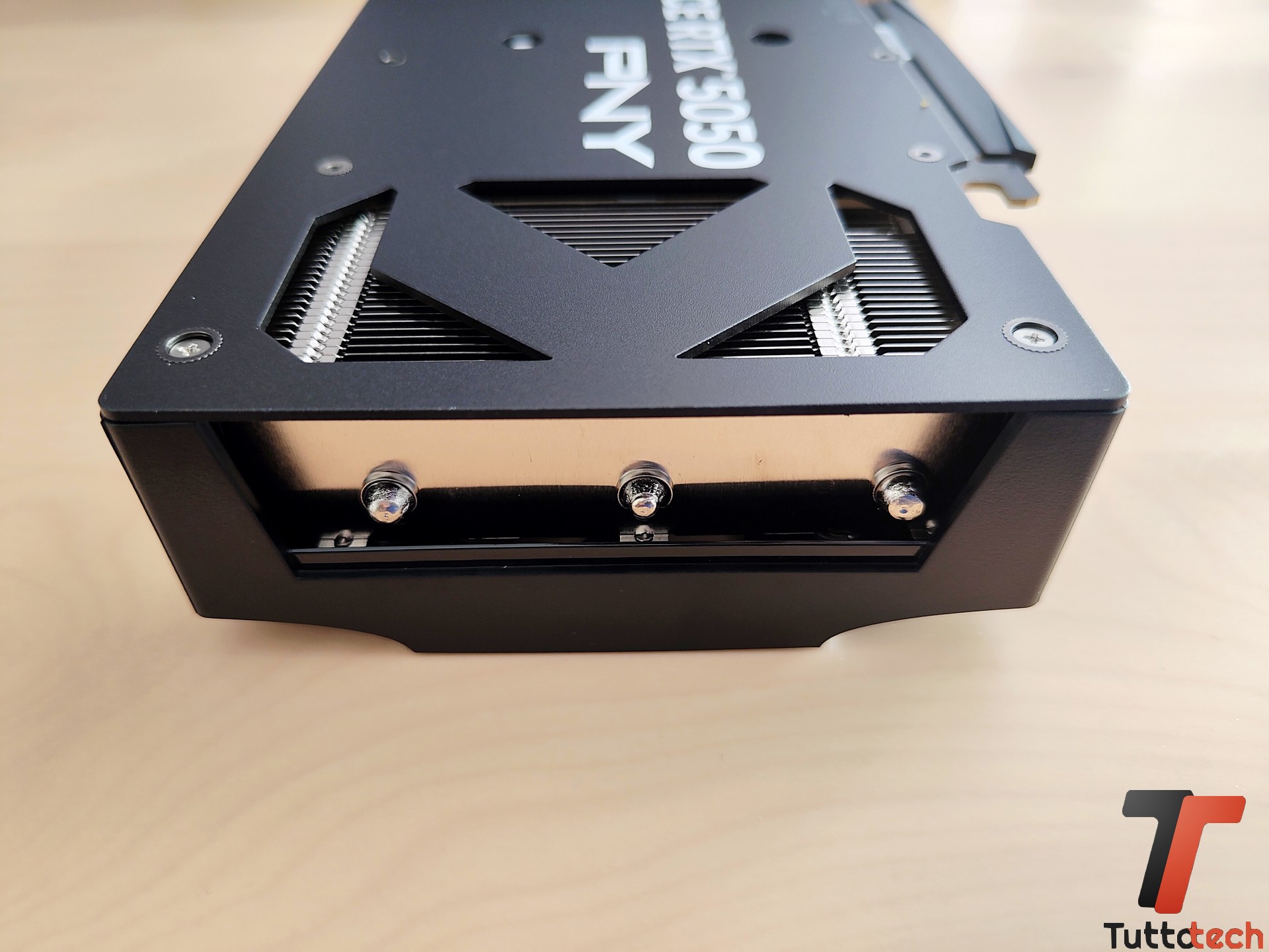 L’estetica, per quanto priva degli ormai classici e immancabili effetti RGB, è pulita e si può adattare facilmente a diverse tipologie di build (soprattutto Micro ATX o Mini ITX). Compatta ma non trascurata questa PNY GeForce RTX 5050, dotata di un dissipatore di calore con tre heatpipe in rame che attraversano il corpo lamellare e garantiscono un raffreddamento efficace della GPU.