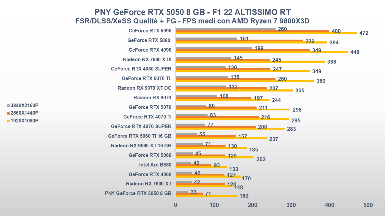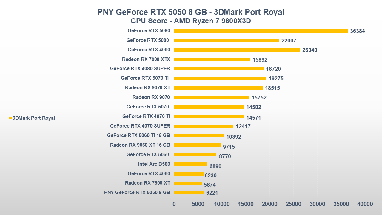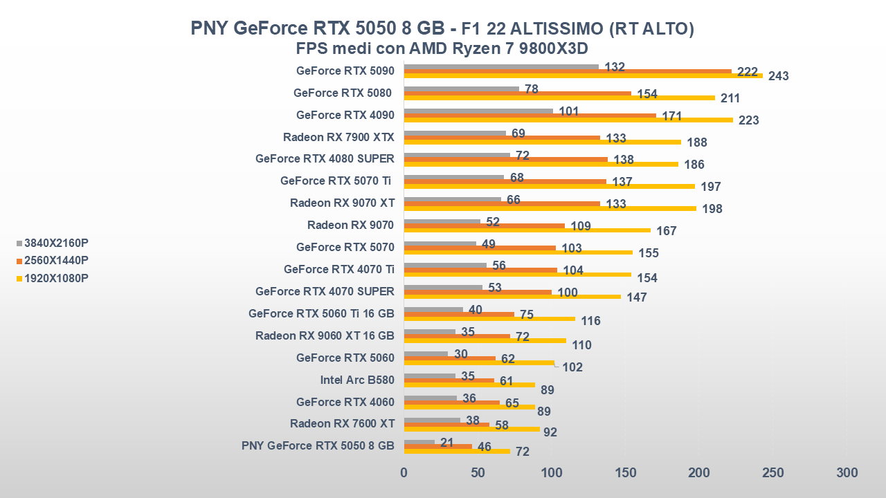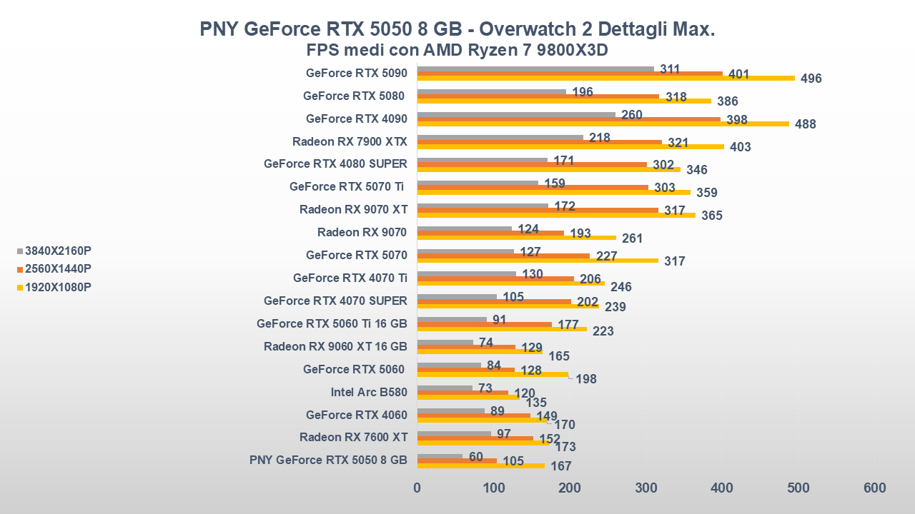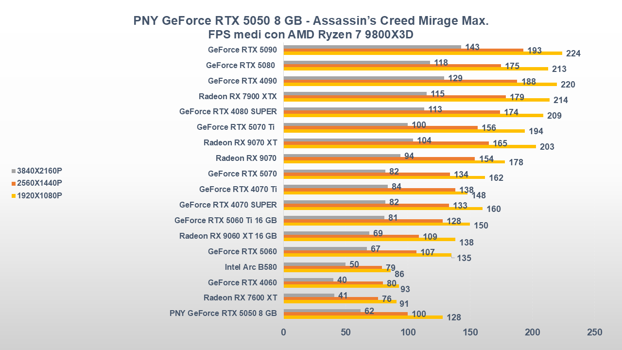 Fino a qui la PNY GeForce RTX 5050 si è comportata abbastanza bene, ora entriamo però in uno scenario come il gaming che, come da pronostico (o sarebbe meglio dire da scheda tecnica), collocherà la scheda nella parte bassa della nostra classifica.
