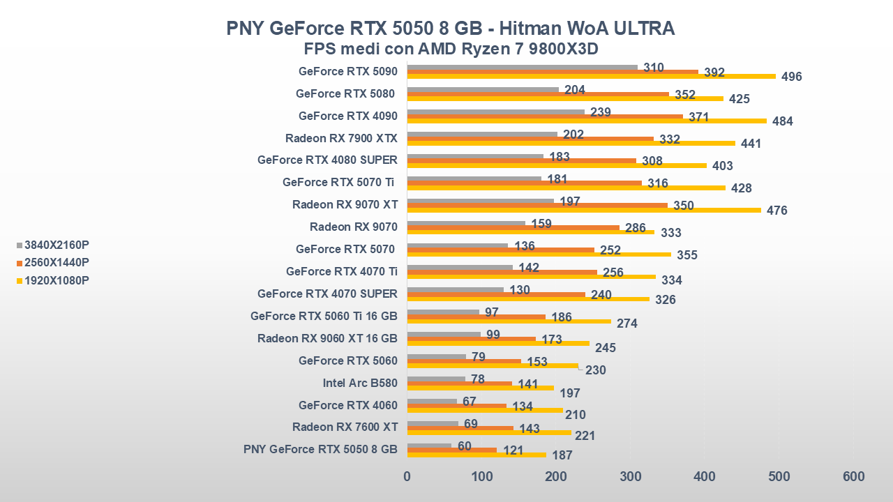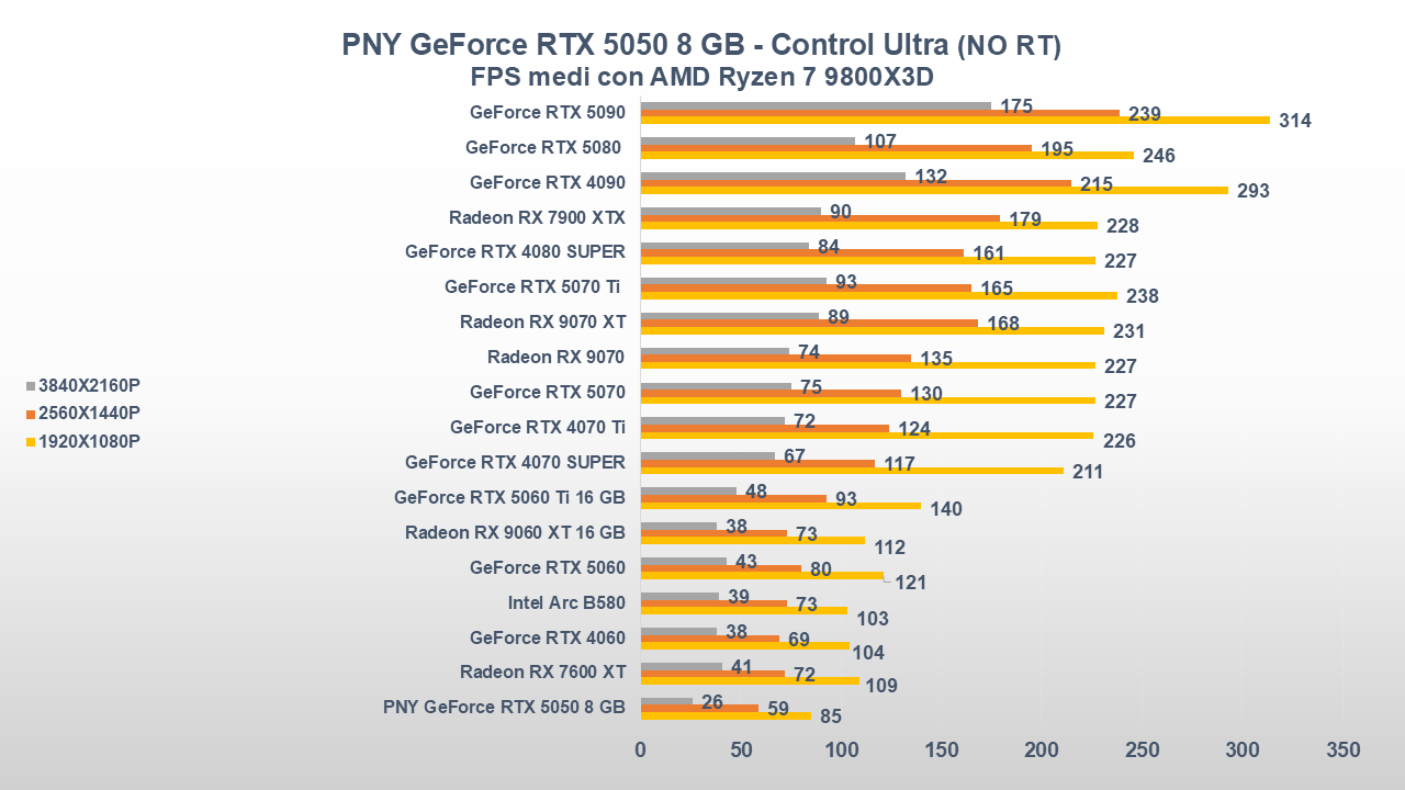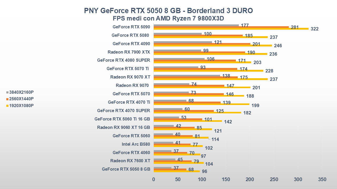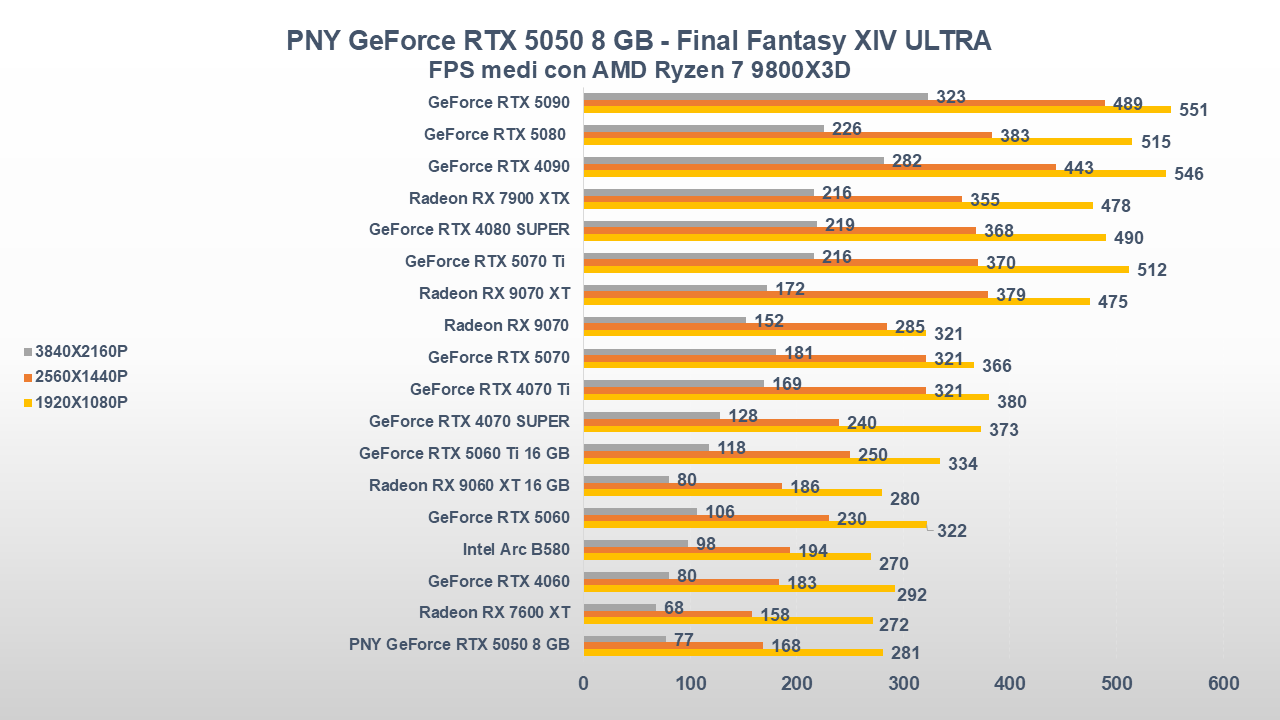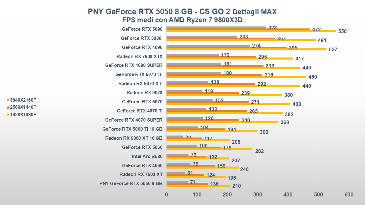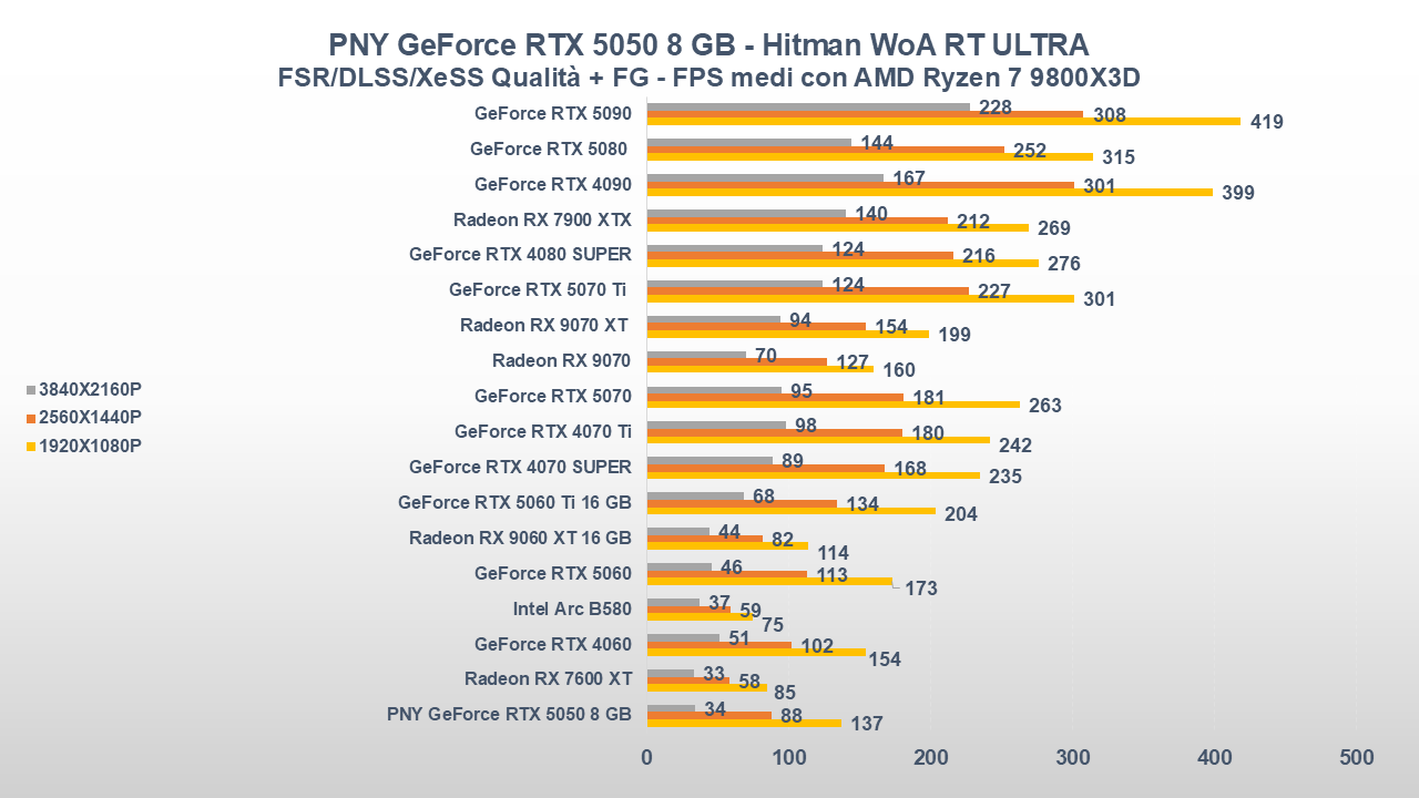 Fino a qui la PNY GeForce RTX 5050 si è comportata abbastanza bene, ora entriamo però in uno scenario come il gaming che, come da pronostico (o sarebbe meglio dire da scheda tecnica), collocherà la scheda nella parte bassa della nostra classifica.