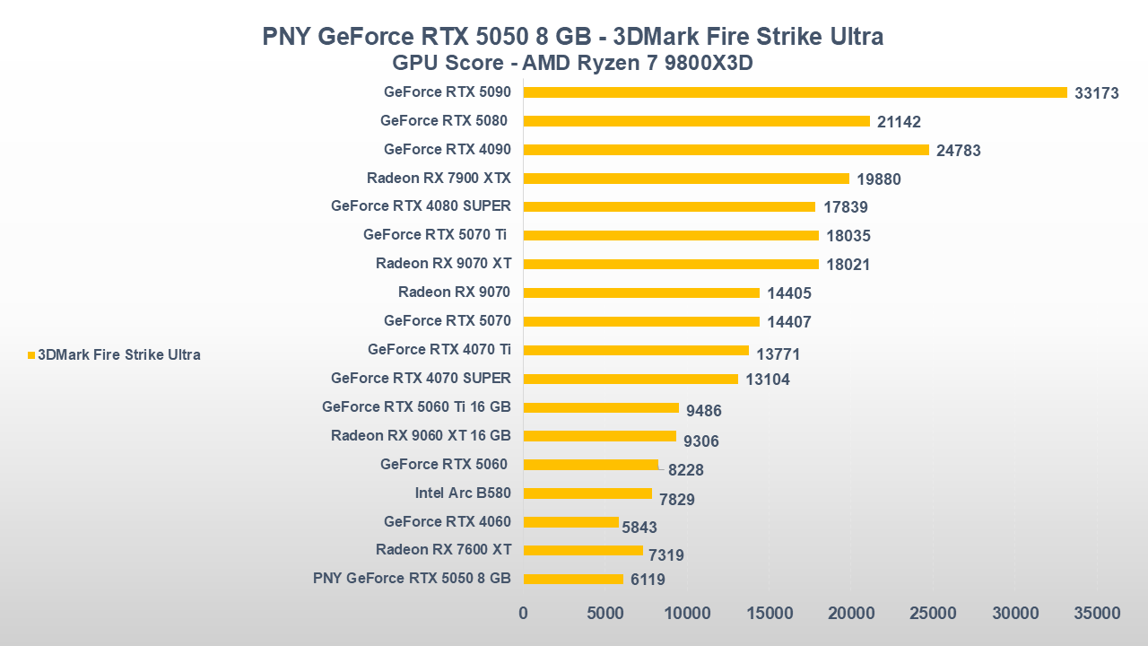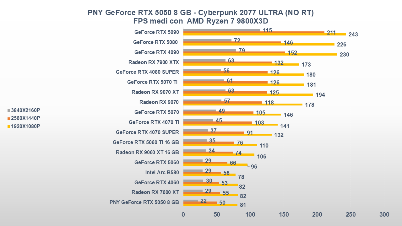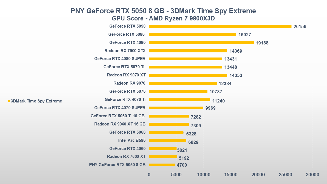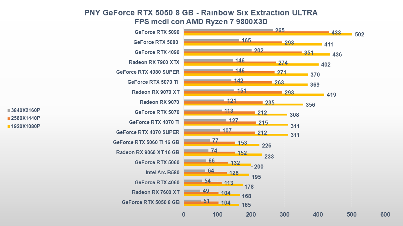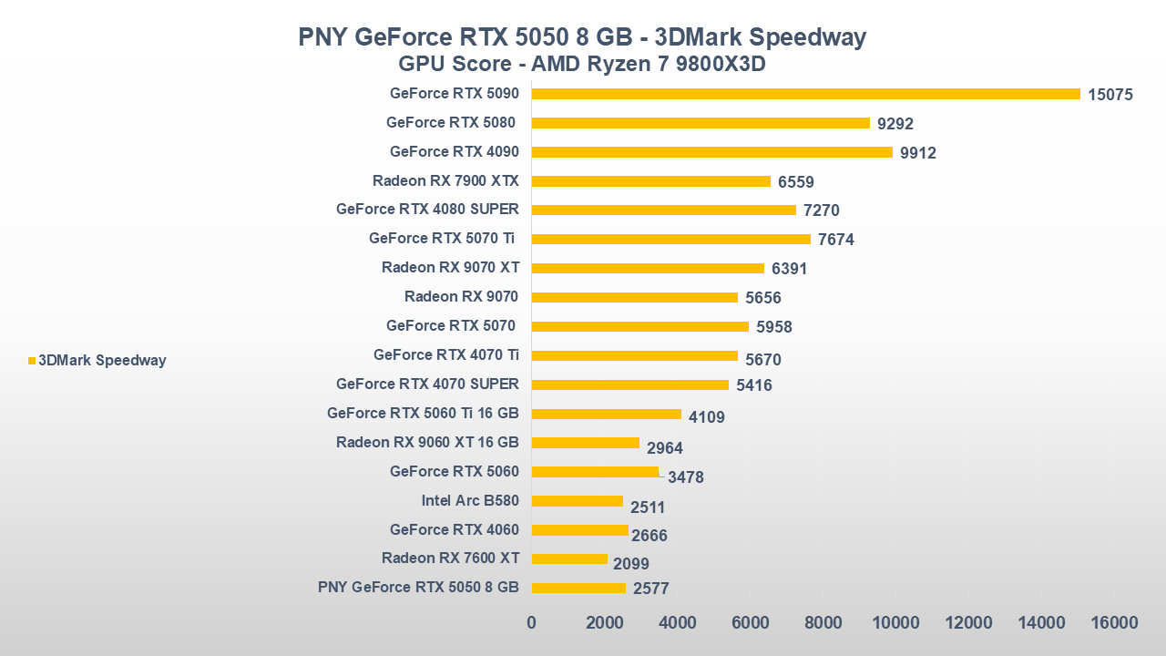 Fino a qui la PNY GeForce RTX 5050 si è comportata abbastanza bene, ora entriamo però in uno scenario come il gaming che, come da pronostico (o sarebbe meglio dire da scheda tecnica), collocherà la scheda nella parte bassa della nostra classifica.