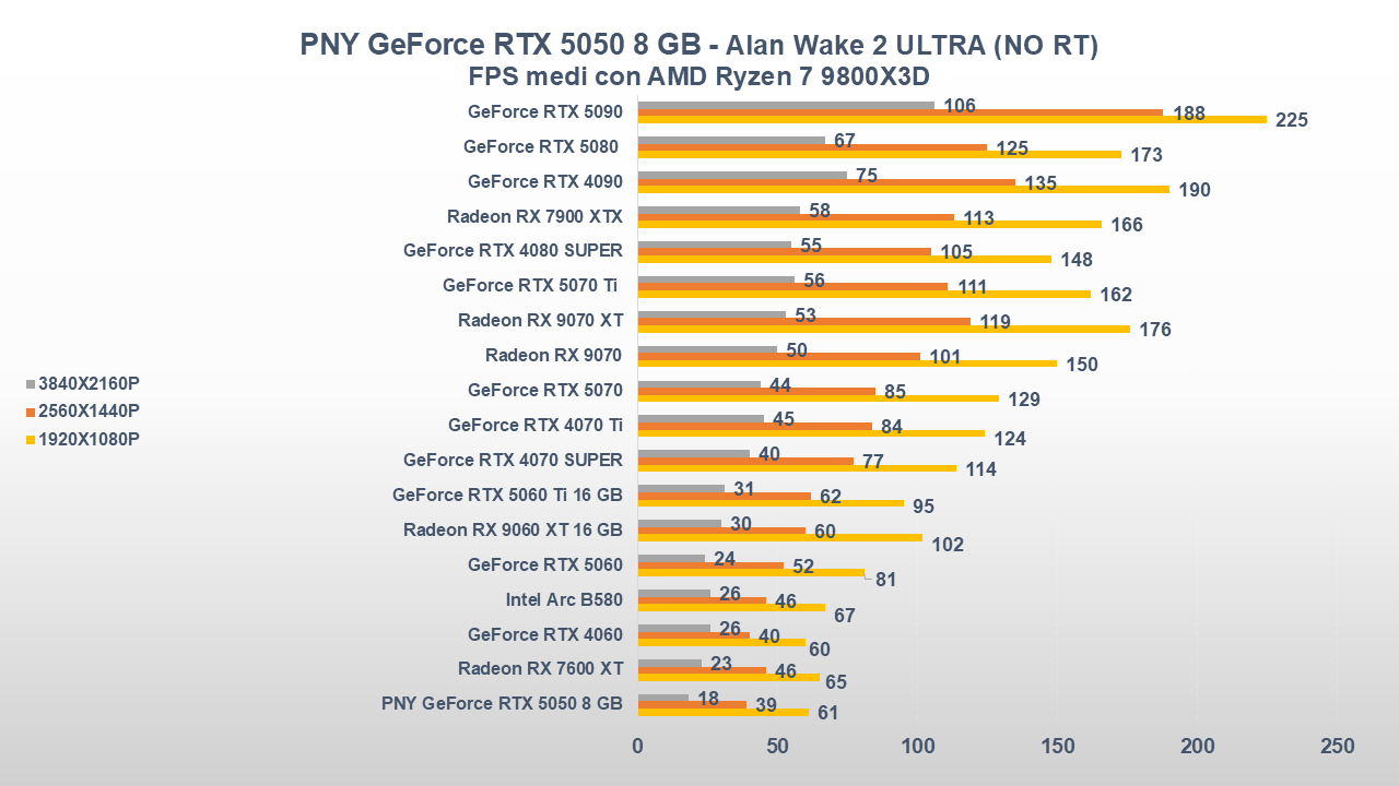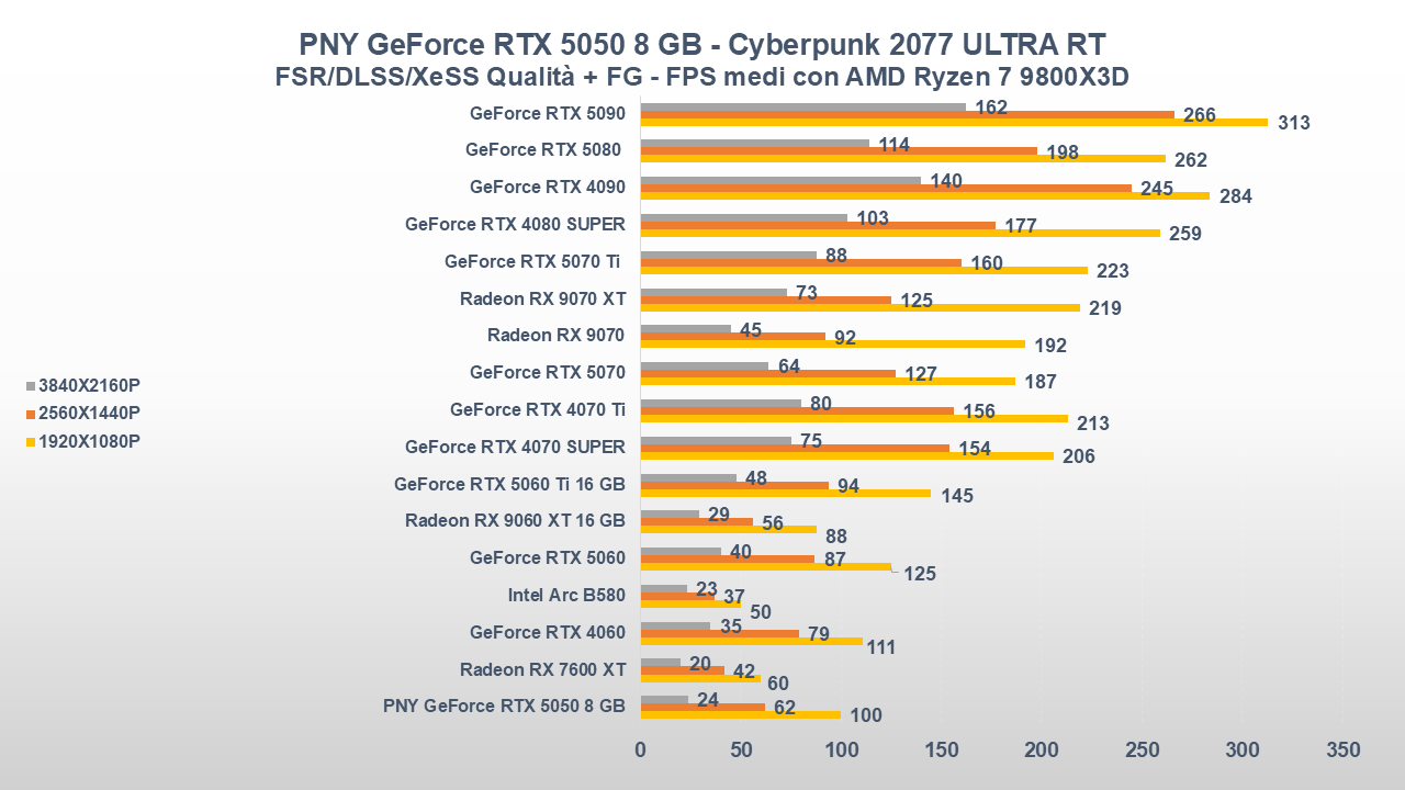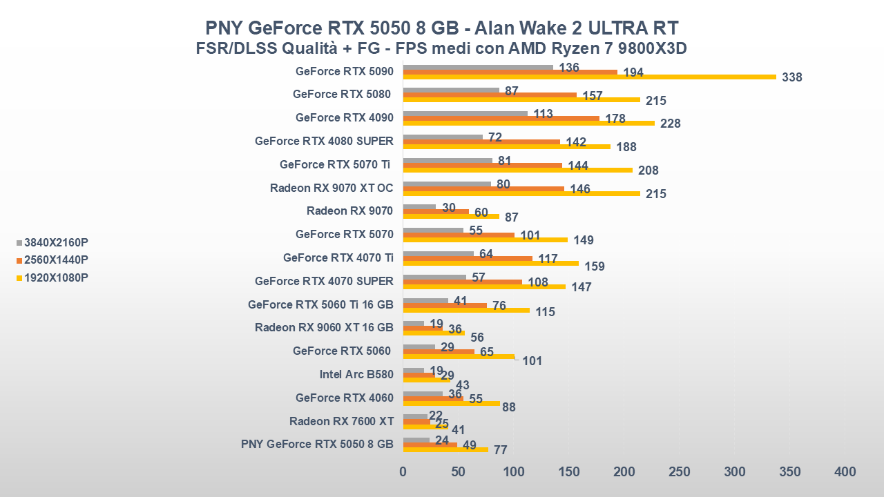 Nonostante questo, le prestazioni a 1080P (a volte anche a 1440P) non sono affatto male, inoltre ricordiamo che nei titoli supportati dal DLSS 4.0 con Multi Frame Generation (x3 o x4), il frame-rate può migliorare sensibilmente rispetto alla concorrenza e alle stesse GPU serie RTX 40.