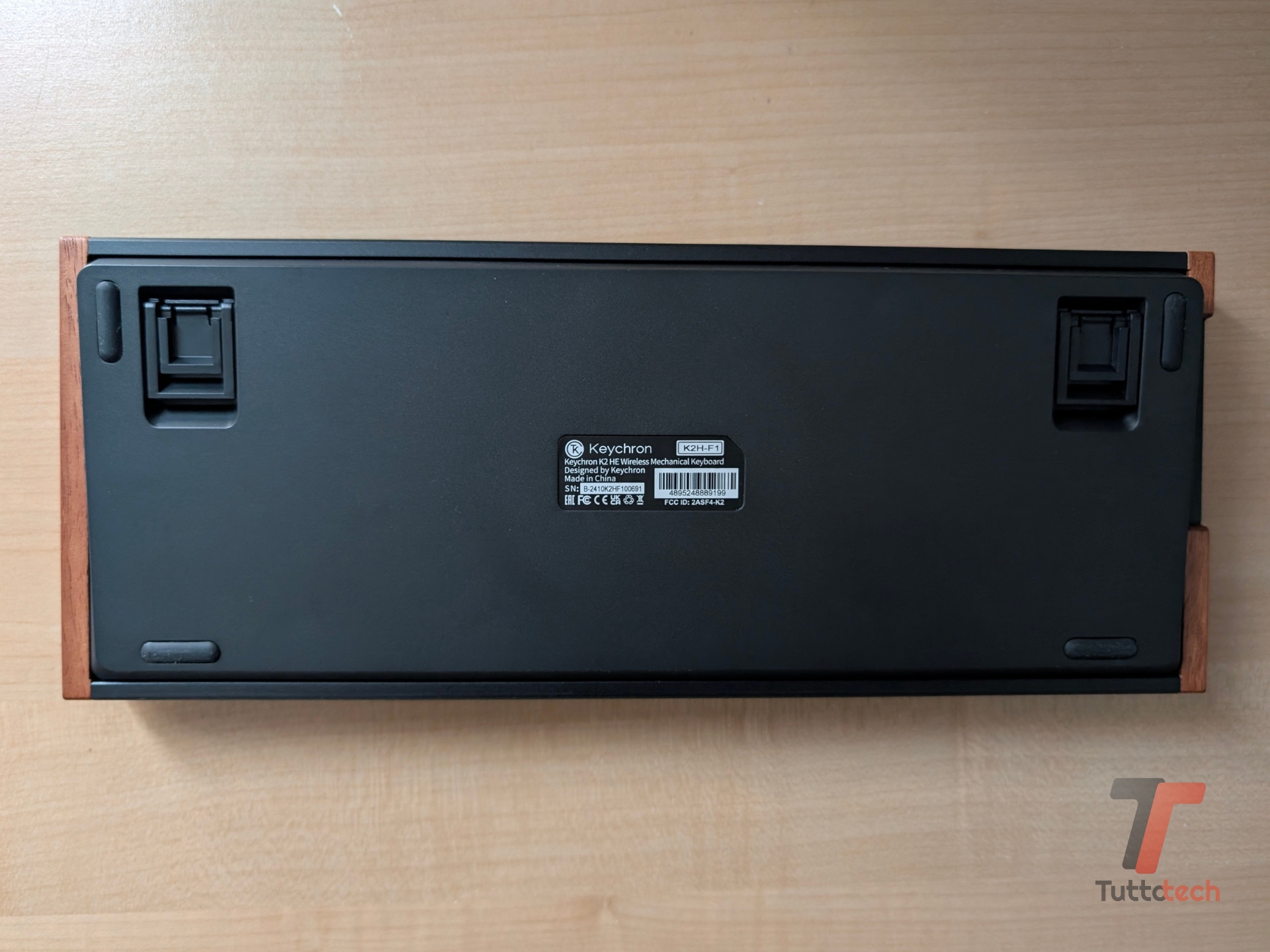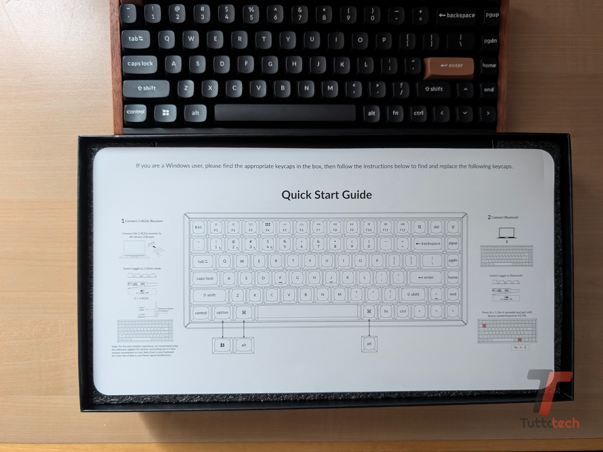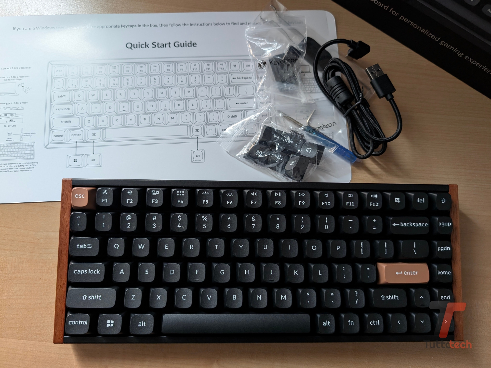 La confezione di vendita della Keychron K2 HE “Special Edition” offre una dotazione abbastanza completa: oltre alla tastiera, troviamo un lungo cavo da USB-A a USB-C per collegarla al computer (utile per la ricarica o l’utilizzo come tastiera cablata), il ricevitore USB-A per l’utilizzo della tastiera in modalità wireless (su rete 2.4 GHz), alcuni switch extra, i keycap intercambiabili (per le funzioni di sistema dei computer Windows e dei computer Mac), i due strumenti per rimuovere i keycap e gli switch, due attrezzi per la rimozione delle viti e degli accenti in legno, una guida rapida all’avvio, il manuale d’uso.