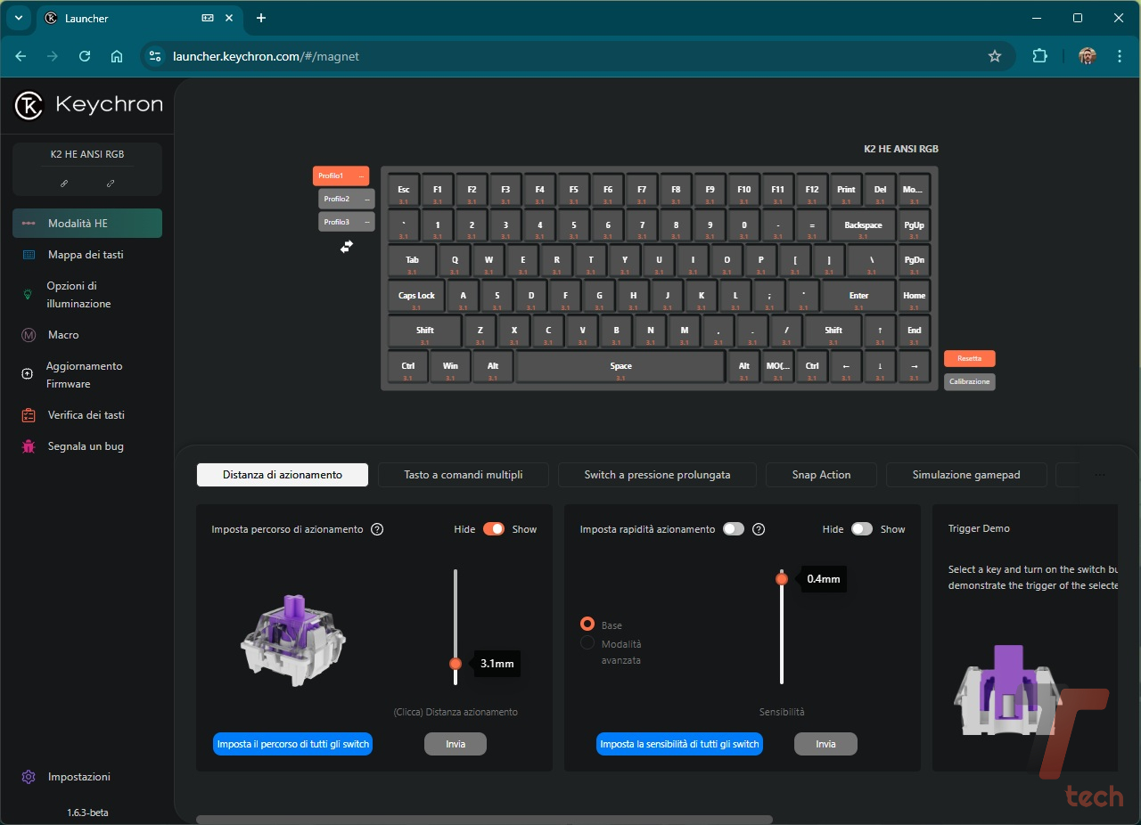 A ogni modo, oltre alle opzioni legate alle funzioni dei tasti, l’app consente anche una personalizzazione profonda per quanto concerne la retroilluminazione e, soprattutto, il punto di attuazione. Gli switch magnetici, come detto, consentono di regolare il punto di attuazione di ogni singolo tasto con incrementi di 0,1 mm. Ciò significa che l’utente può decidere la “forza” da imprimere su ogni singolo tasto affinché esso si attivi.