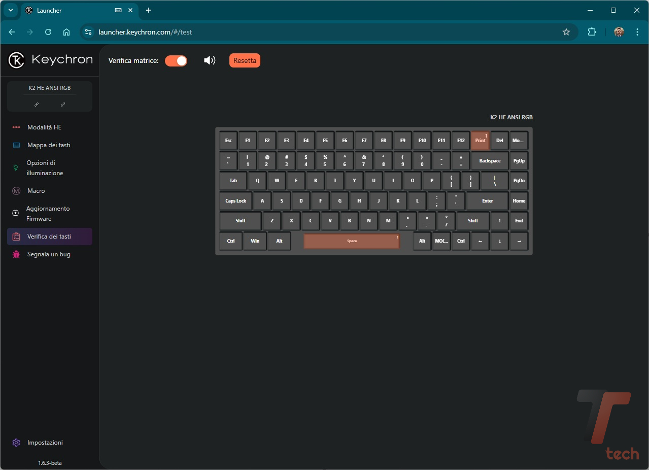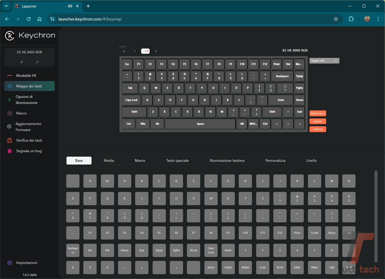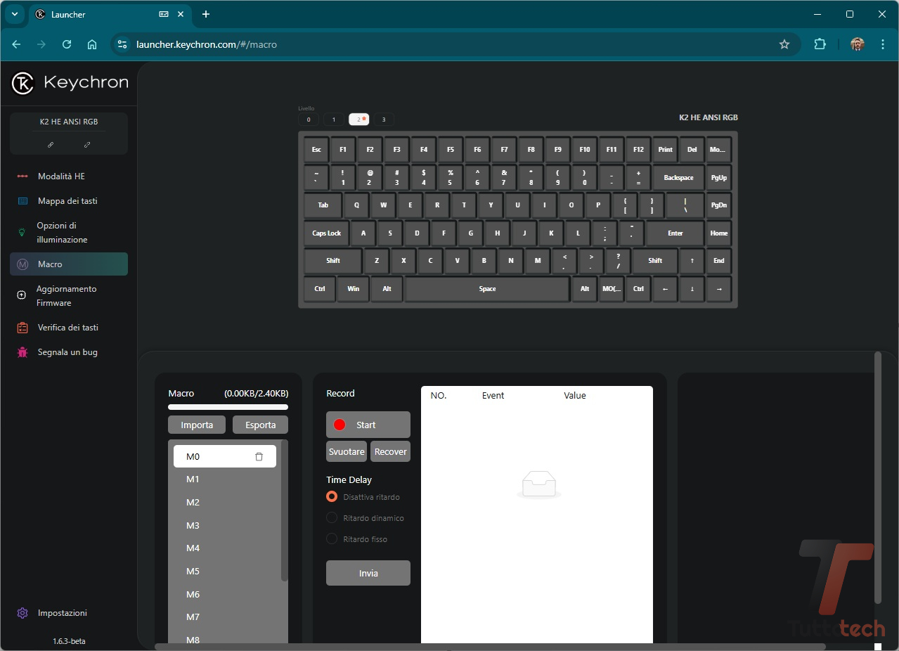 Alla pari delle altre tastiere del produttore cinese, per la personalizzazione dobbiamo rivolgerci alla Web App Keychron Launcher (davvero ben fatta, anche sul fronte delle traduzioni) che permette di programmare macro, rimappare i tasti, assegnare svariate combinazioni ai tasti funzione.