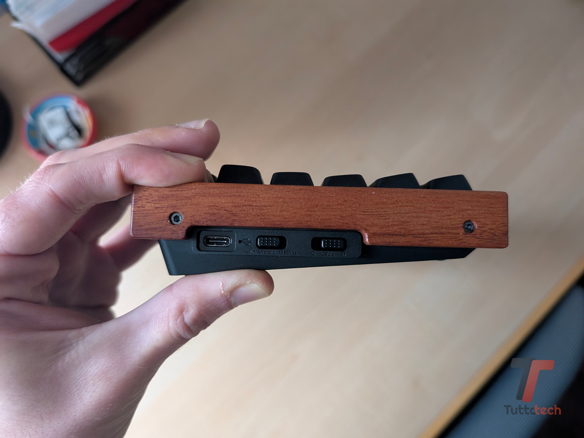 La porta USB-C è comoda da raggiungere (e una volta collegata al computer, la tastiera verrà riconosciuta immediatamente). Essa e i due interruttori, uno per la compatibilità (Windows/Android o Mac/iOS) e uno per la modalità di collegamento (rete 2.4 GHz, cavo, Bluetooth) sono collocati sul lato sinistro.