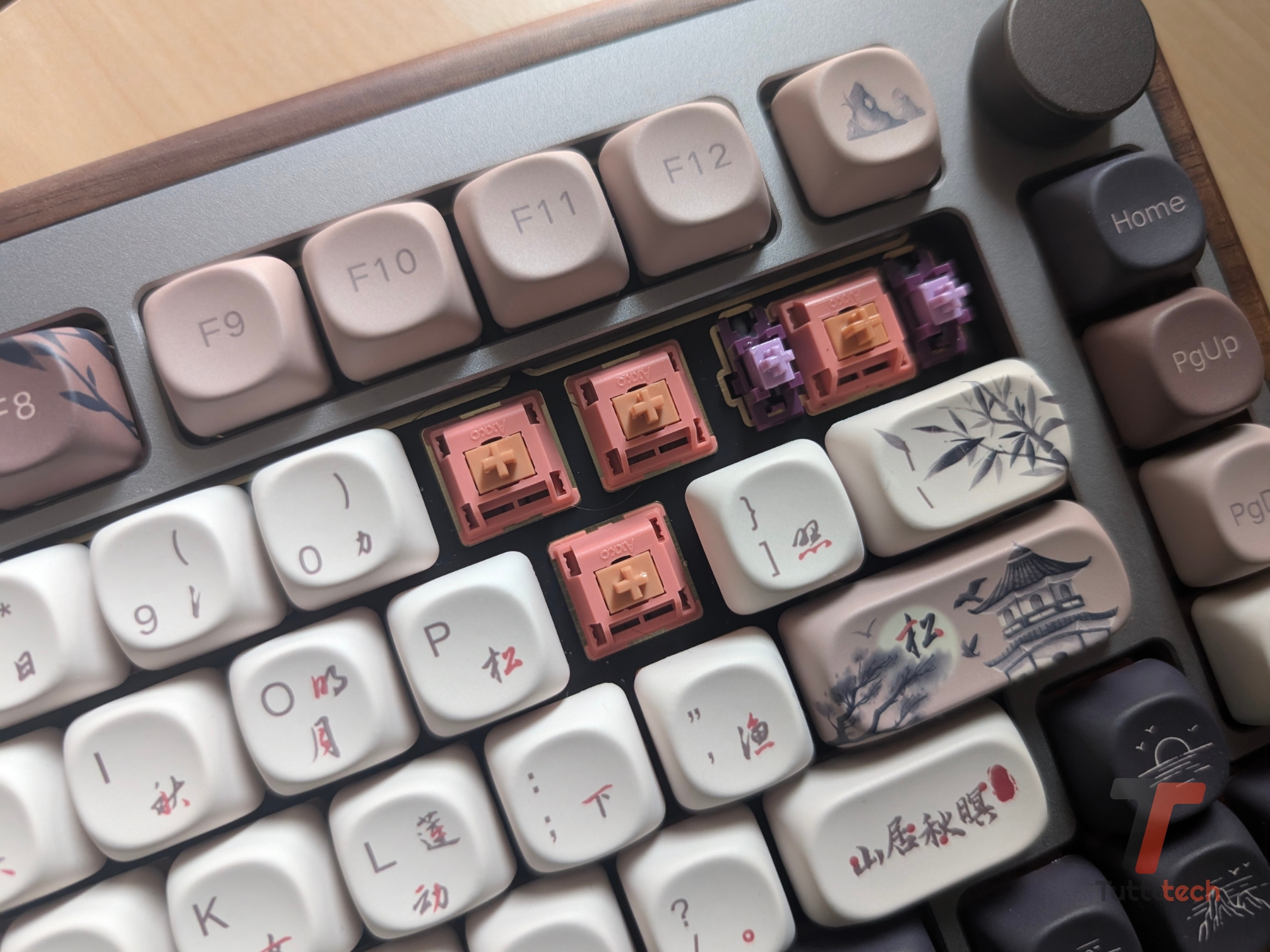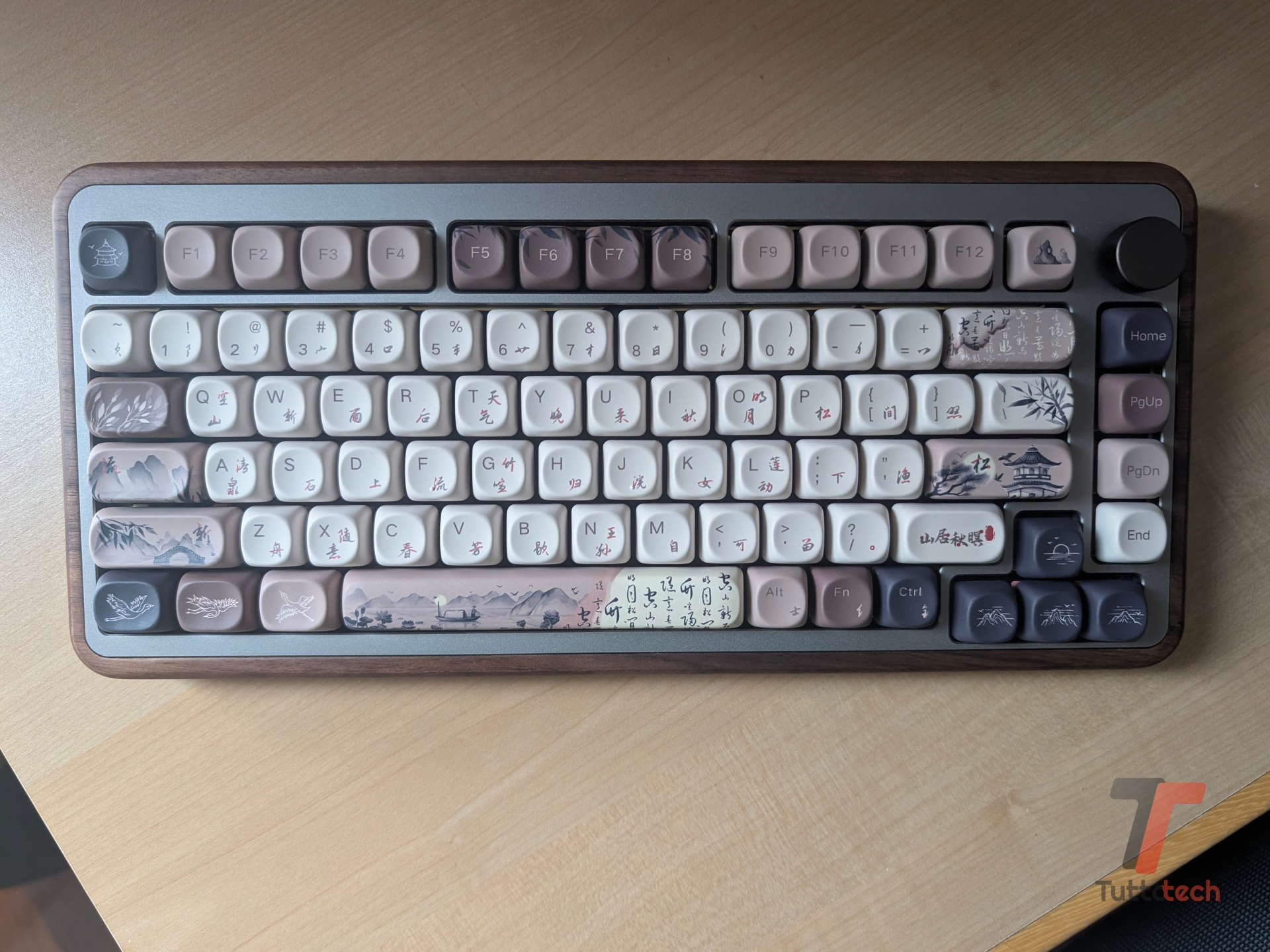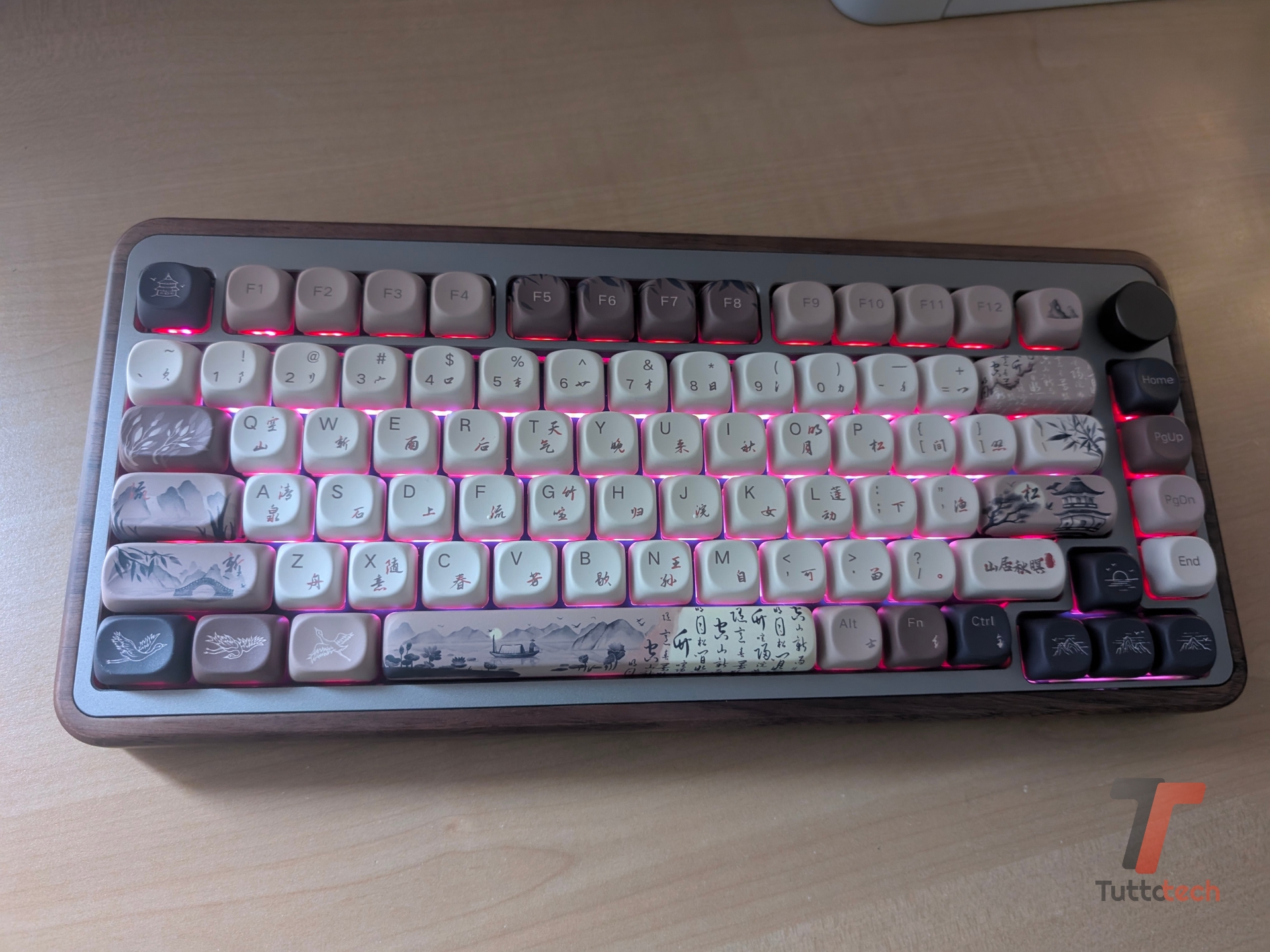 Un design elegante, sì, ma particolare per via del tema che personalizza i keycap. Il touch and feel è ottimo, grazie alla cassa in legno. Sono poi presenti le solite doti di versatilità (funziona via Bluetooth, via rete a 2.4 GHz e via cavo USB-C) e personalizzazione, in questo caso di tasti e retroilluminazione, a cui ci ha abituati il produttore cinese.