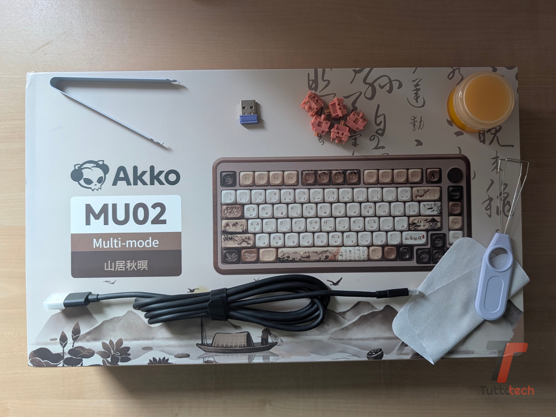La confezione di vendita della AKKO MU02 offre una dotazione abbastanza classica: oltre alla tastiera, troviamo un lungo cavo da USB-A a USB-C per collegarla al computer (utile per la ricarica o l’utilizzo come tastiera cablata), il ricevitore USB-A per l’utilizzo della tastiera in modalità wireless (su rete 2.4 GHz), cinque switch extra, i due strumenti per rimuovere i keycap e gli switch, una “cover” per proteggere la tastiera dalla polvere, una sorta di lucido per il mantenimento del legno, un pannetto e il manualetto rapido delle istruzioni.
