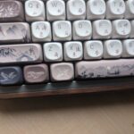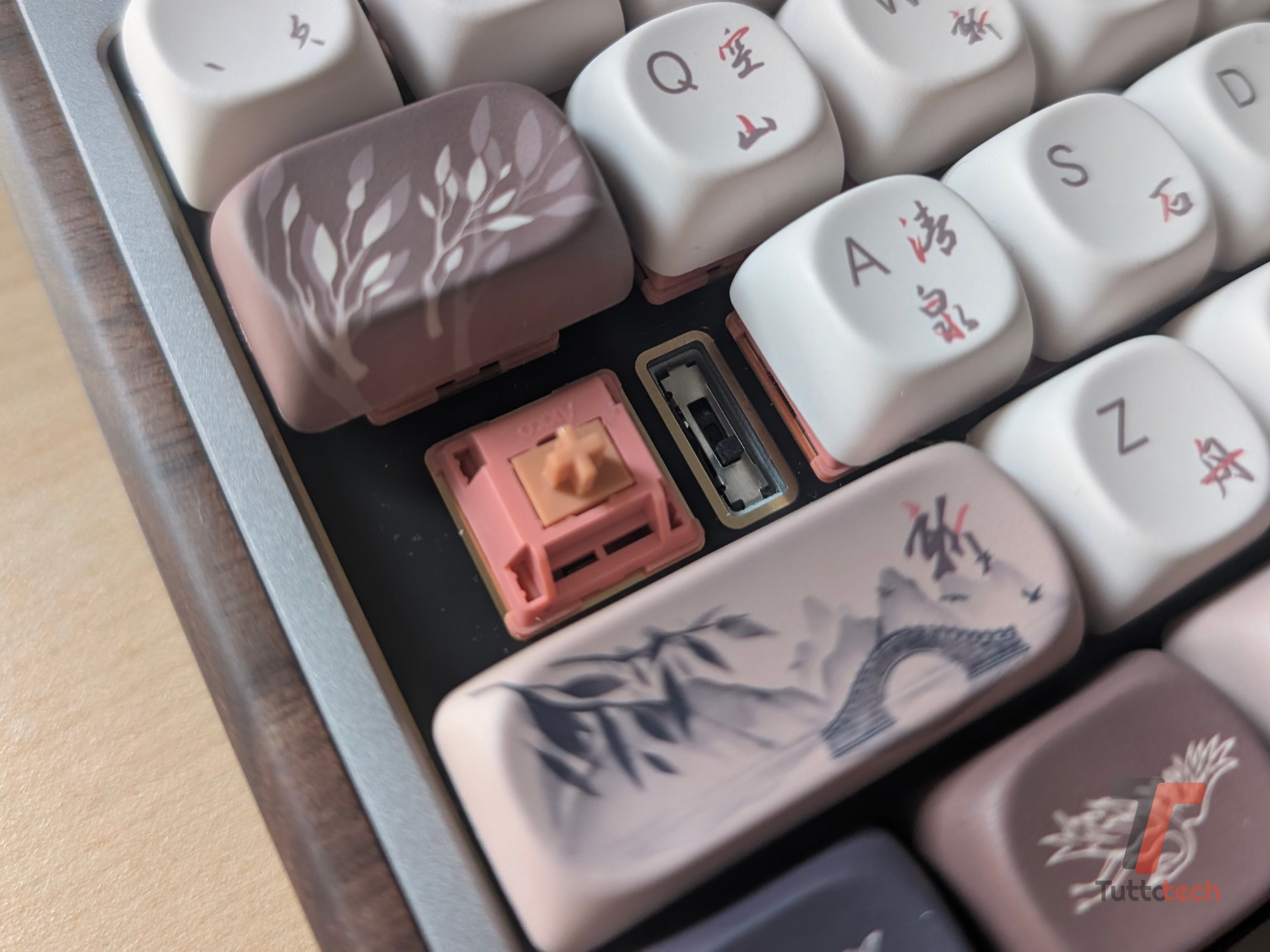 Sul fronte dei materiali, qua siamo sulla fascia alta: AKKO ha optato per una cassa in legno di noce, un materiale che risulta caldo al tatto e trasmette una sensazione abbastanza premium al tatto. La versione che abbiamo provato di questa AKKO MU02 è personalizzata con un tema chiamato “Mountain Seclusion”: la parte attorno ai tasti è in una sorta di argento scuro spazzolato, mentre i keycap prevedono motivi ispirati alla natura e si presentano con colorazioni che giocano sulle tonalità del marrone (dal beige al marrone scuro).