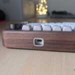 Il design generale risulta sobrio, oltre che elegante: i bordi laterali sono tutti “puliti”, eccezion fatta per quello posteriore che presenta una finestra che ospita la porta USB-C (per la ricarica e l’utilizzo come tastiera cablata). Anche la parte inferiore è pulita ma ospita tre piedini gommati (due piccoli nella parte dove la tastiera è più bassa e uno lungo nella parte dove la tastiera è più alta), utili per evitare che la parte posteriore possa rovinarsi o che la tastiera possa scivolare sulla superficie in cui è posizionata. In alto a destra è presente una manopola rotante.