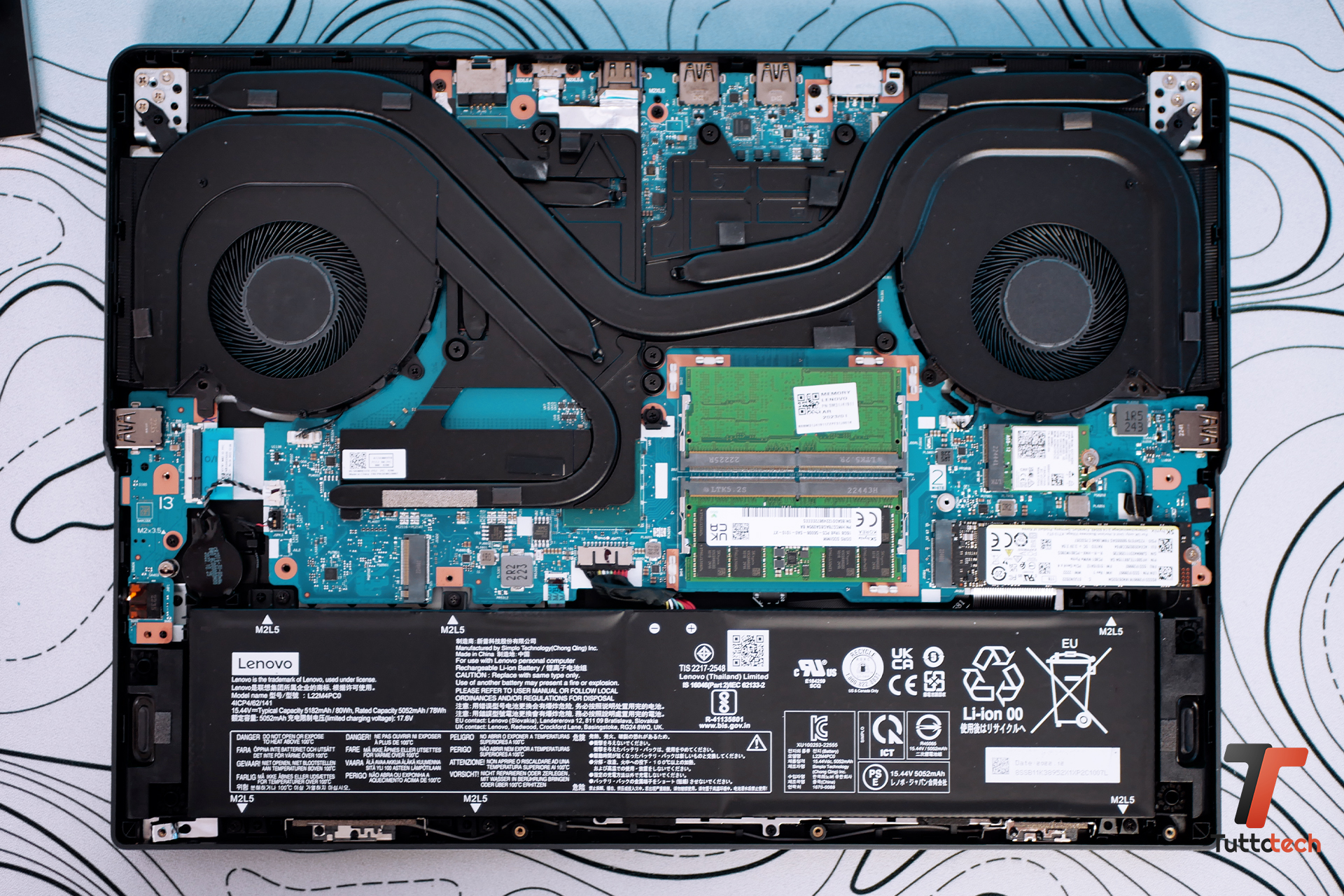 Si smonta con una semplicità disarmante, all’intero un sistema di dissipazione esagerato con ben 4 radiatori, 2 ventole di qualità e delle heat pipe enormi sparse dovunque. Nota di merito per la presenza di più slot SSD M.2 adeguatamente dissipati e per la possibilità di aggiornare o sostituire non solo gli SSD ma anche le RAM SODIMM DDR5 e la scheda Wi-Fi 6E.