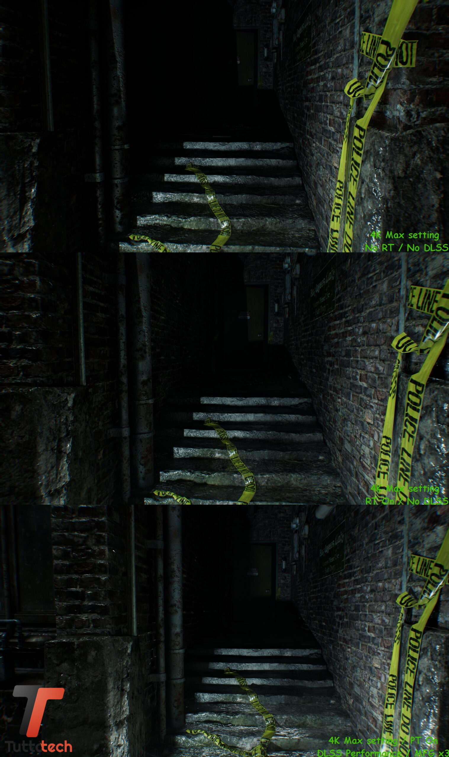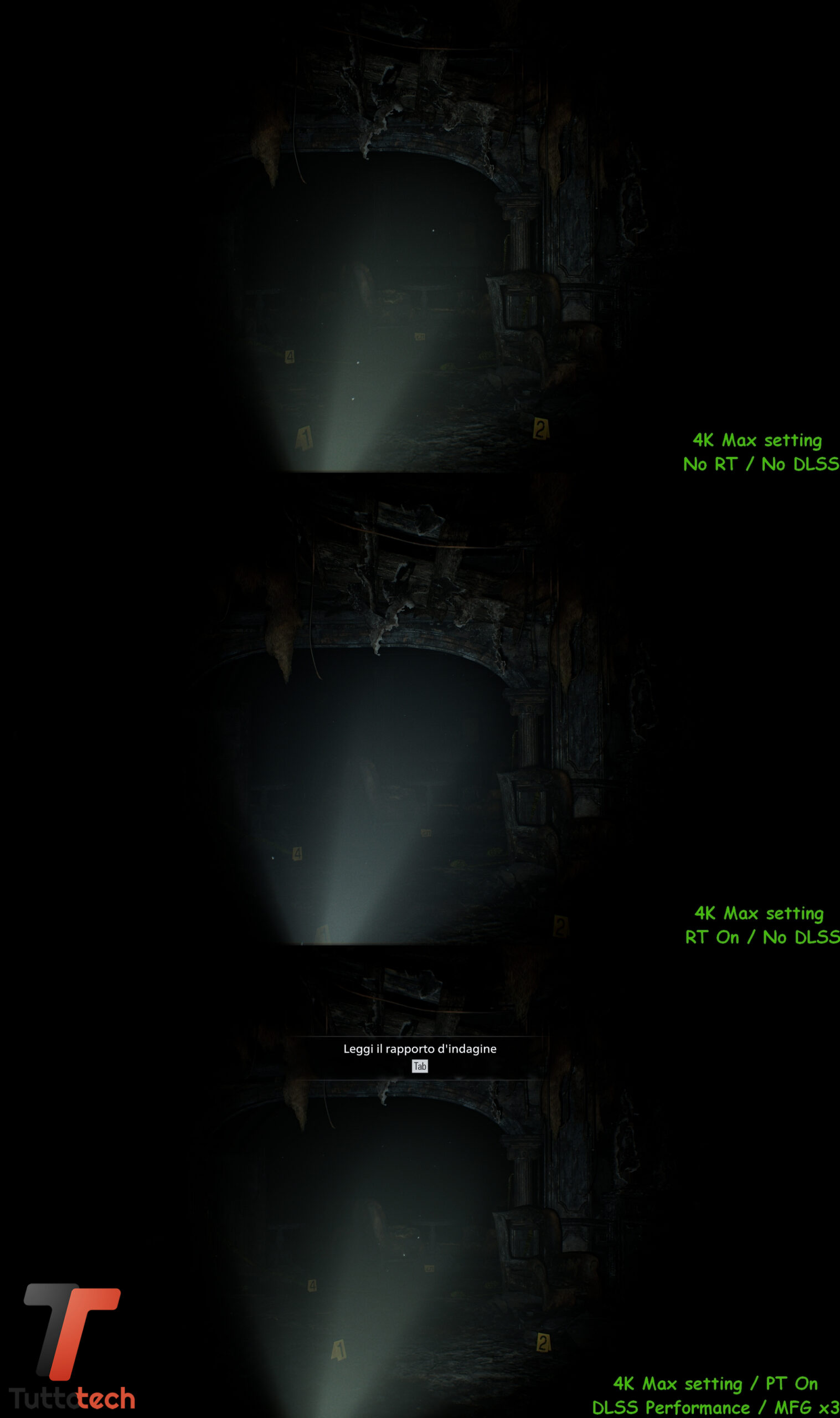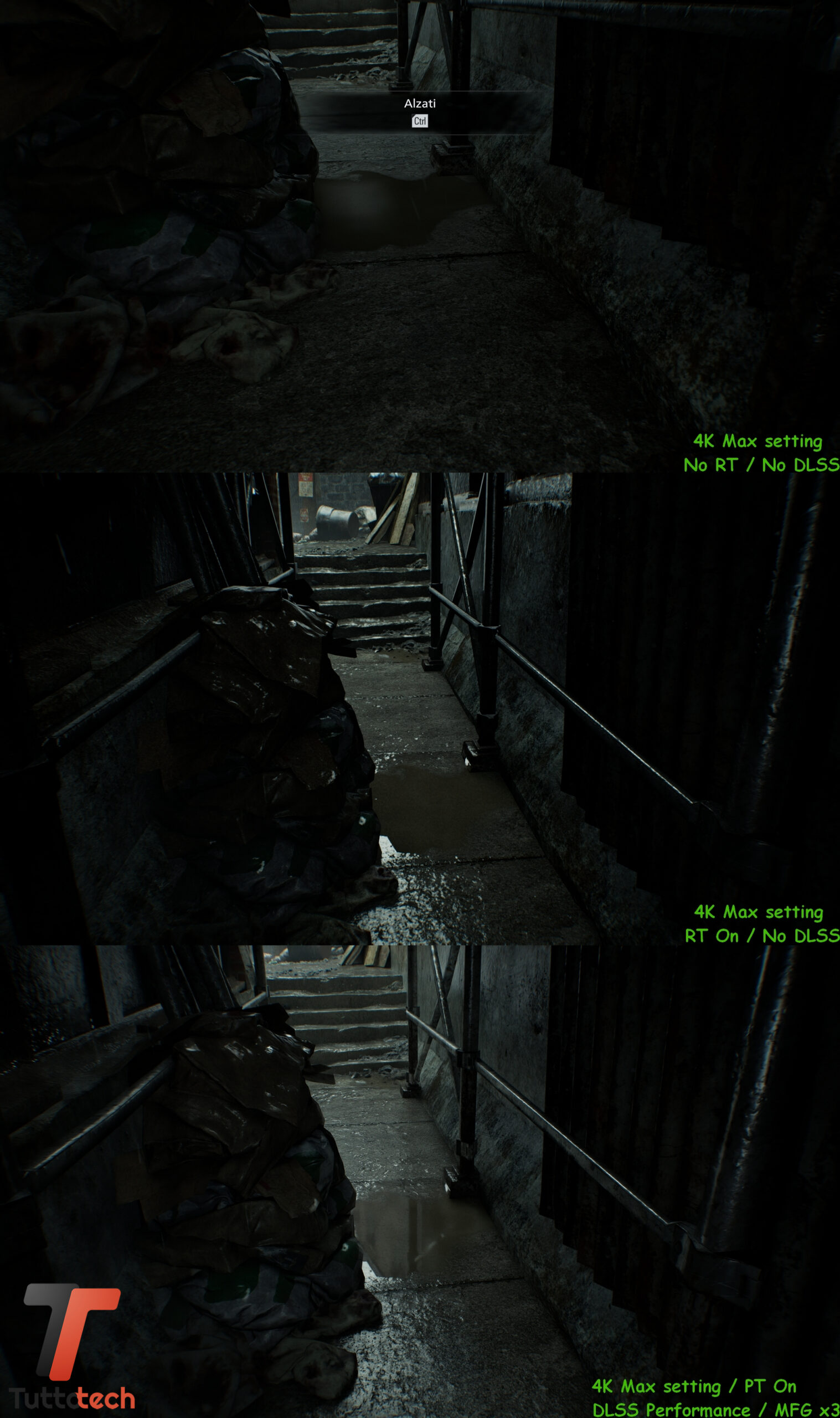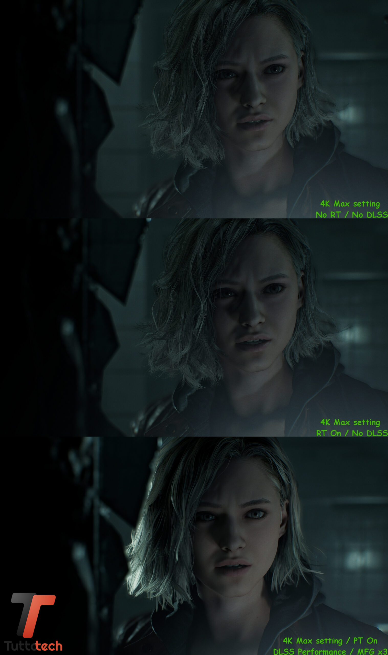 Come anticipato in apertura, non andremo a condividere particolari fasi del gioco visto l’embargo in corso, mentre abbiamo la possibilità di confrontare alcune scene iniziali con tre preset diversi per valutare a occhio le differenze a livello di dettagli tra raster, Ray-Tracing nativo e Path-Tracing / Ray Reconstrction con DLSS e Multi Frame Generation.