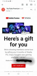Il team di Google, infatti, ha iniziato ad inviare agli utenti iscritti al servizio YouTube Premium un’email contenente un codice promozionale per usufruire di tre mesi di prova di Google Stadia Pro.