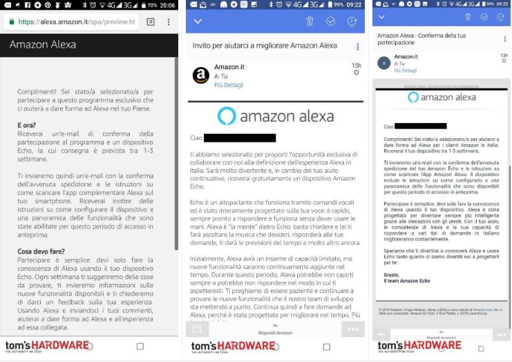 Amazon ha infatti avviato una sorta di beta test apposito per permettere ad alcuni utenti di provare, in anteprima, l’assistente digitale Alexa attraverso degli smart speaker Echo che saranno inviati in maniera gratuita. Non sappiamo sulla base di cosa si viene scelti per testare Alexa ma, fatto sta che i fortunati stanno venendo contattati mediante e-mail.