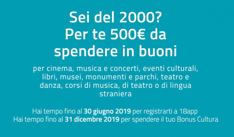 A partire dal 7 gennaio 2019, tutti i cittadini italiani nati nel 2000 possono richiedere, tramite il portale 18app.italia.it e partner verificati, il Bonus Cultura di 500 euro a cura del Ministero dei Beni e delle Attività Culturali e del Turismo. Si tratta di un gradito ritorno che permetterà ai giovani di approfittare di un notevole credito per accedere alla vastissima cultura presente in Italia.