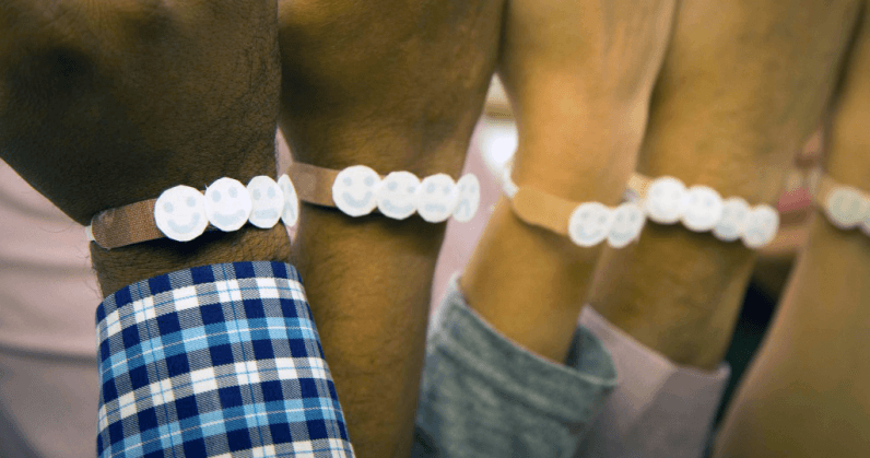 Si tratta di un braccialetto dotato di alcuni piccoli cerchi in cartone bianco, questi a loro volta si contraddistinguono con quattro diverse espressioni, ognuna delle quali è disegnata con lo speciale inchiostro reagente ai raggi UV.