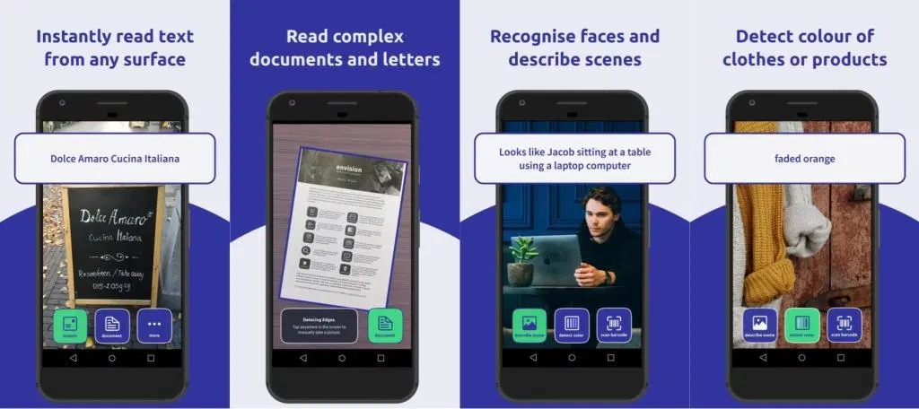 Il software è in grado di riconoscere la segnaletica stradale in oltre 60 lingue e la scrittura manuale. Se queste funzioni sono demandate all’OCR, l’intelligenza artificiale interviene per riconoscere i colori e fornire una descrizione della scena, oltre a interpretare i codici a barre.