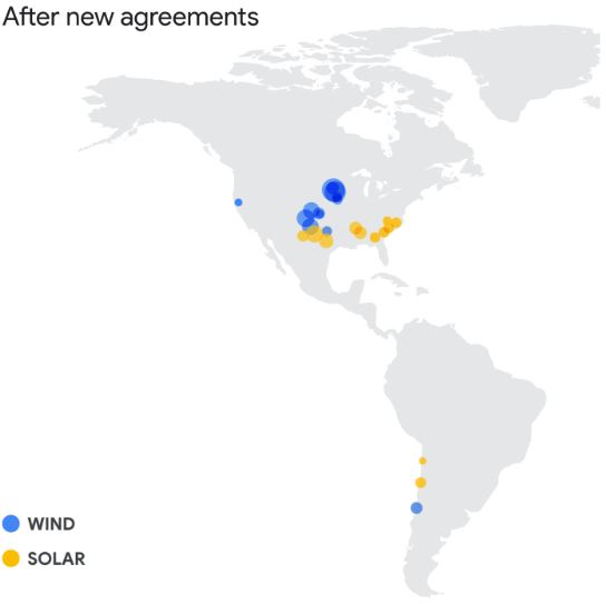 Negli Stati Uniti Google ha comprato 720 MW da fattorie solari sparse tra la Carolina del Nord e del Sud, oltre che in Texas. In Cile invece sono 125 MW, provenienti sia dal solare che dall’eolico, così da poter utilizzare energia pulita per la maggior parte della giornata nei suoi data center, facendo lavorare in tandem i due sistemi.