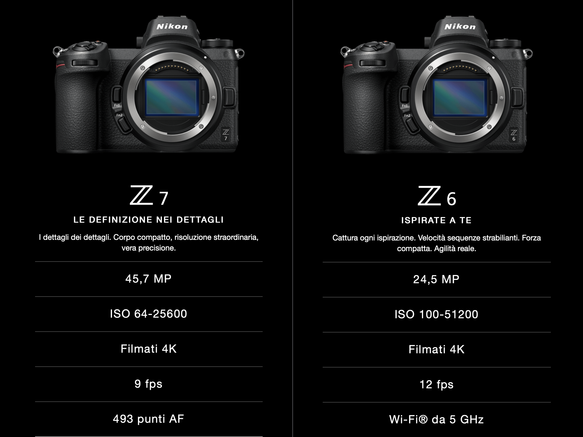 La scelta tra Z6 e Z7 si riduce principalmente al sensore. Sulla Nikon Z6 è presente un sensore full frame da 24,5 MP con sensibilità ISO fino a 51.200 mentre sulla Non Z7 è presente un sensore CMOS BSI da 45,7 megapixel. Il processore di immagini Expeed 6 è lo stesso mentre la Nikon Z7 garantisce autofocus a 493 punti e scatti in raffica da 12 FPS (la Nikon Z6 si ferma a 9 FPS).