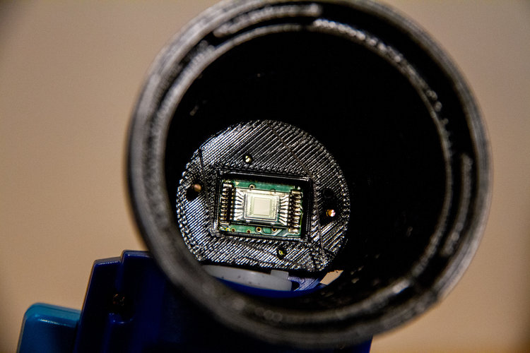 Utilizzando una stampante 3D e la propria dimestichezza con i software di modellazione solida, Ekeler ha creato un adattatore che gli ha permesso di montare un obiettivo Canon 70-2– f4 montato su un extender 1,4X. Considerando che la Game Boy Camera ha un sensore da 3,6 millimetri quadrati, che dovrebbe essere equivalente a un sensore da 1/4″, abbiamo un fattore di crop di 10,81 per una distanza focale massima equivalente di 3.026,8 millimetri.