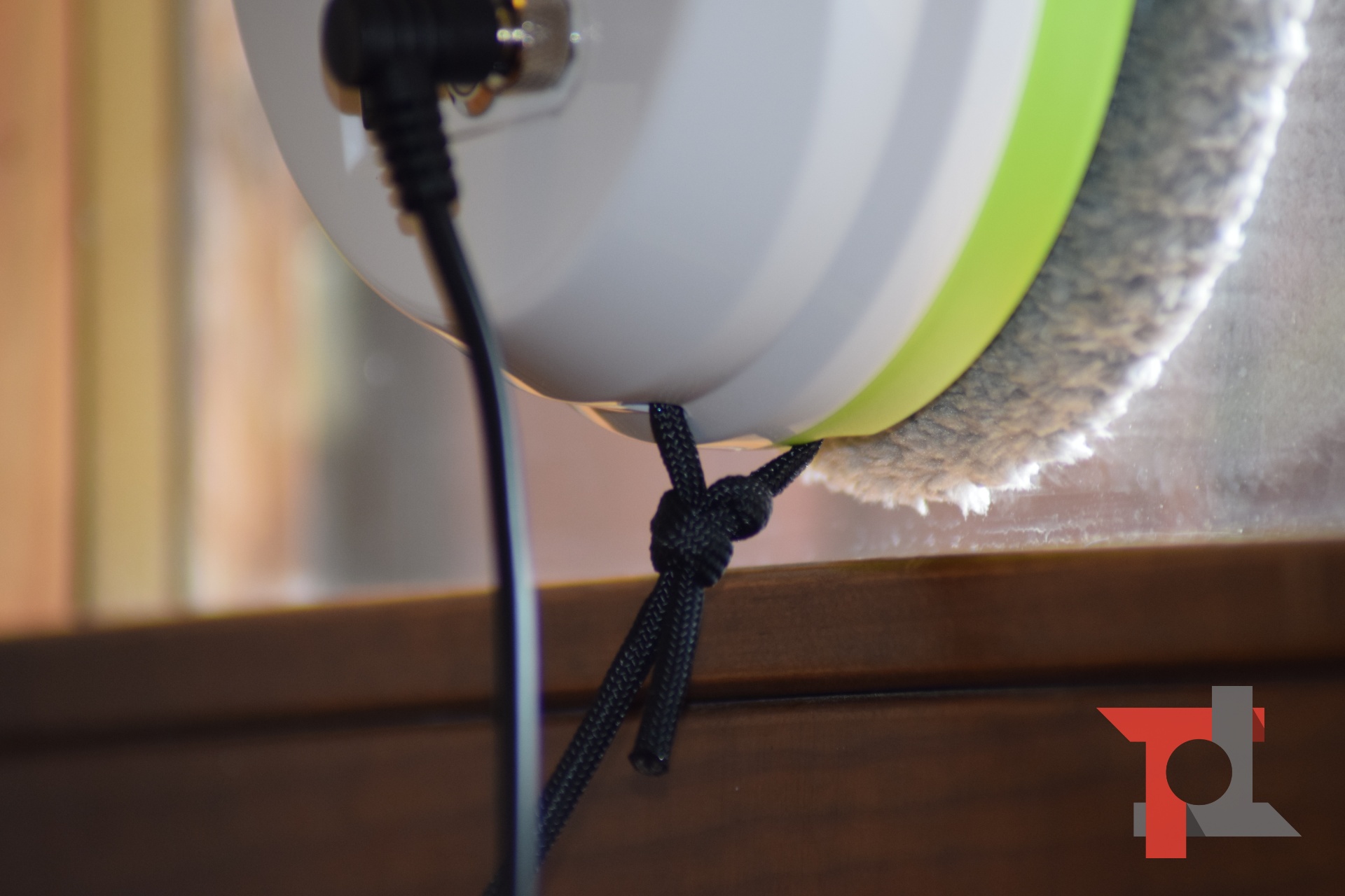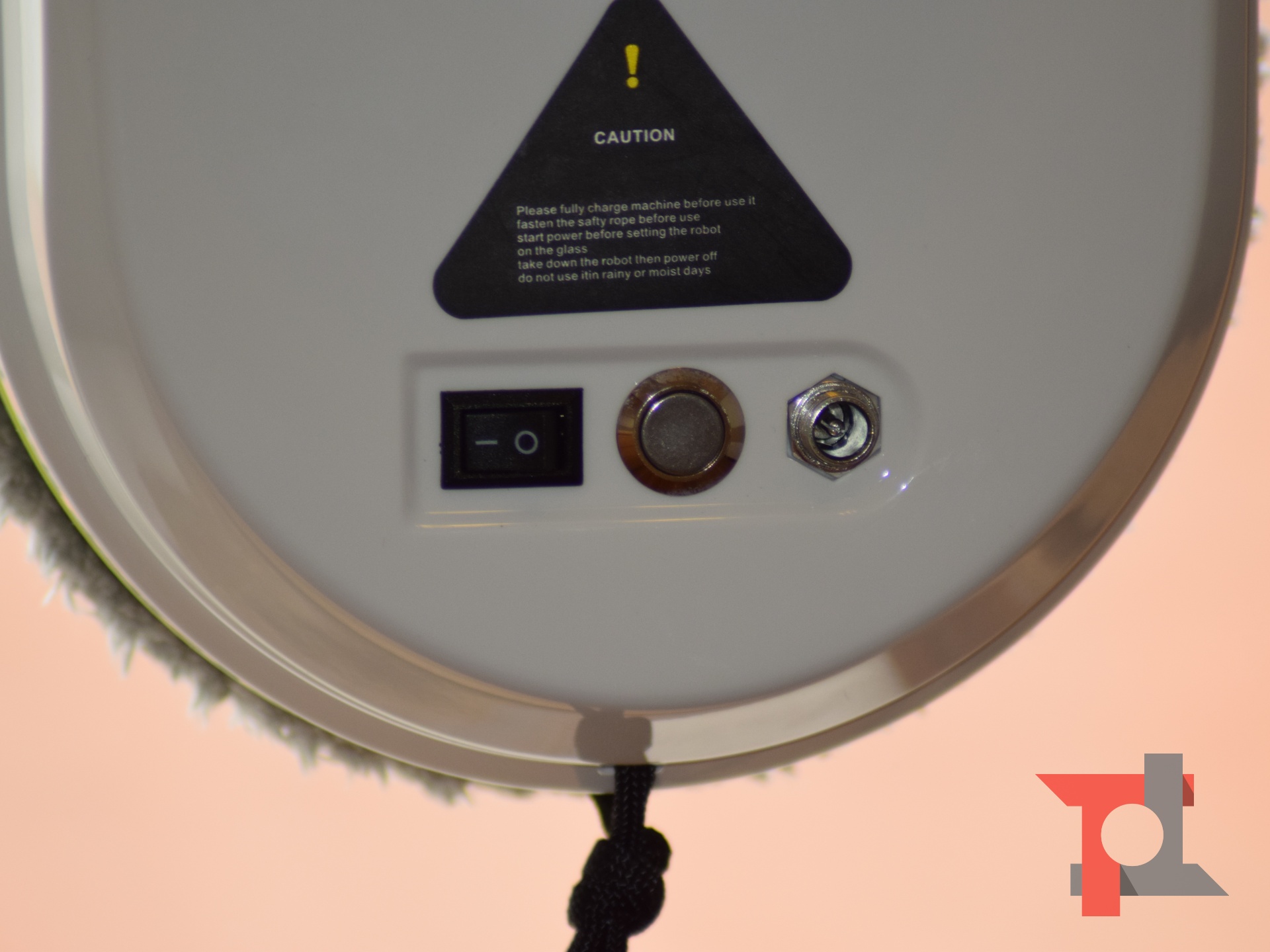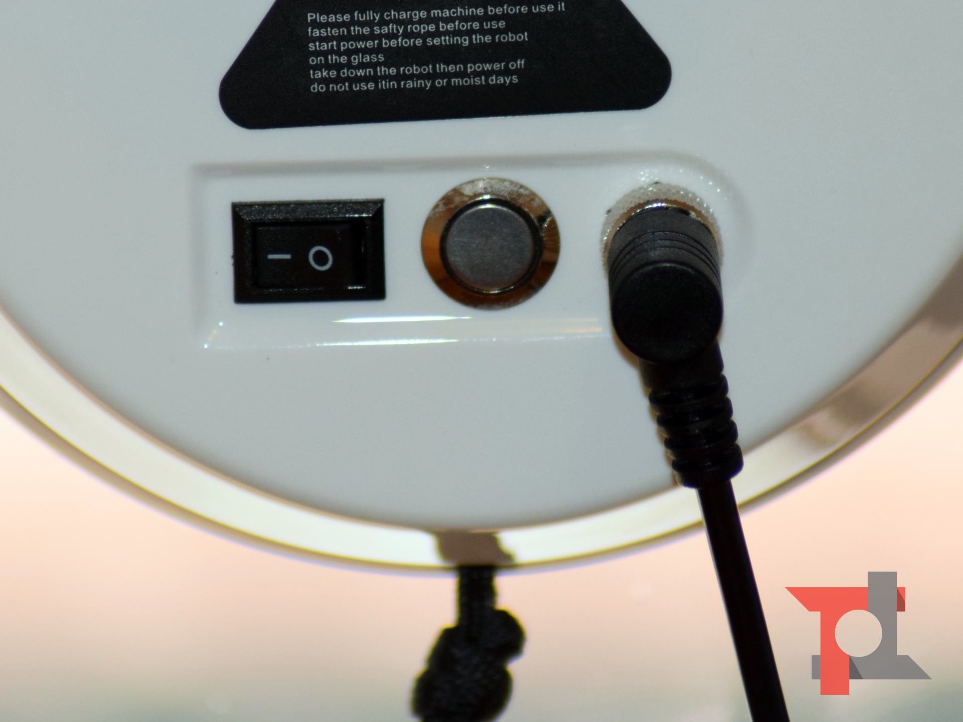 Dopo aver fissato la corda di sicurezza, dovrete collegare il cavo di alimentazione, che è tenuto in posizione da un sistema a vite che ne impedisce lo sgancio. È sufficiente premere il pulsante di accensione e appoggiare il robot al vetro da pulire per vederlo rimanere appeso senza problemi. Ora potrete utilizzare il telecomando o, più semplicemente, premere il pulsante argentato a fianco del tasto di alimentazione.