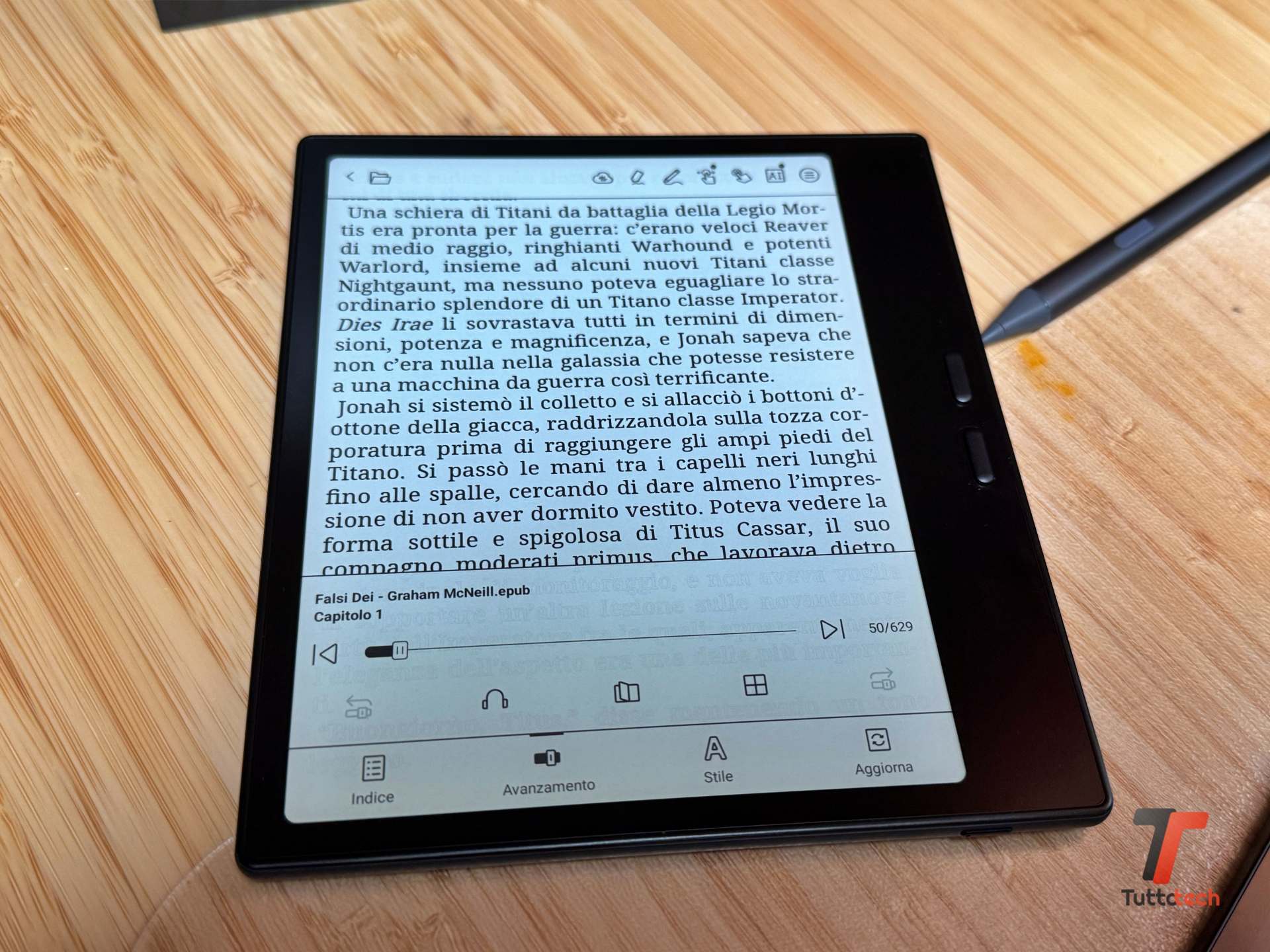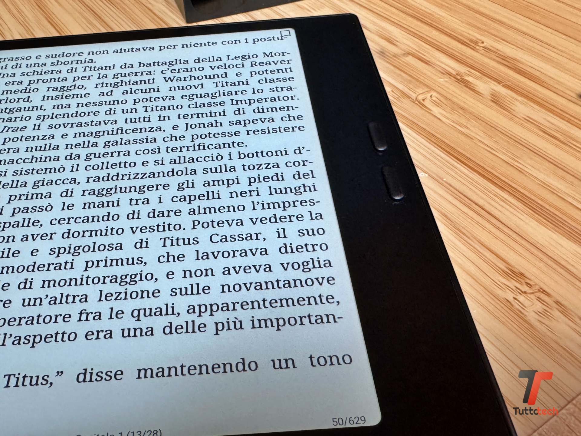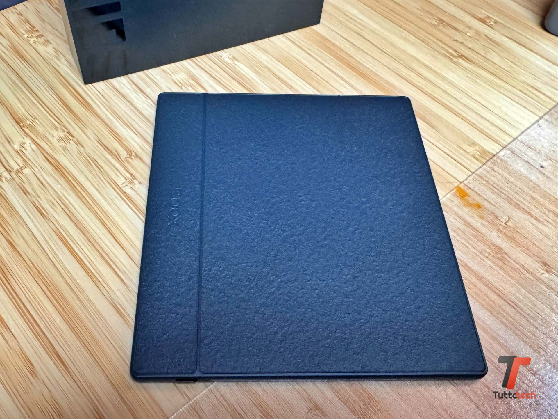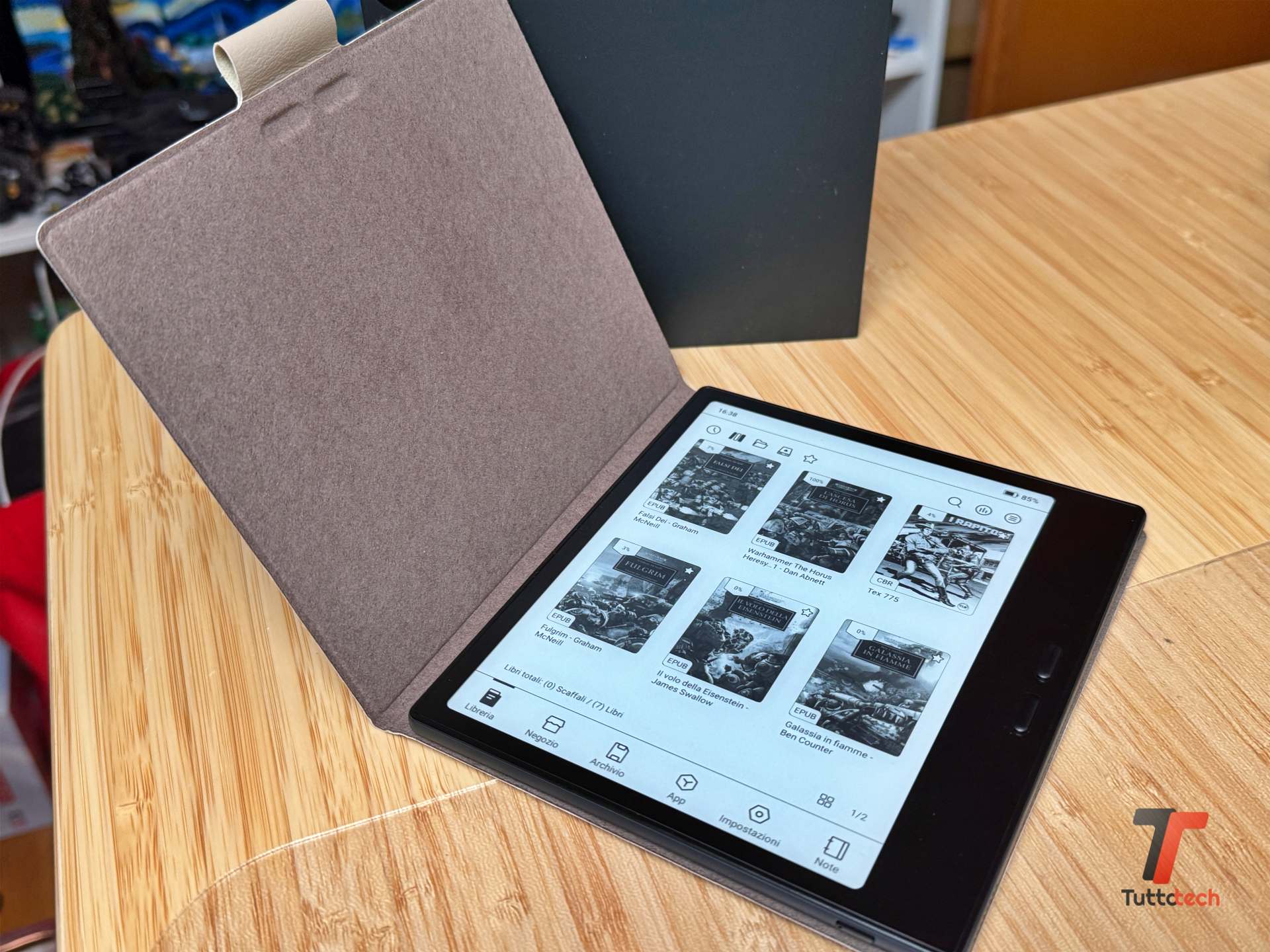 Oltre al pulsante di accensione/spegnimento, posizionato nella parte inferiore del dispositivo, sono presenti due tasti sul lato destro dello schermo, da utilizzare per cambiare pagina. Questo significa inevitabilmente un design asimmetrico delle cornici, una scelta che comunque favorisce in maniera molto piacevole l’ergonomia. È presente sul lato destro una presa USB-C per la ricarica e la connessione a un computer, con supporto OTG e la possibilità di collegare, tramite un apposito adattatore, anche un paio di cuffie con jack da 3,5 millimetri.