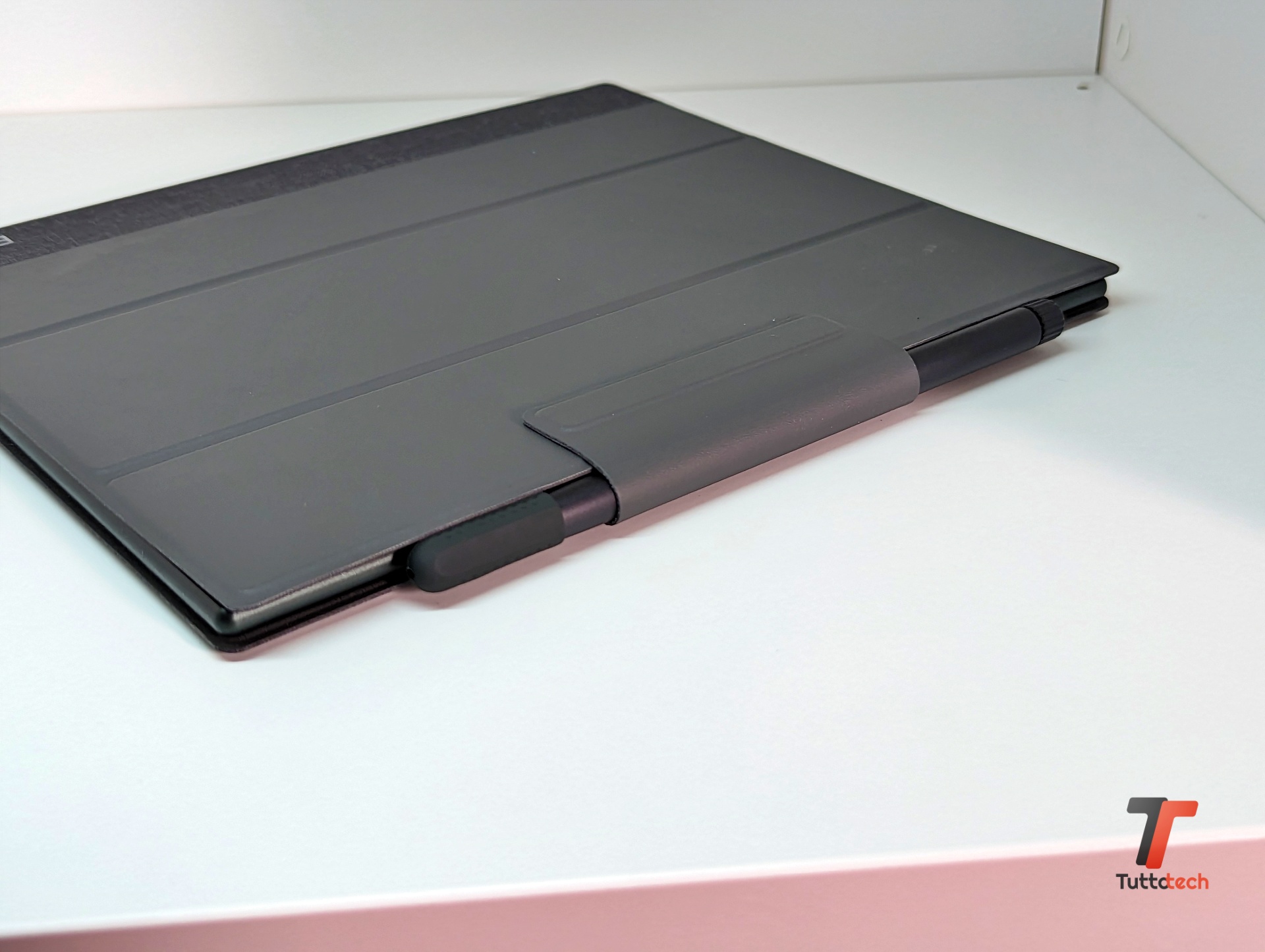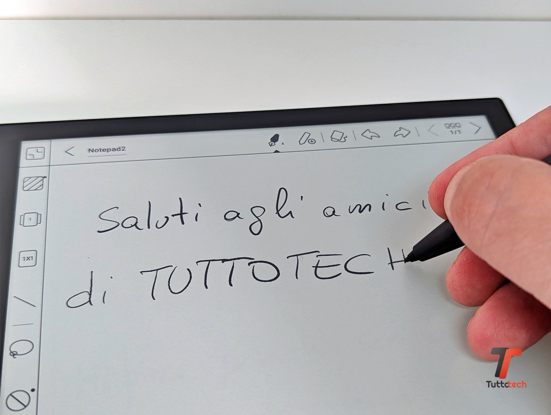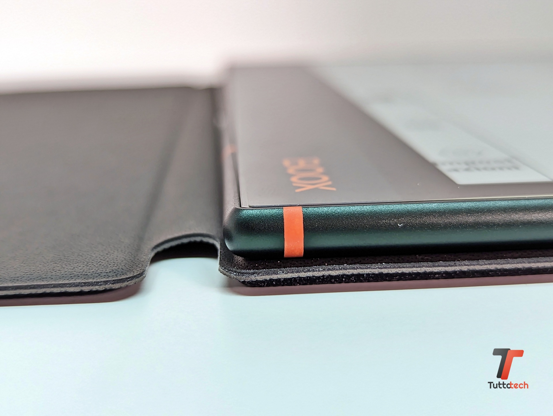 L’esperienza di scrittura, dal canto suo, è quanto di più realistico si possa avere. La penna che scorre sul particolare vetro Asahi, fa un suono molto simile a quello di una penna a punta morbida sulla carta, con una sensazione davvero molto piacevole anche all’udito. La punta della penna è realizzata con un materiale morbido soggetto a usura nel tempo, e può essere sostituita utilizzando gli appositi ricambi in vendita sullo store ufficiale del produttore. La penna poi si aggancia magneticamente al lato destro dell’e-reader e se acquistate anche la custodia magnetica verrà tenuta al sicuro dalla fascia che chiude la cover, per evitare di perderla accidentalmente. Nella confezione di vendita è comunque presente una Penna normale per iniziare a scrivere fin da subito.