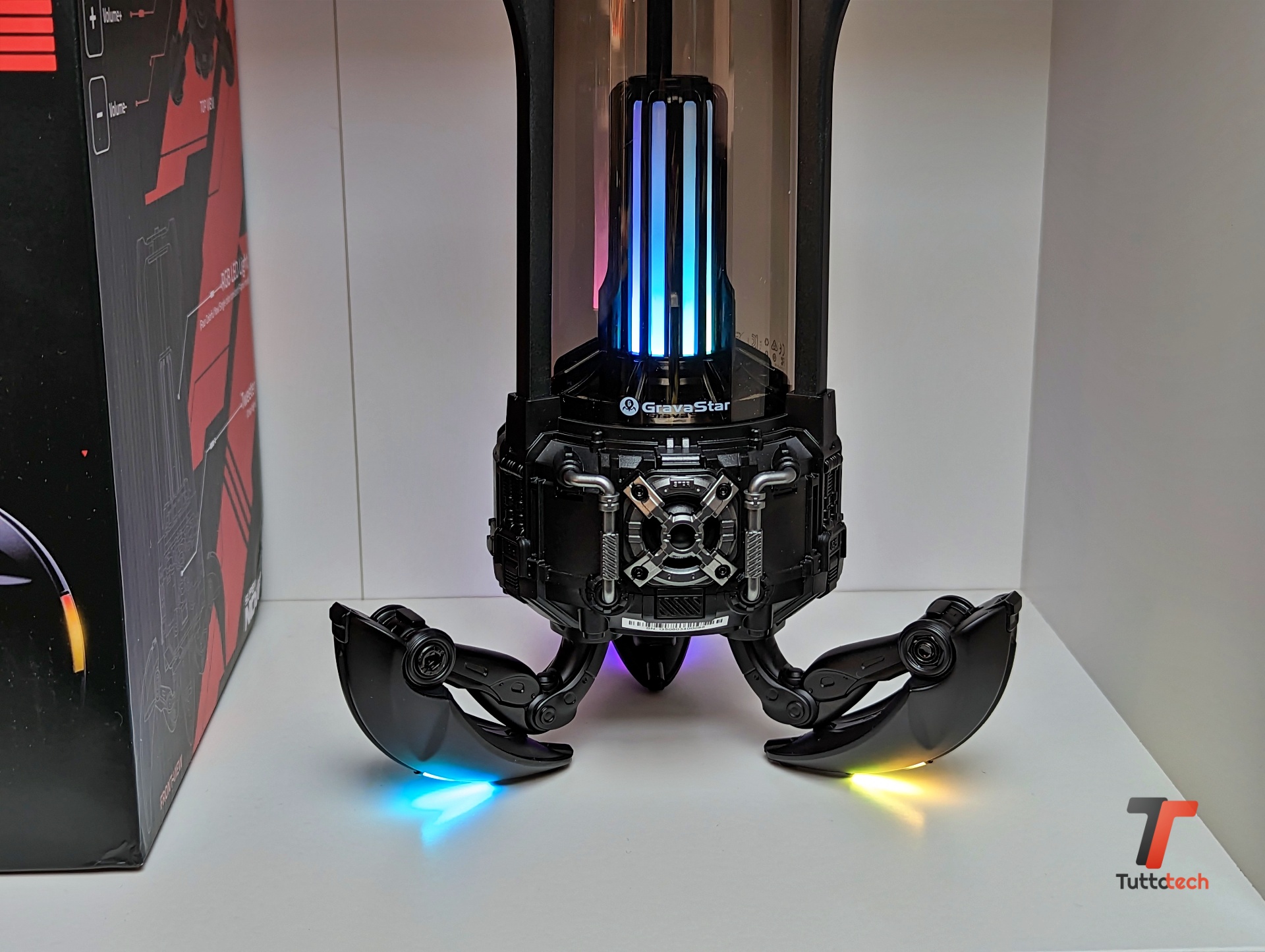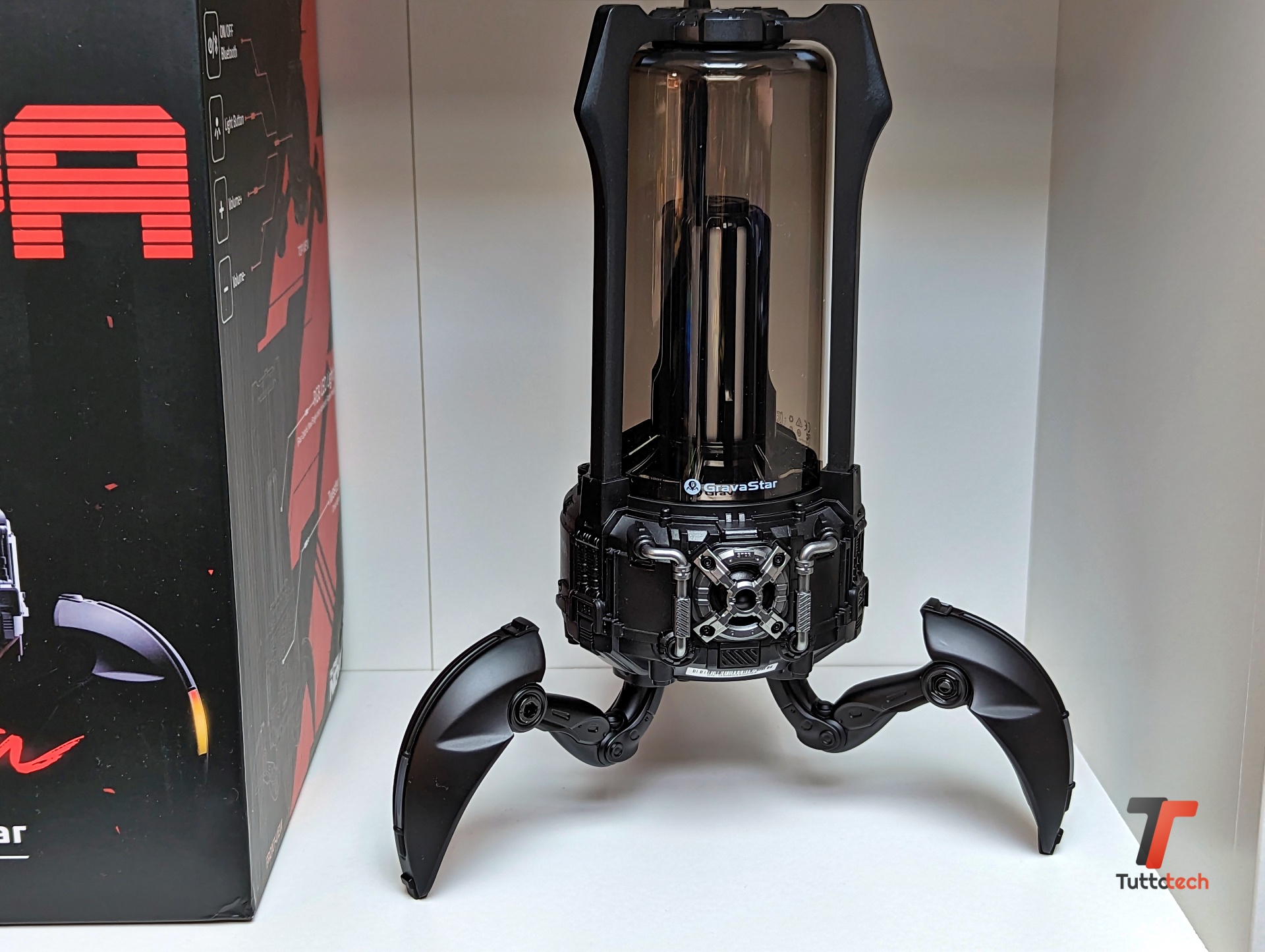 Da grande appassionato del genere sci-fi non posso che apprezzare il design di GravaStar Supernova, che nella parte bassa riprende un elemento che avevo apprezzato anche in Mars Pro (qui la nostra recensione completa). Mi riferisco alle tre zampe richiudibili, che ricordano decisamente quelle di un ragno, che permettono di avere un sopporto stabile, quando aperte, per lo speaker. Se preferite tenerle chiuse Supernova sarà decisamente più ballerino e decisamente più sensibile agli urti che potrebbero farlo cadere.