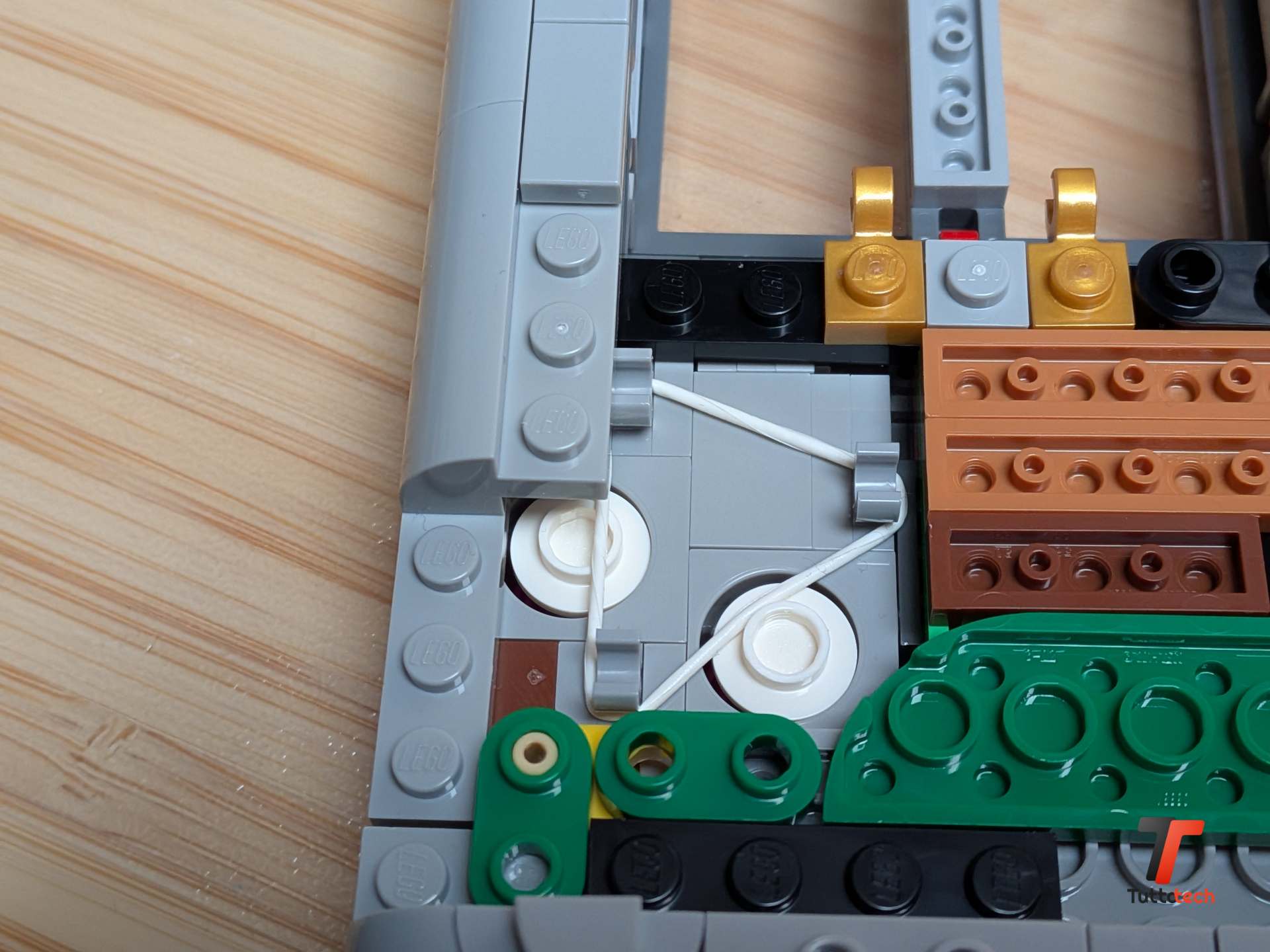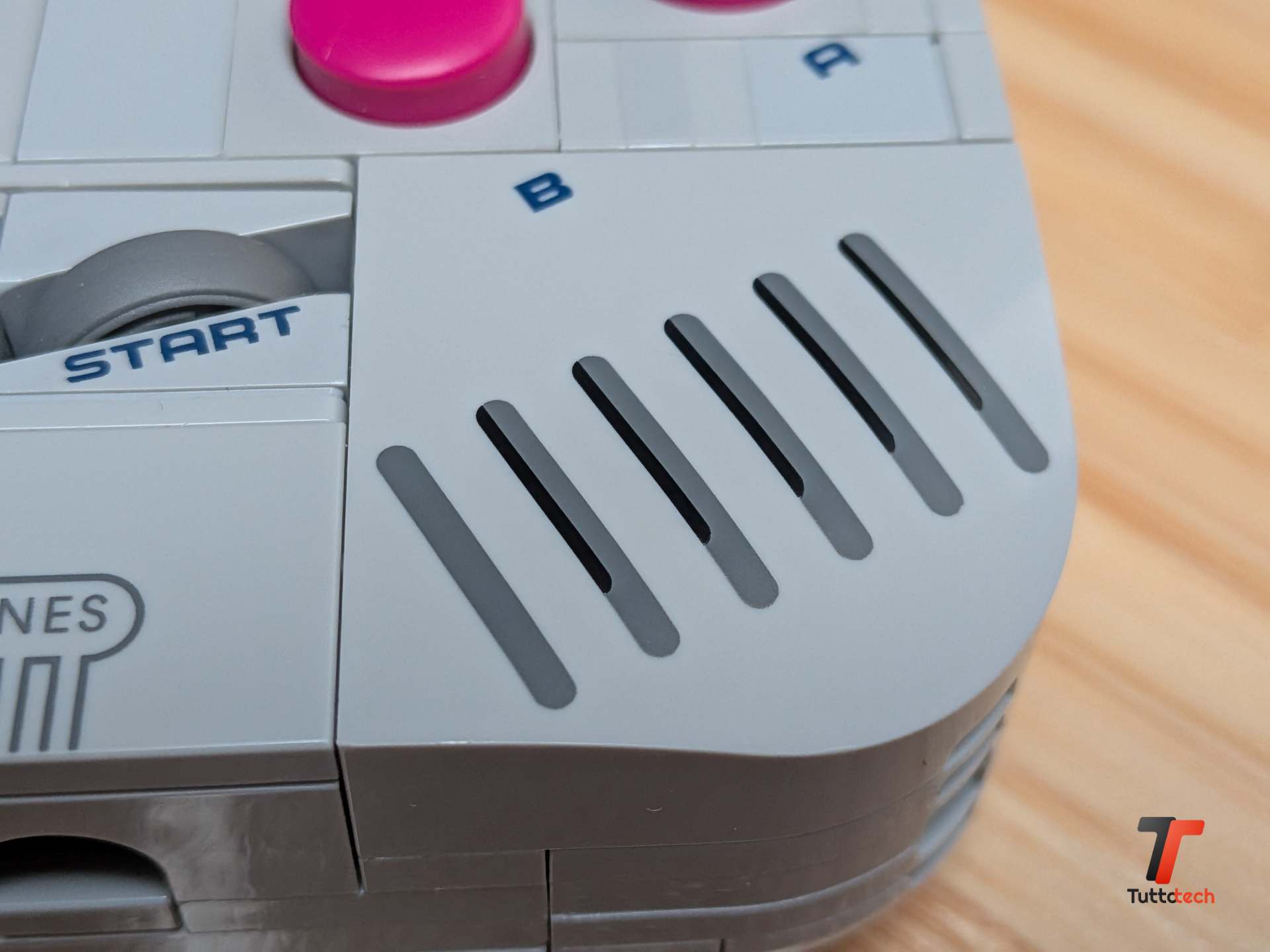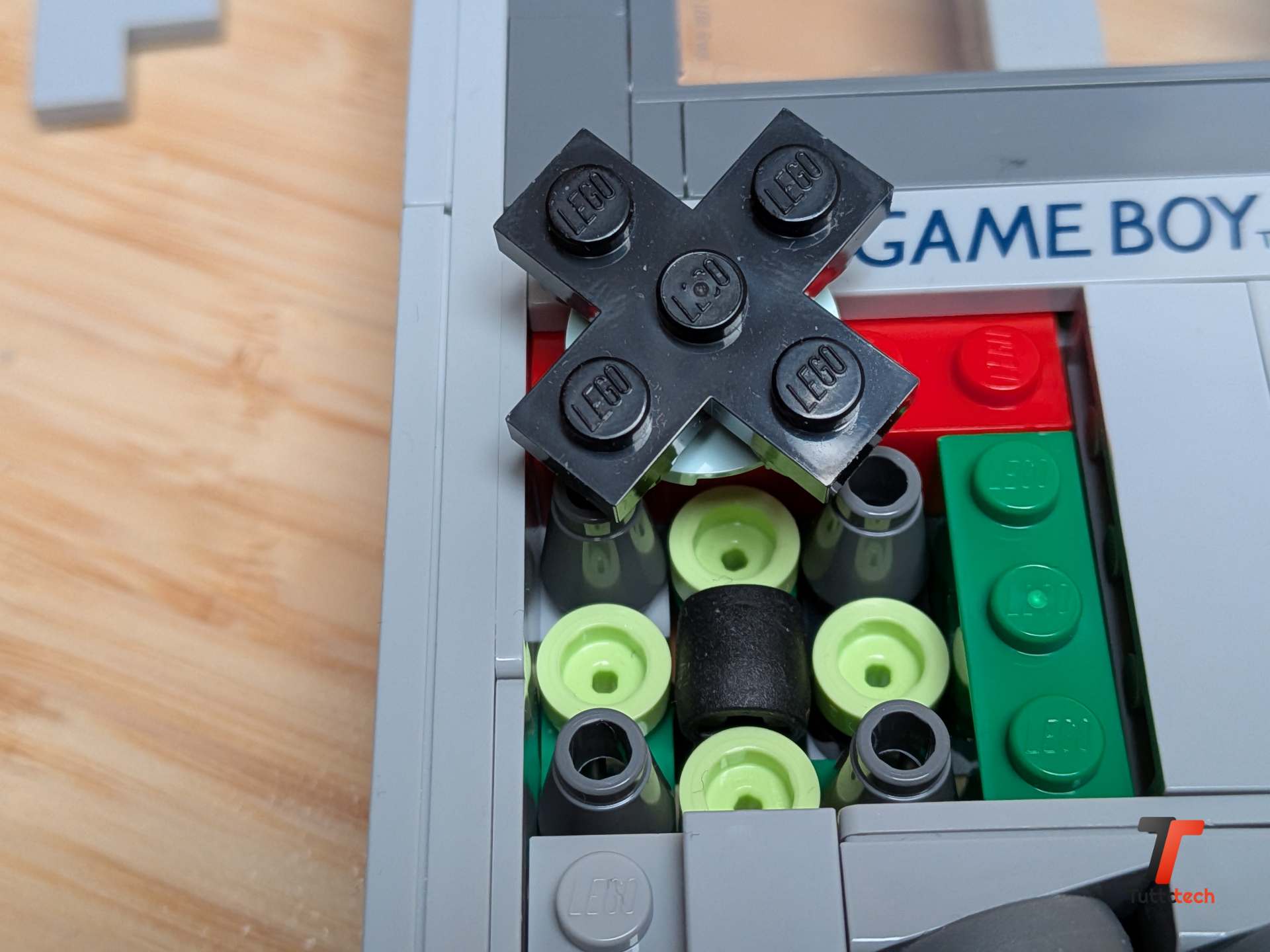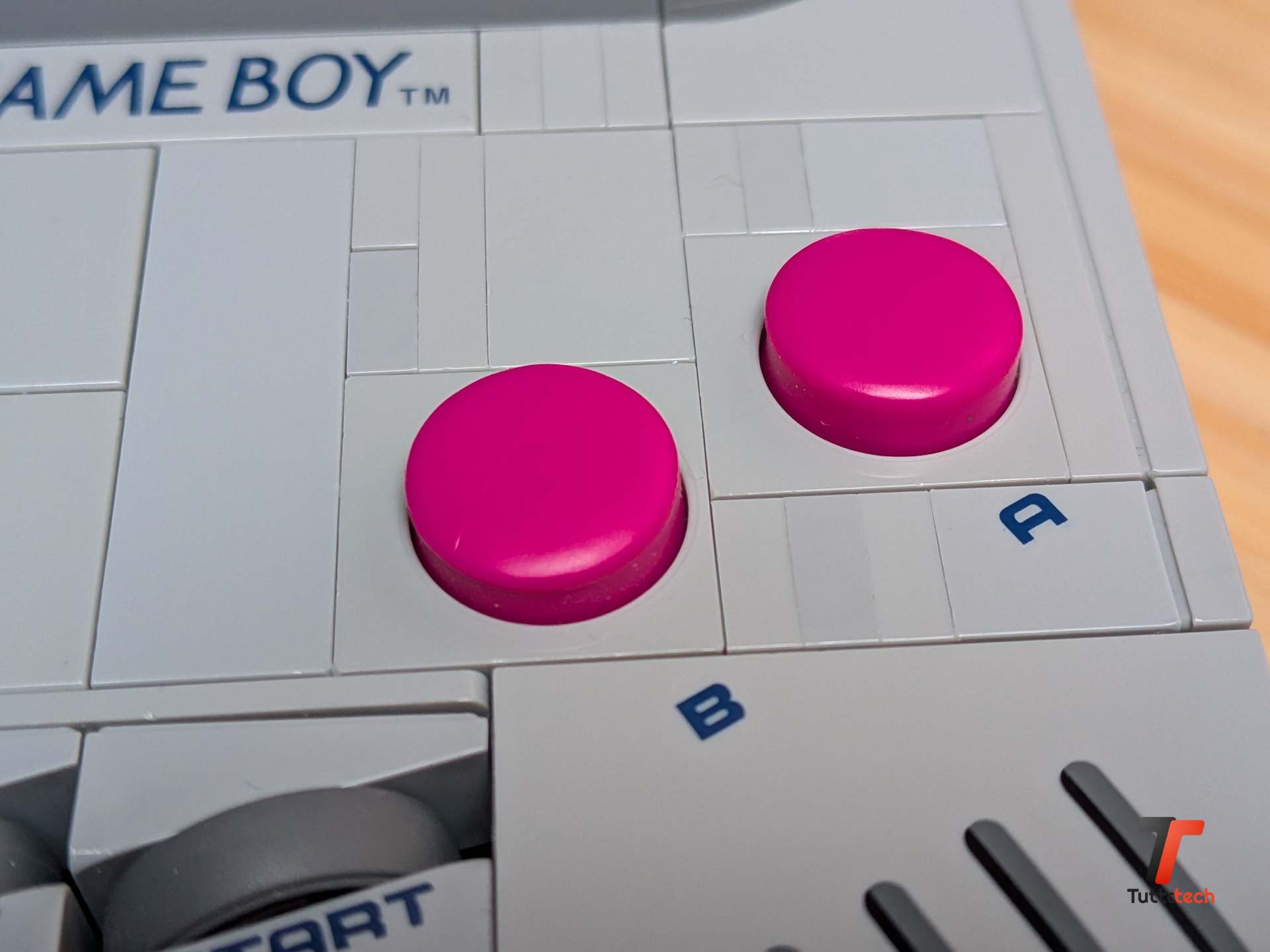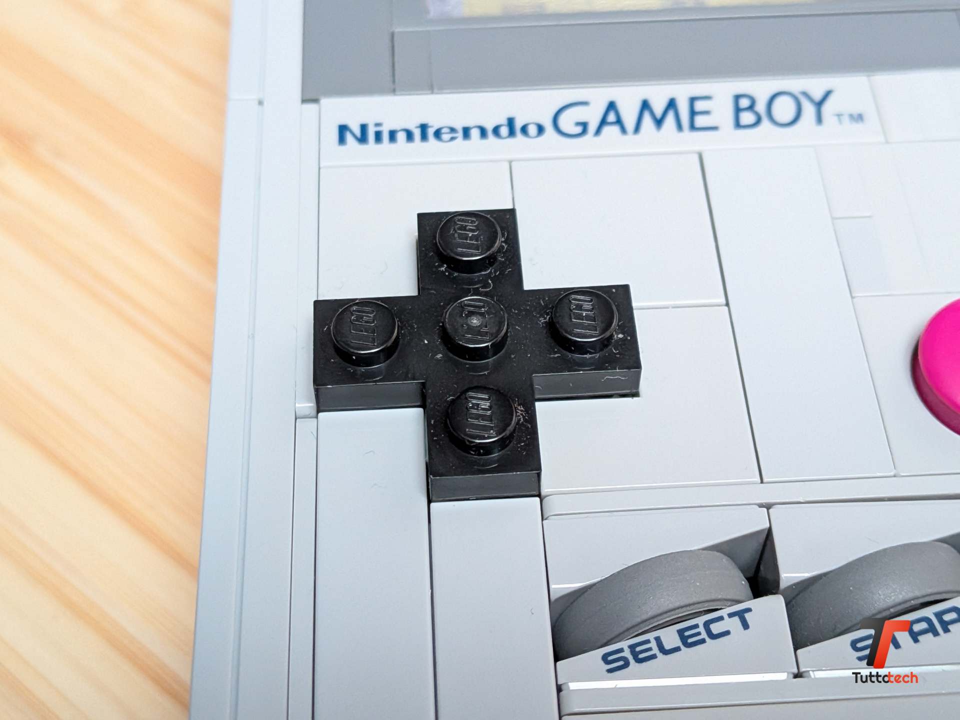 Ma è quando inizi a toccare il modello che capisci davvero quanto lavoro sia stato fatto. Il D-pad non è un pezzo statico incollato alla scocca: si muove davvero in tutte le direzioni grazie a un piccolo pezzo in gomma posizionato sotto che gli permette di oscillare proprio come l’originale. I pulsanti A e B, realizzati con cappelli di minifigure colorati di magenta, sono collegati a un elastico interno che li fa tornare in posizione dopo ogni pressione. Anche i minuscoli pulsanti Start e Select, fatti con piccoli pneumatici LEGO del 1969 ricolorati in grigio, sono premibili e offrono una resistenza sorprendentemente simile a quella che ricordavamo.