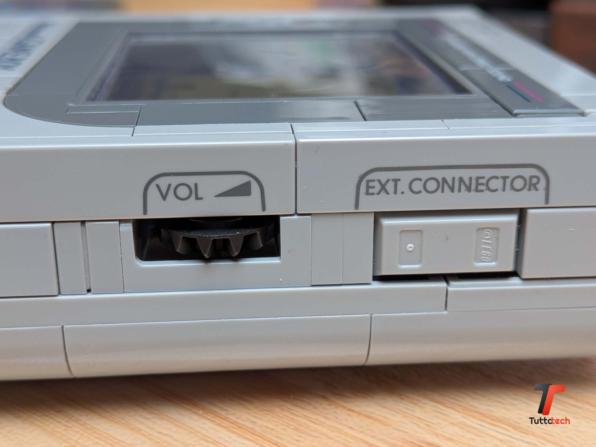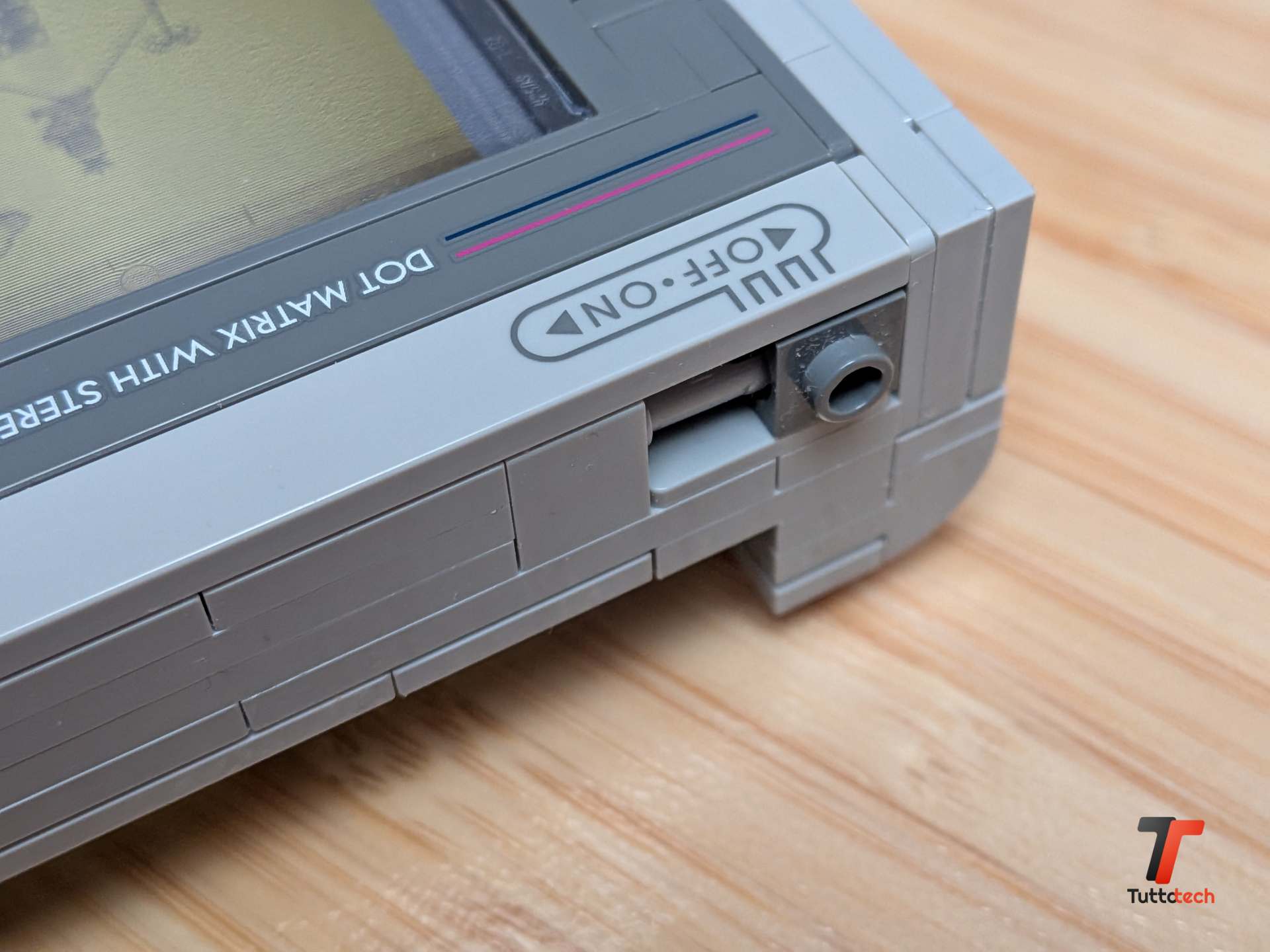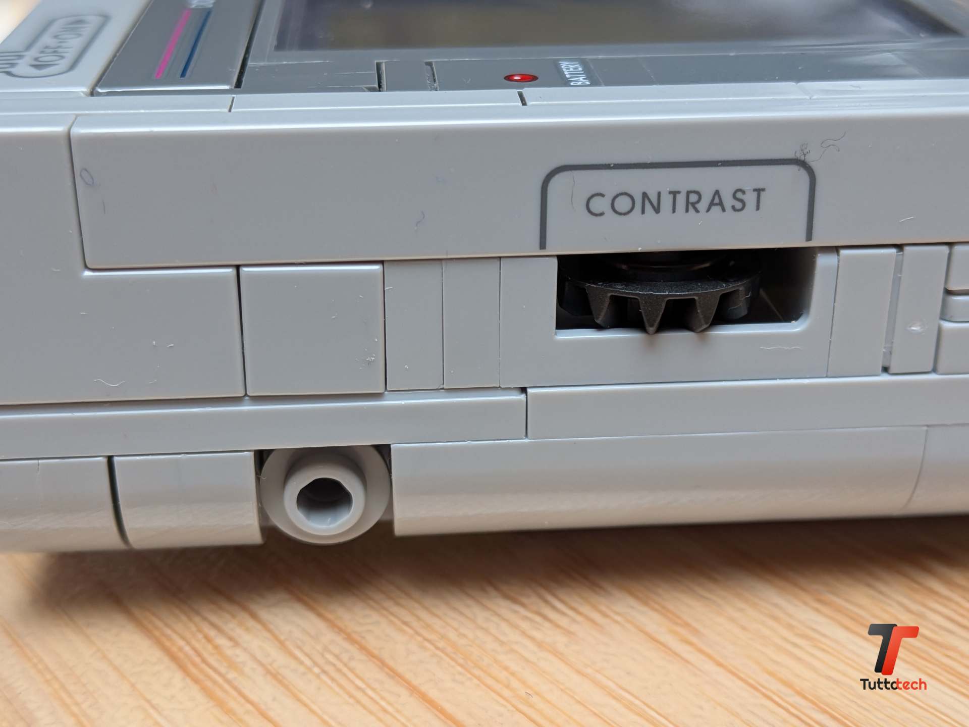 Sul lato sinistro troviamo la rotella del volume che gira davvero, e la porta Ext Link chiusa con un elemento grigio che ci ha fatto sorridere: quante ore abbiamo passato con quel cavo collegato al Game Boy di un amico per scambiarci Pokémon o sfidarci a Tetris? Sul lato destro c’è la rotella del contrasto, quella che regolavamo ossessivamente cercando l’angolazione perfetta per vedere bene lo schermo sotto il sole. In alto, l’interruttore di accensione scorre con la giusta resistenza, e dietro c’è lo sportello delle batterie con le griglie che imitano la texture che ricordavamo così bene. Ogni dettaglio funziona, ogni interruttore si muove, e questo trasforma il set da semplice modello statico a oggetto interattivo che ti invita continuamente a toccarlo.