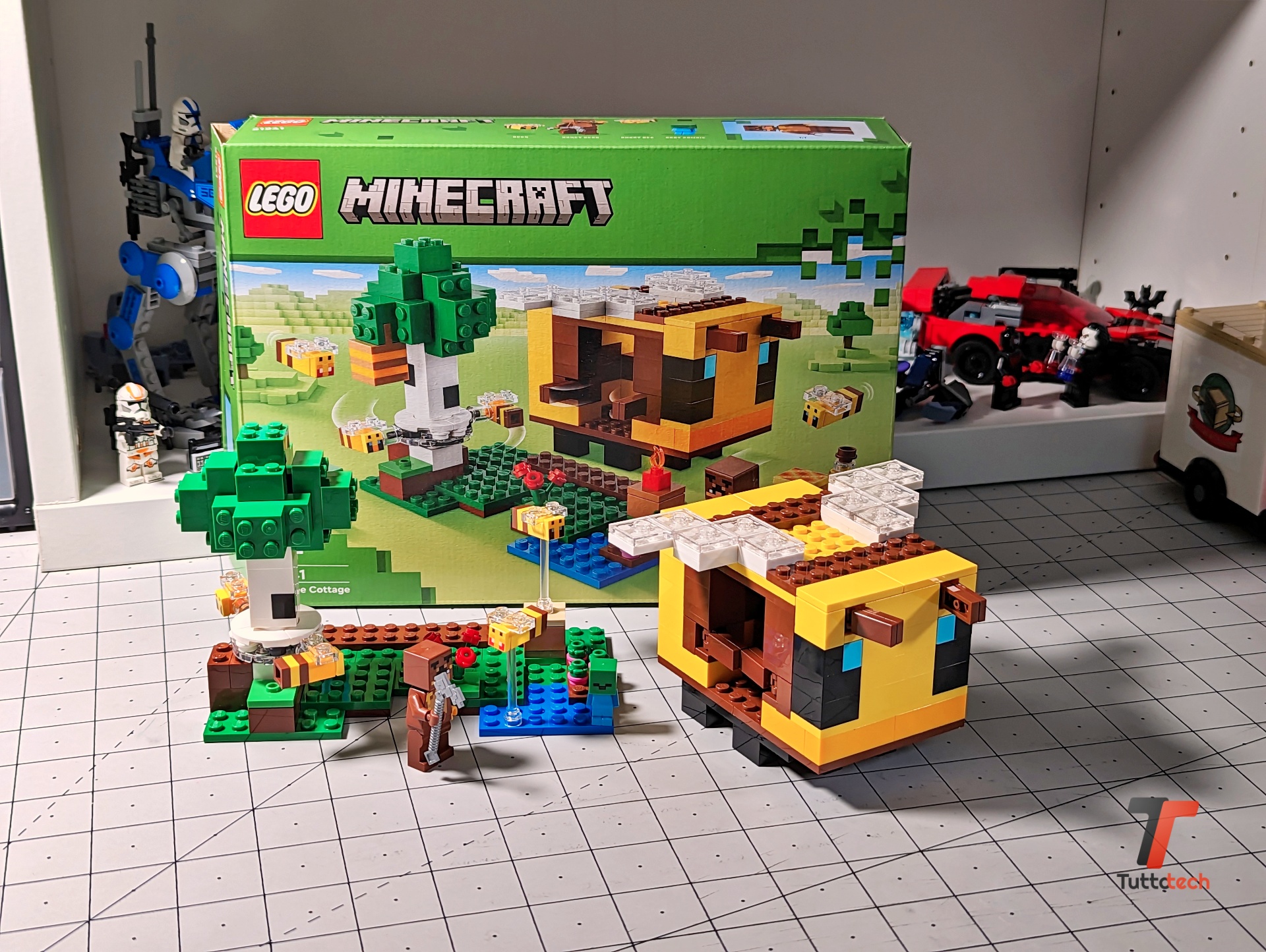 Le due buste presenti nella confezione di vendita permettono di realizzare i due elementi principali che compongono il set. Il primo infatti contiene i mattoncini per costruire il terreno su cui è presente un albero con un nido di api, protetto da due api arrabbiate che fanno la guardia. Il secondo invece consente di costruire il cottage vero e proprio, realizzato con i colori e le forme (ovviamente a 8 bit) di un’ape.