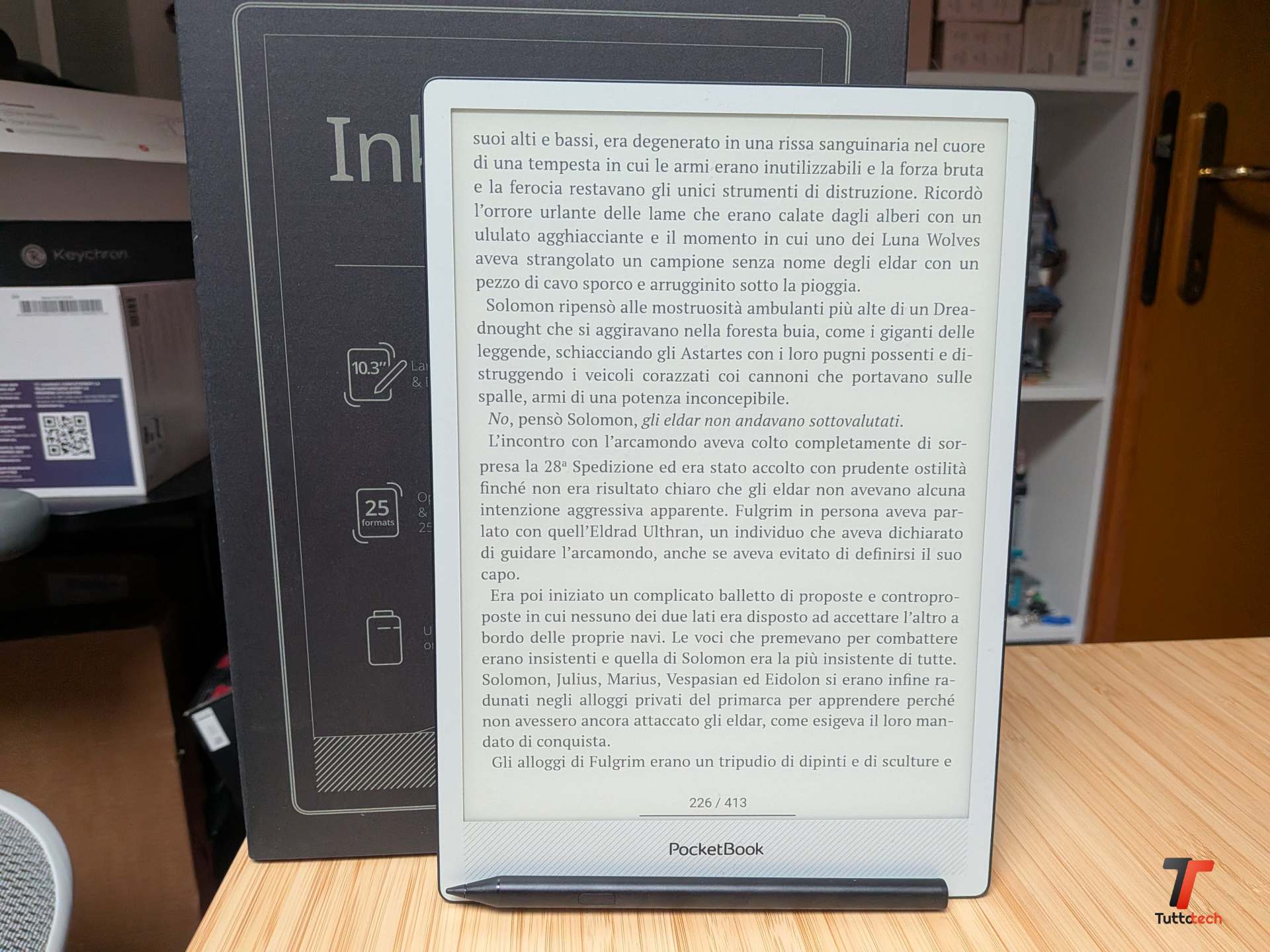 Una parola sulla risoluzione: 226 ppi sono leggermente al di sotto dei 300 ppi che molti competitor offrono su schermi più piccoli, e questo fatto tende a emergere nei confronti su carta. Nella pratica, sull’area di questo schermo la differenza percepita è minima. Il testo è nitido, confortevole e leggibile anche su font di dimensioni ridotte. Chi è particolarmente sensibile a questa metrica potrebbe notare una differenza rispetto ai pannelli più densi, ma la grande maggioranza dei lettori, nelle nostre sessioni di prova, non ha avvertito alcun disagio.