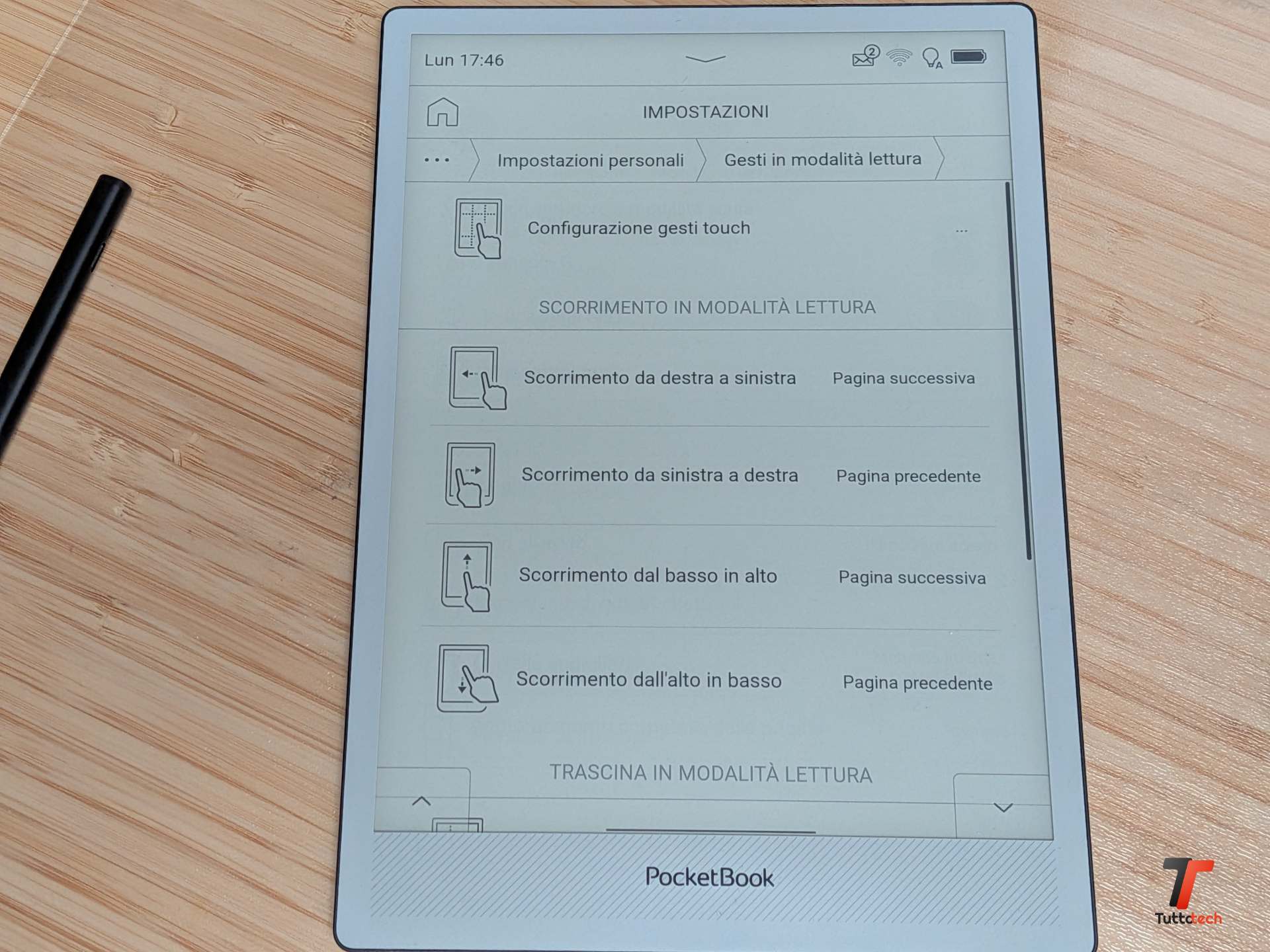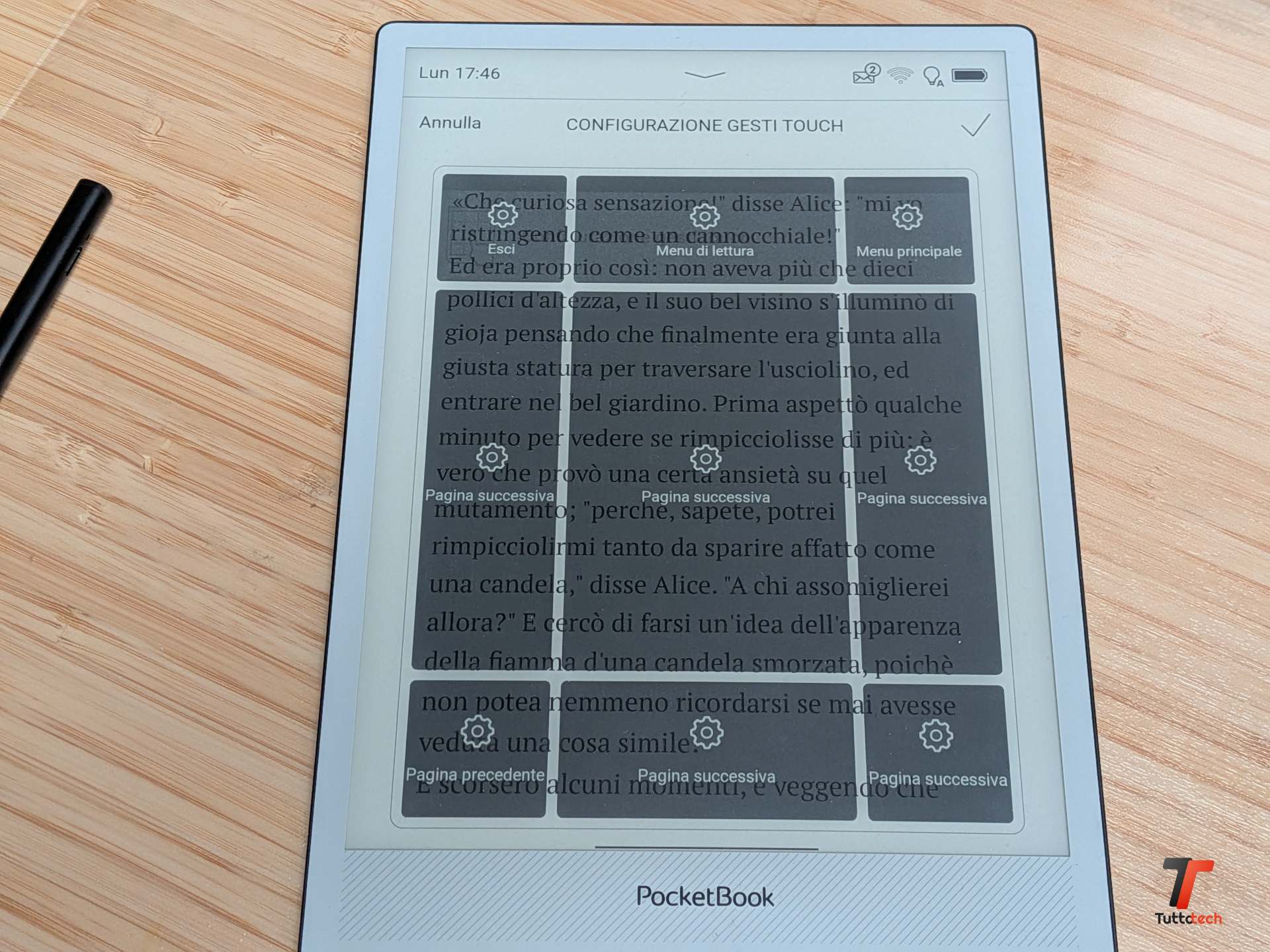 PocketBook permette di mappare liberamente i gesti e le aree di tocco: si può decidere quale zona del display fa avanzare pagina, quale torna indietro, quale apre il menu principale, quale richiama le impostazioni di lettura. Un lettore che tiene il dispositivo con la mano sinistra può configurare i controlli in modo completamente diverso da chi lo usa con la destra, e chi preferisce navigare con gesture rapide può farlo senza dover accettare compromessi imposti dal software. Questa libertà, apparentemente un dettaglio, nella pratica significa che ogni lettore può costruire un’esperienza calibrata sulle proprie abitudini invece di adattarsi a quelle previste dal produttore.