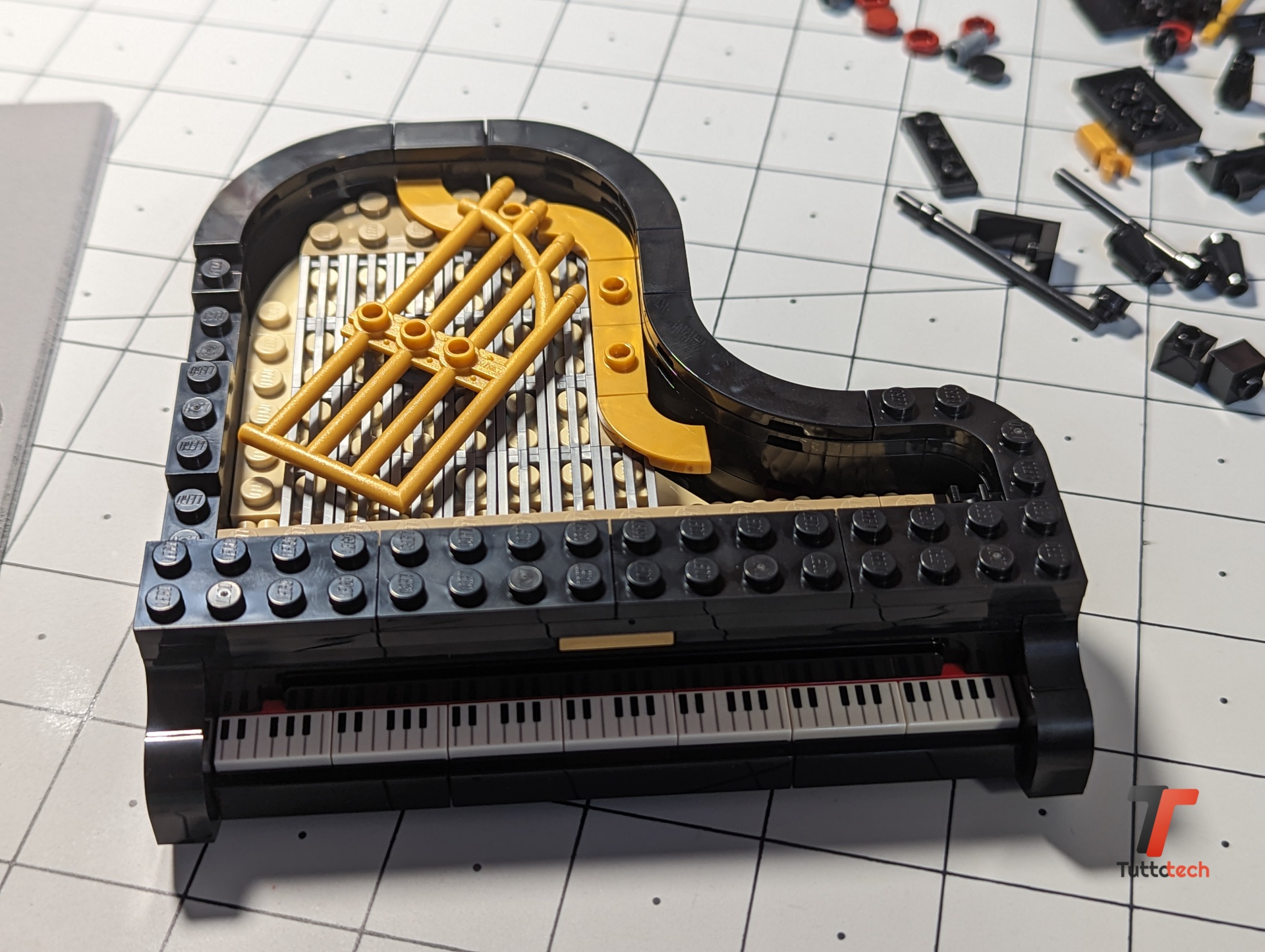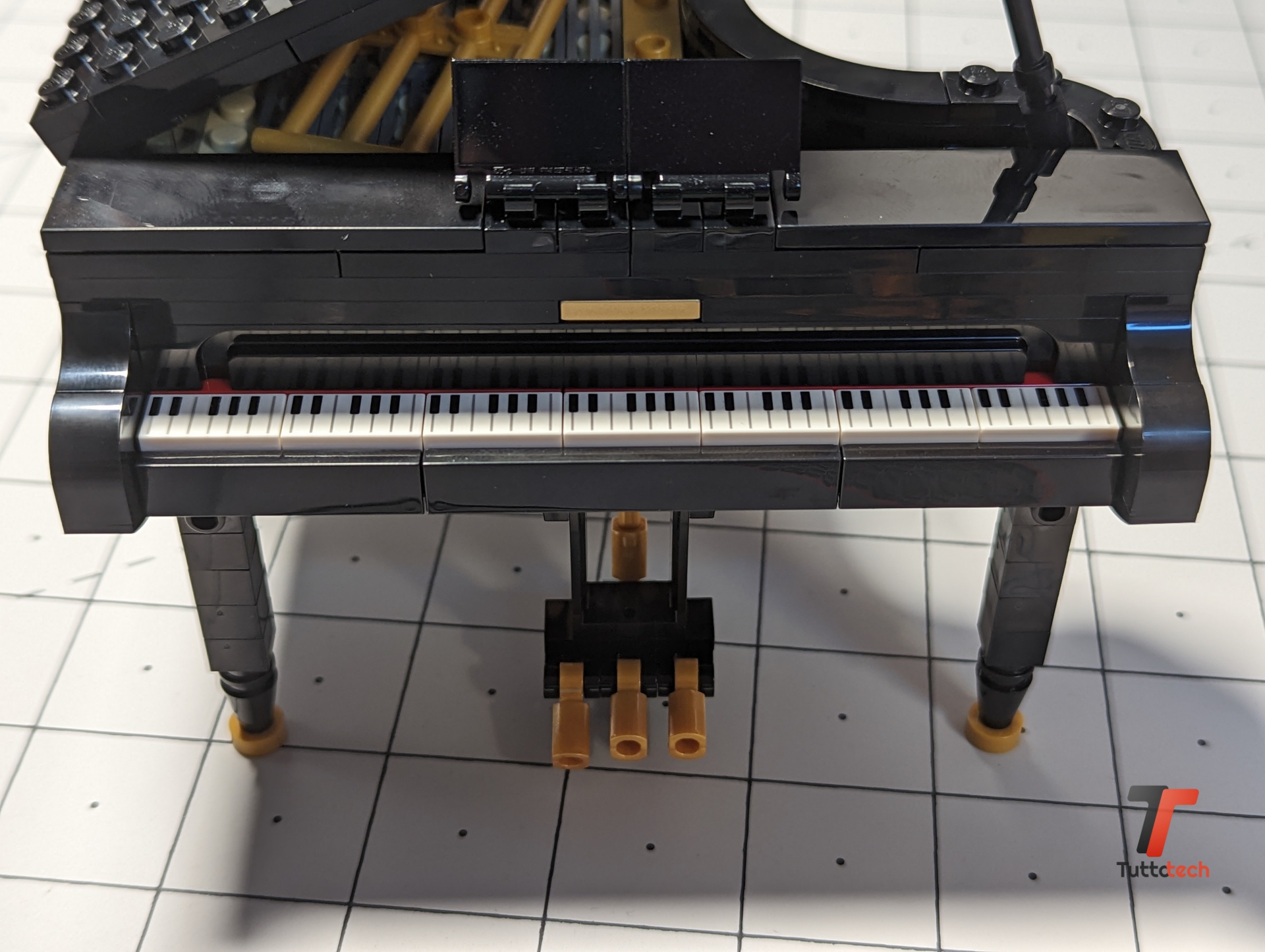 Il pianoforte è sicuramente l’elemento centrale dell’intero set, pur essendo spostato sul lato sinistro, essendo il più dettagliato. LEGO ha infatti curato ogni minimo dettaglio, come i tasti serigrafati, i pedali, lo stesso sgabello e gli interni, visto che il piano può essere aperto completamente.