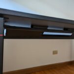 Una volta montate le gambe e fissati alcuni supporti bisogna ribaltare la scrivania (che viene assemblata col piano di lavoro a terra) per poter montare il coperchio posteriore, che copre il vano dedicato alla gestione dei cavi. Il coperchio si alza verso la parte posteriore e dà libero accesso al ripiano dove ho collocato un paio di multiprese, qualche hub per la domotica e alcuni alimentatori.