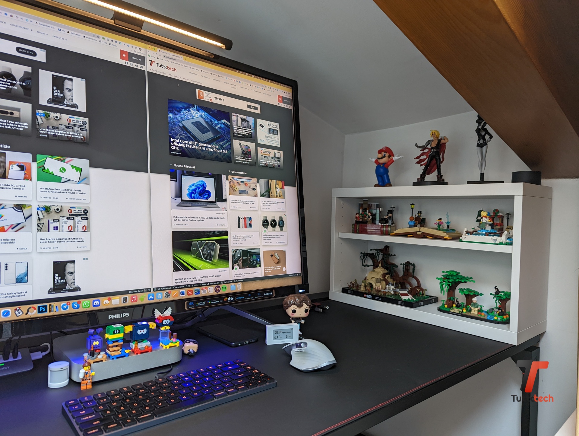 Nel mio caso non ho potuto scegliere un braccio per il monitor visto che uso uno schermo da 43 pollici che deve per forza poggiare sul piano. Essendo il monitor già dotato di un sistema RGB ho preferito non esagerare evitando quindi la fascia luminosa che comunque trovo molto ben realizzata.