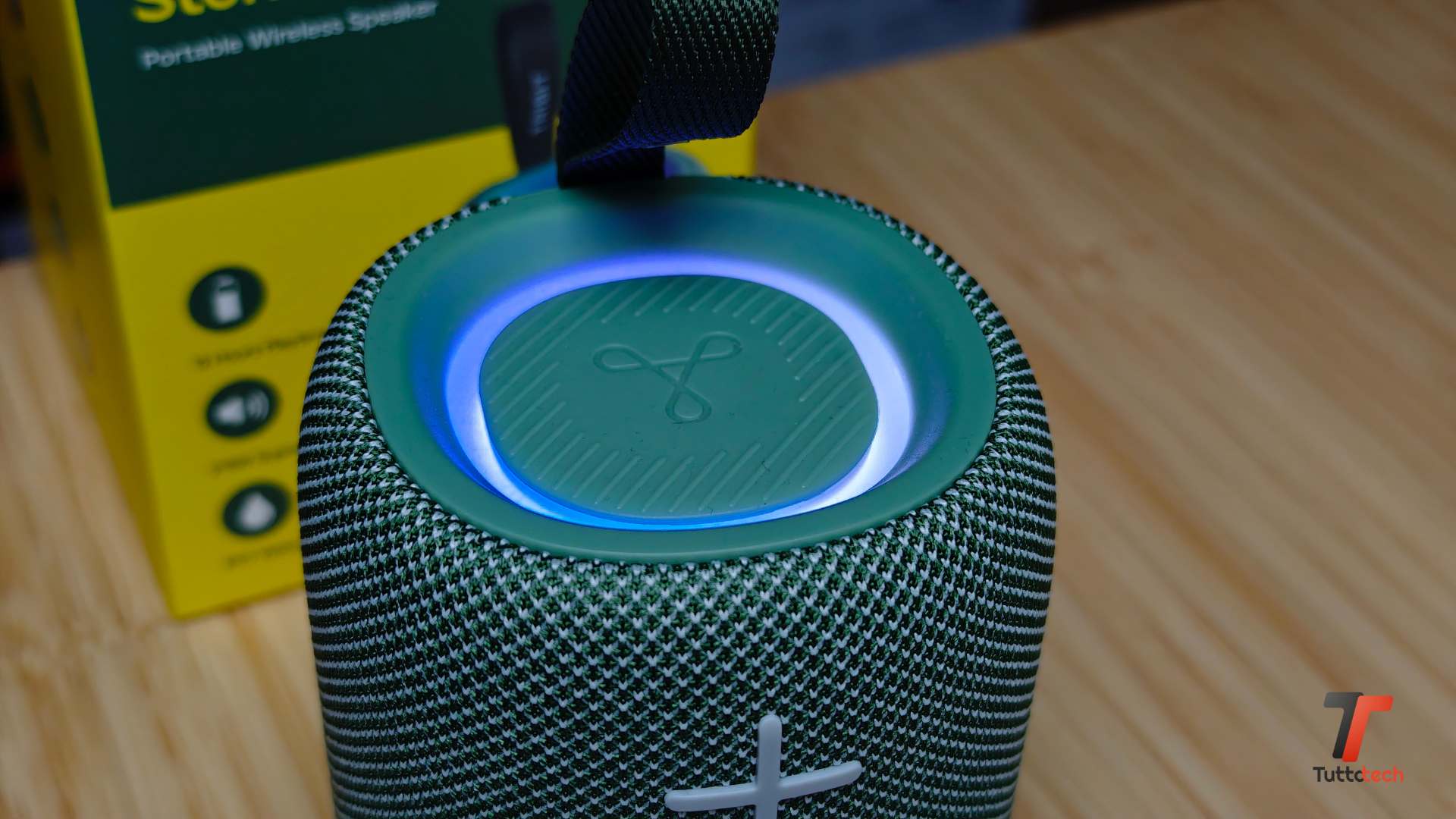 Tribit StormBox Mini+ presenta una texture in tessuto sulla quasi totalità della superficie, una scelta che contribuisce a conferire un tocco premium decisamente inatteso in questa fascia di prezzo. La parte inferiore è realizzata in gomma antiscivolo di ottima qualità, che impedisce allo speaker di scivolare sulla superficie in seguito alle vibrazioni. Nella parte superiore è presente il cono con un elemento ammortizzato in gomma che restituisce un ottimo effetto ottico quando suonate a volume alto.