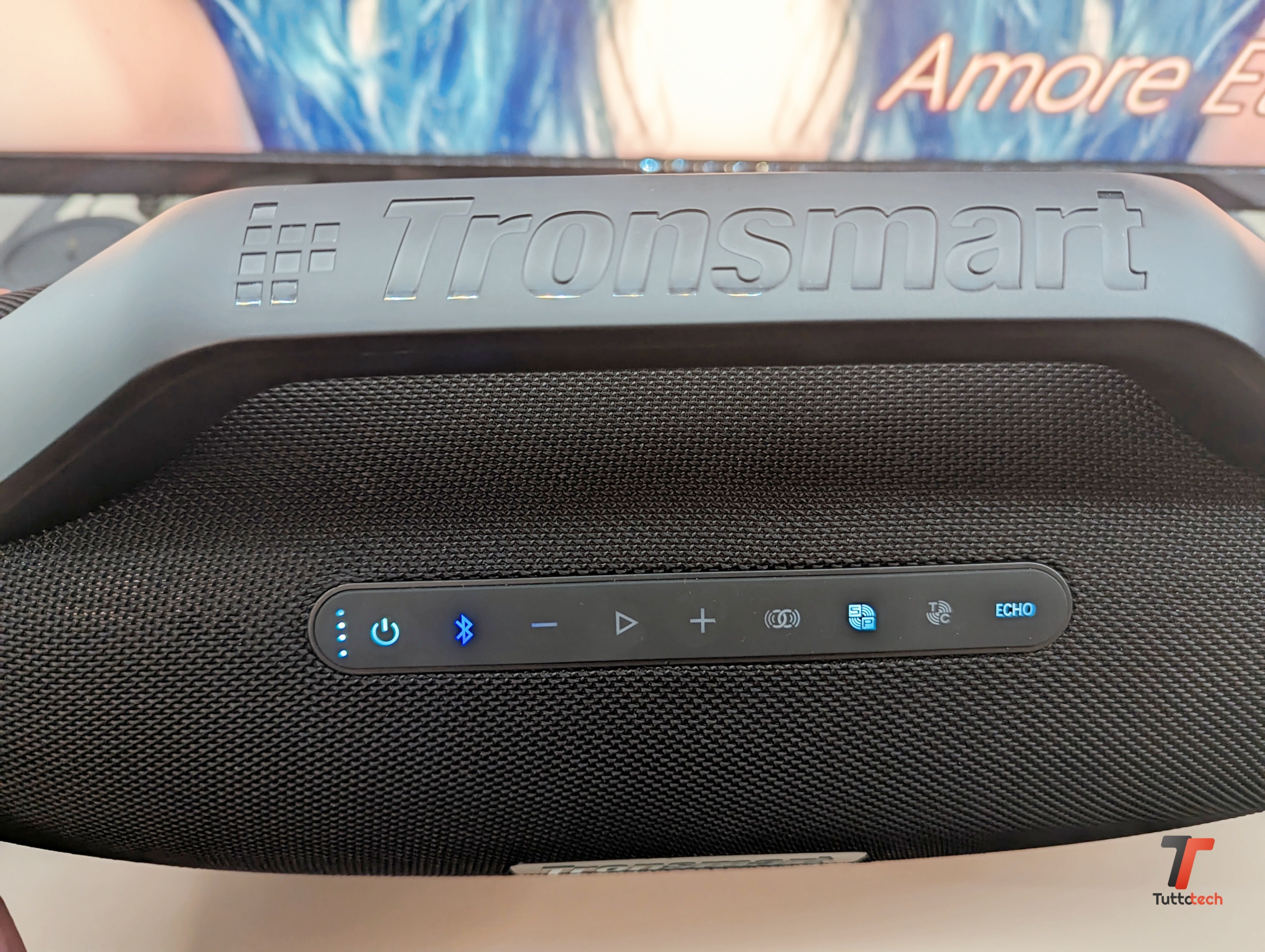 Sotto al maniglione, perfetto per trasportarlo (indispensabile direi visto che pesa quasi 6 Kg), trovano posto tutti i comandi, protetti da una superficie gommata che evita problemi con polvere, sabbia e acqua. Oltre ai quattro LED che indicano la carica residua, troviamo il tasto di accensione, l’indicatore della connessione Bluetooth, i tasti per regolare il volume e mettere in pausa la riproduzione, e quattro tasti speciali.