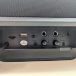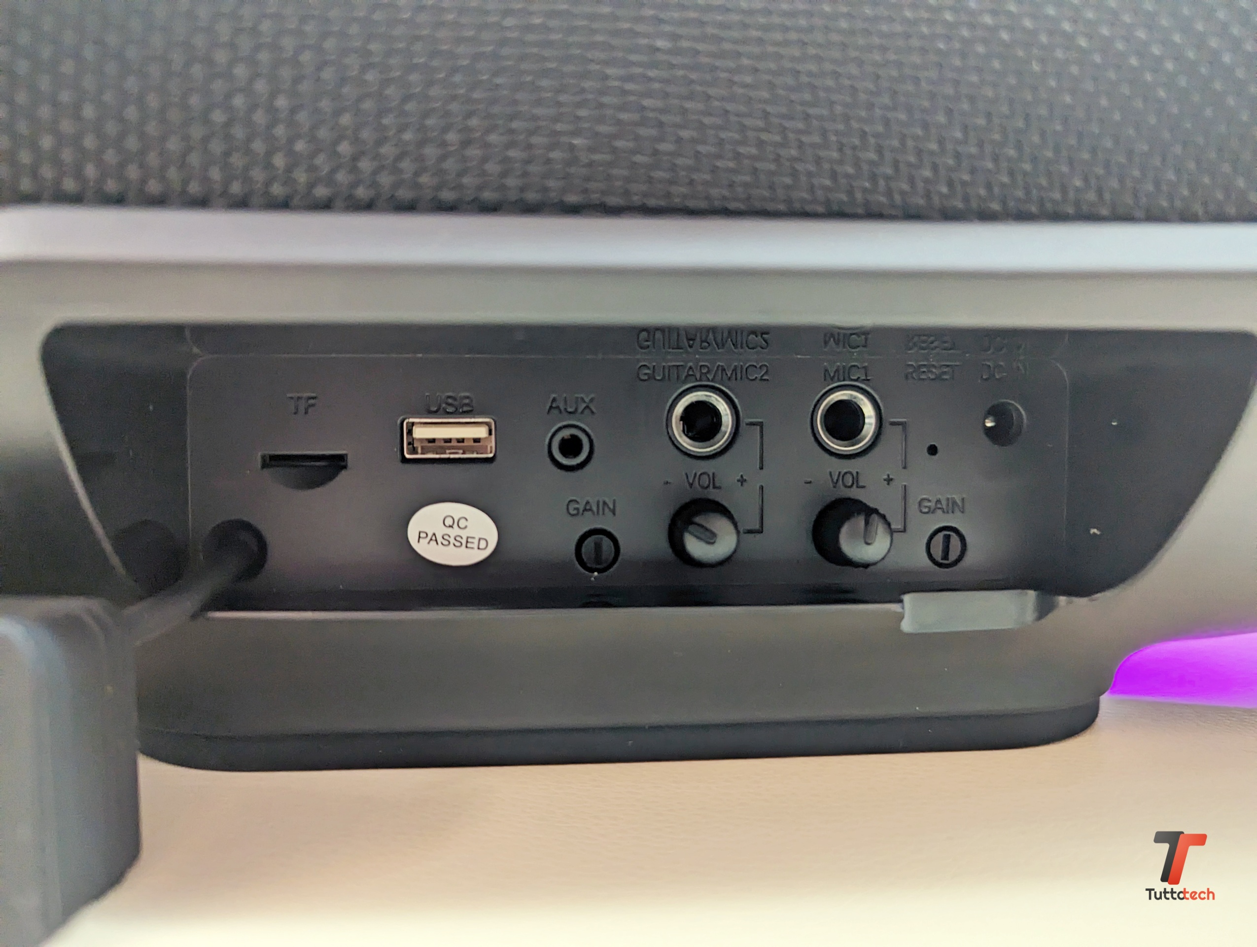 Ricchissima anche la dotazione di connettori, accessibili nella parte posteriore al di sotto di un solido sportello in gomma che tiene tutto al riparo dall’acqua. Abbiamo uno slot microSD, per trasformare lo speaker in un sistema stand-alone, una porta USB-A per leggere la musica da una chiavetta o da un disco esterno, una porta AUX-IN (con cavo in dotazione) per collegarsi ad altre fonti sonore, due connettori da 6,35 mm per chitarra e microfono (ma parleremo meglio di questo tra poco), tasto reset e connettore per l’alimentazione e la ricarica della batteria interna. Sotto ai connettori per microfono e chitarra sono presenti le manopole per regolare il volume e il guadagno dei due ingressi.