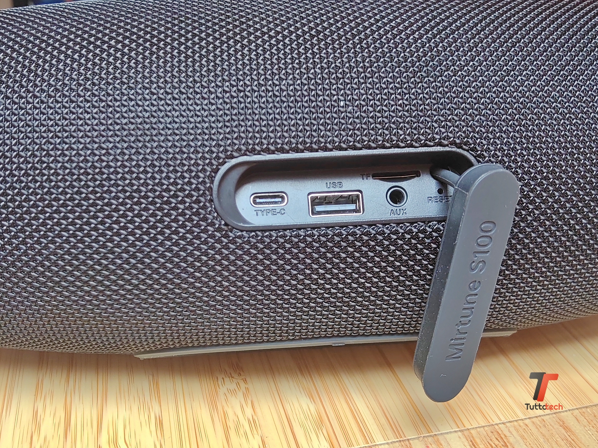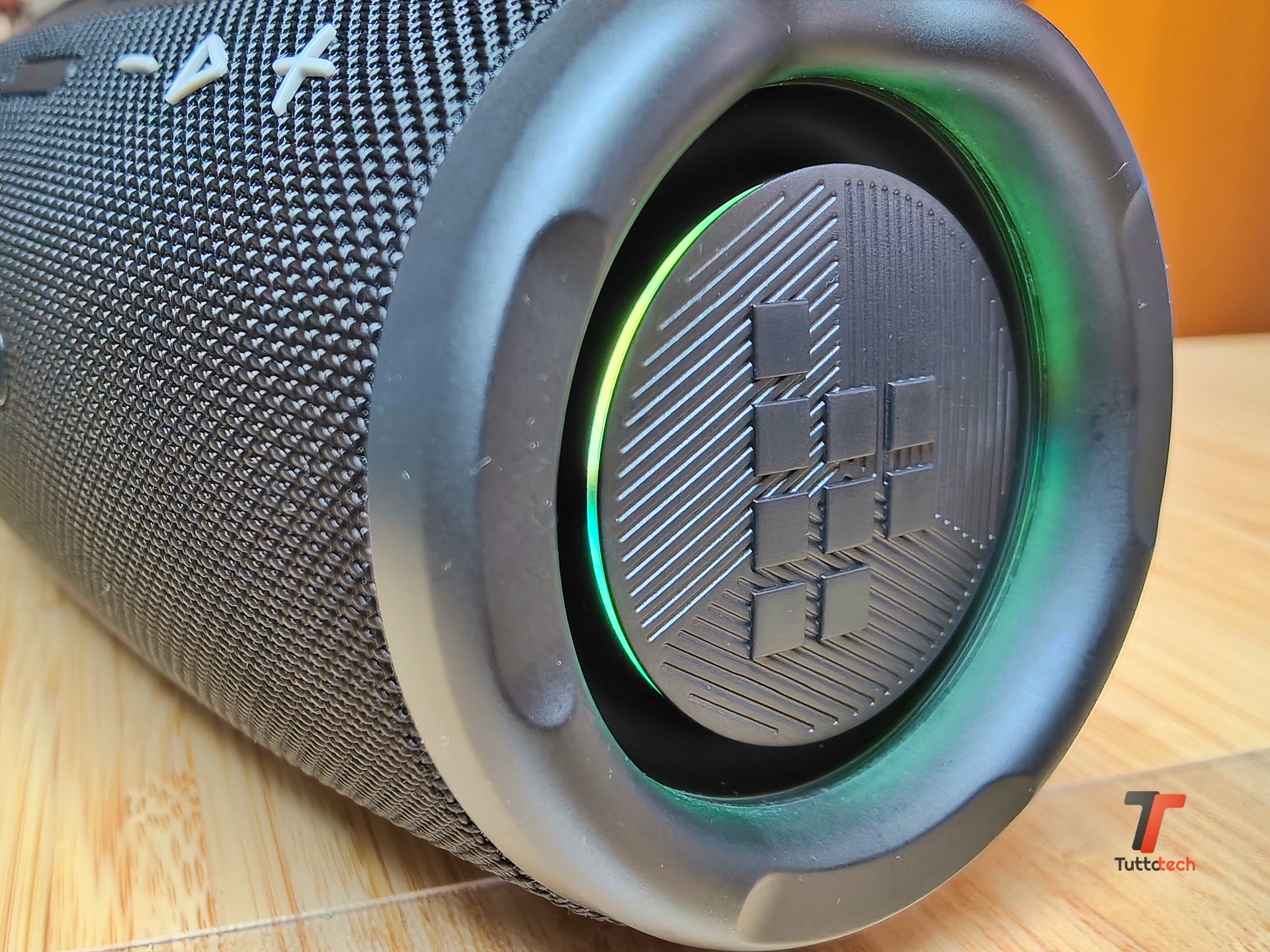 Il riferimento al power bank non è casuale e legato alla grande autonomia, tutt’altro. Potete infatti usare la porta USB-A posta sul retro dello speaker, protetta accuratamente da uno sportellino in gomma, per ricaricare il vostro telefono o un qualsiasi altro dispositivo a batteria, un aiuto davvero valido se nel bel mezzo della festa il vostro smartphone dovesse trovarsi a corto di energia.
