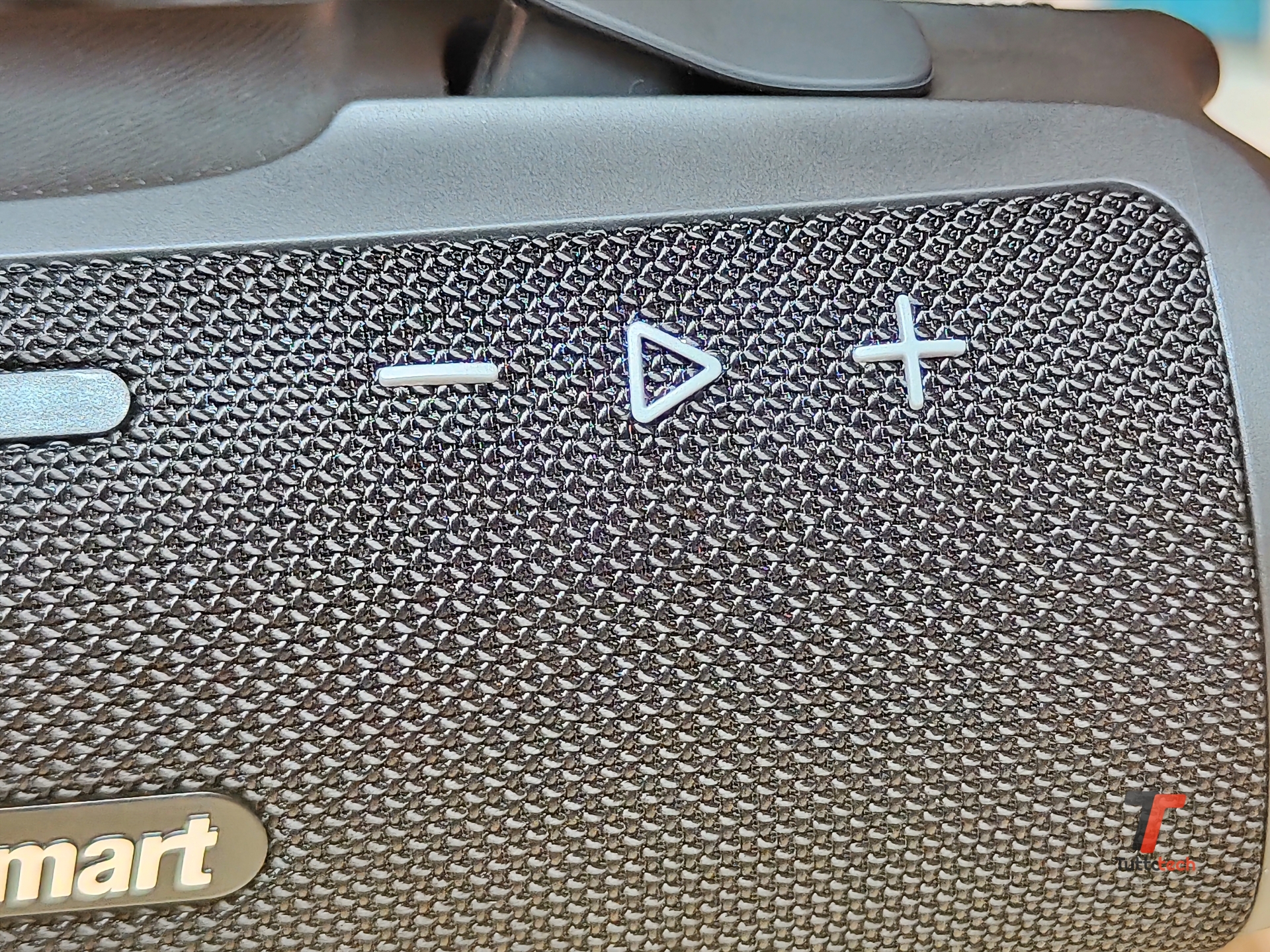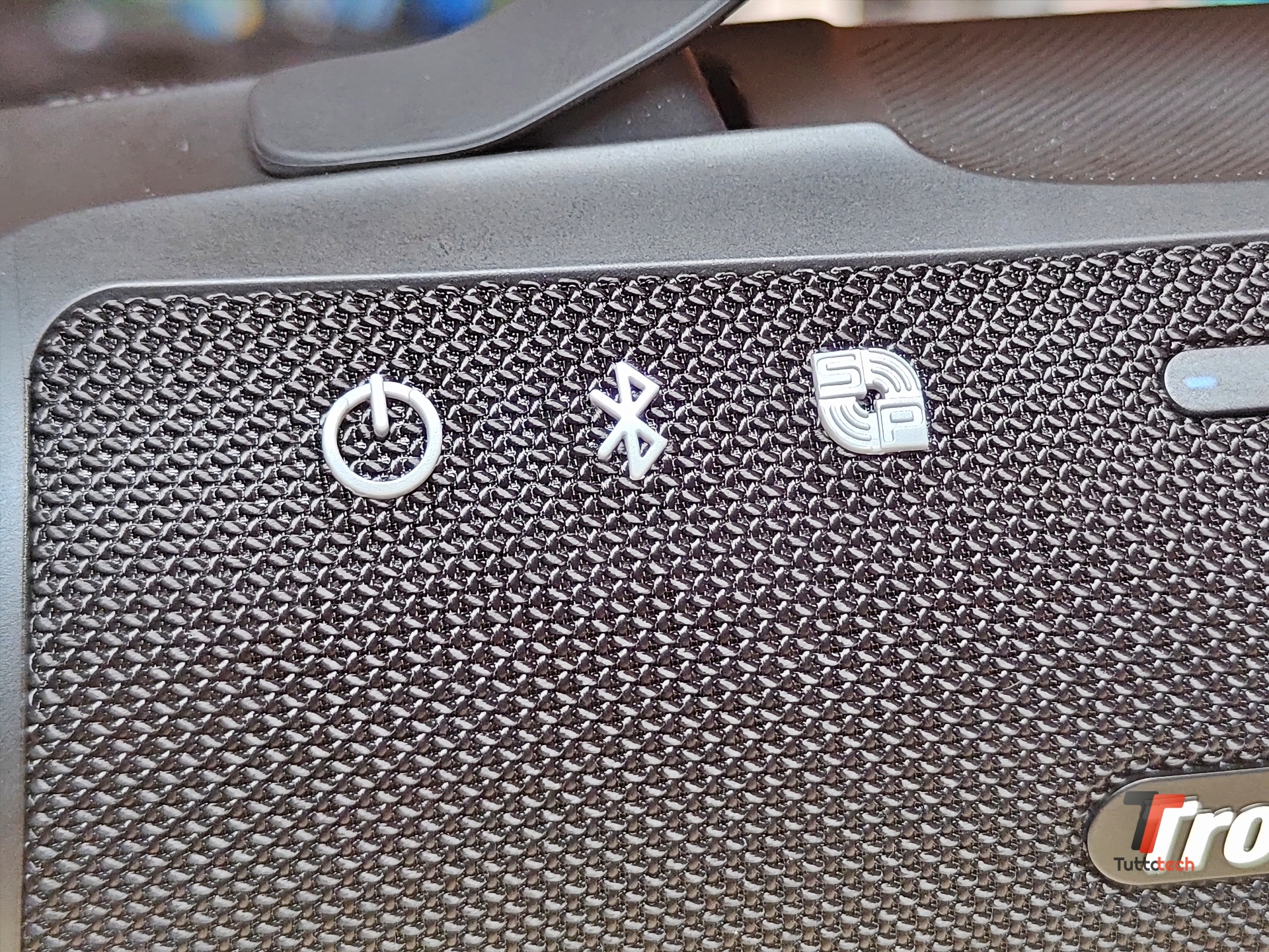 Nella parte superiore è presente una grande maniglia in gomma morbida che può rimanere sollevata per semplificare il trasporto. Nella parte frontale, oltre al logo, sono presenti i controlli, sotto forma di pulsanti in plastica inseriti nel tessuto. Sono presenti i controllo per la regolazione del volume e per l’avvio della riproduzione, il tasto di accensione/spegnimento, il tasto per attivare la modalità di accoppiamento Bluetooth e il tasto che attiva la tecnologia SoundPulse, che permette di liberare tutta la potenza andando a enfatizzare le frequenze più basse.