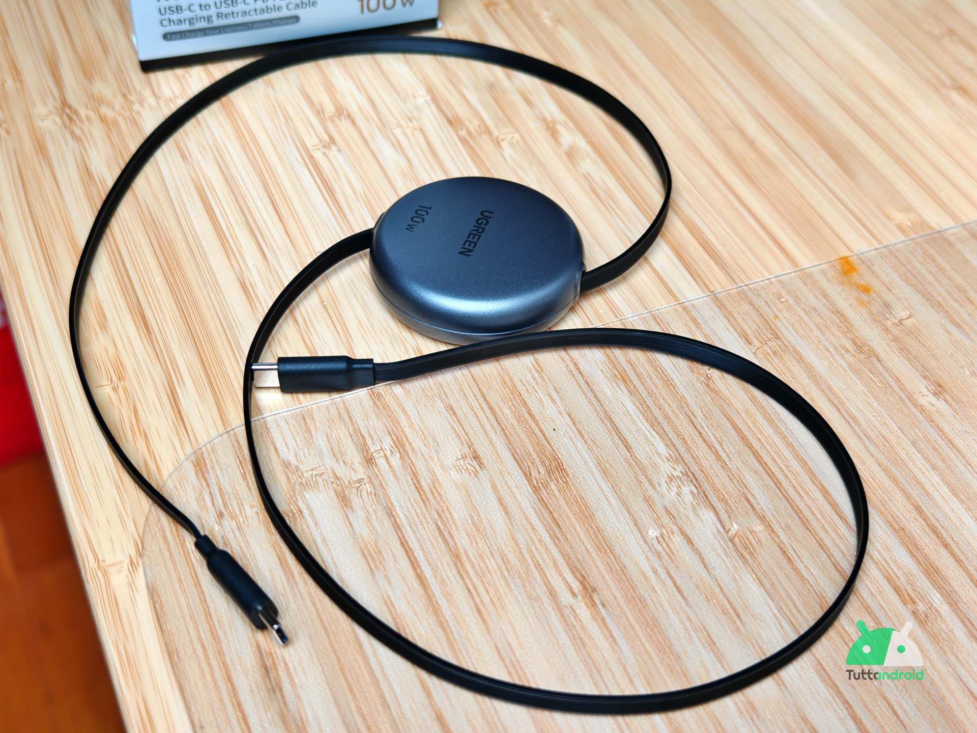 La proposta di UGREEN, invece, è ingegnosa nella sua semplicità: un “disco” di plastica con un diametro di 58 millimetri e uno spessore di soli 18 millimetri. Questo lo rende ideale per essere riposto in tasca, in una borsa o in uno zaino. Per utilizzarlo, basta afferrare i due connettori USB-C ed estrarli delicatamente, srotolando le due estremità del cavo fino alla sua massima estensione di un metro. Una volta raggiunta la lunghezza di 94 centimetri, un sistema di bloccaggio impedisce il rientro spontaneo. Per riavvolgerlo, è sufficiente tirare leggermente verso l’esterno e lasciare che la molla interna faccia il suo lavoro, ritraendo le due estremità.