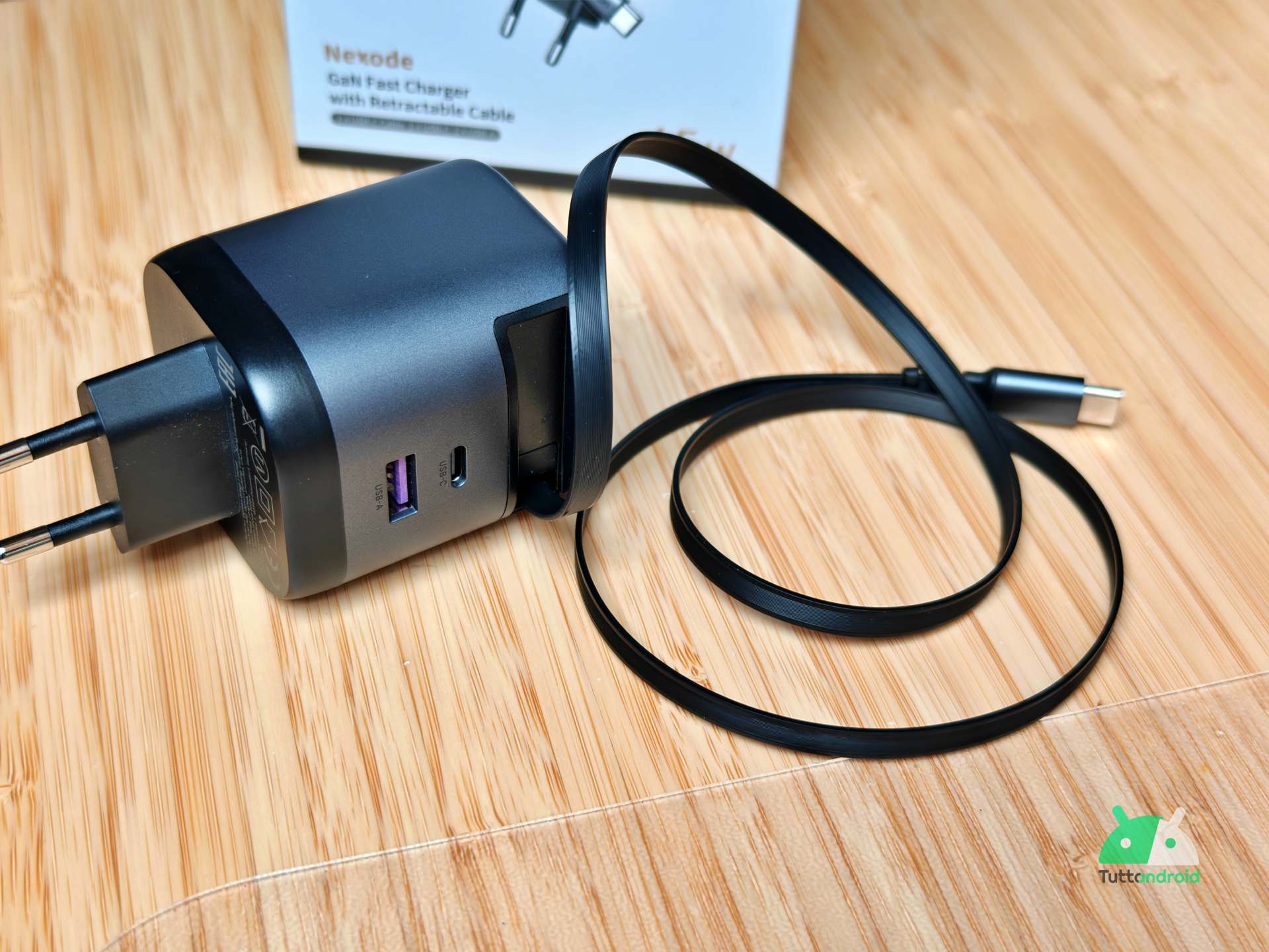 Il design di UGREEN Nexode GaN Fast Charger, in linea con l’intera serie, è caratterizzato dalla presenza di un cavo USB-C retrattile integrato nella parte superiore. Questo cavo offre una potenza massima in uscita di 60 watt, una comodità ineguagliabile che elimina la necessità di portare con sé cavi aggiuntivi. Subito al di sotto del meccanismo retrattile, troviamo una porta USB-C e una USB-A. La prima è in grado di erogare fino a 65W, mentre la seconda è limitata a 22,5W; i valori effettivi di output si adatteranno dinamicamente al numero di dispositivi collegati.