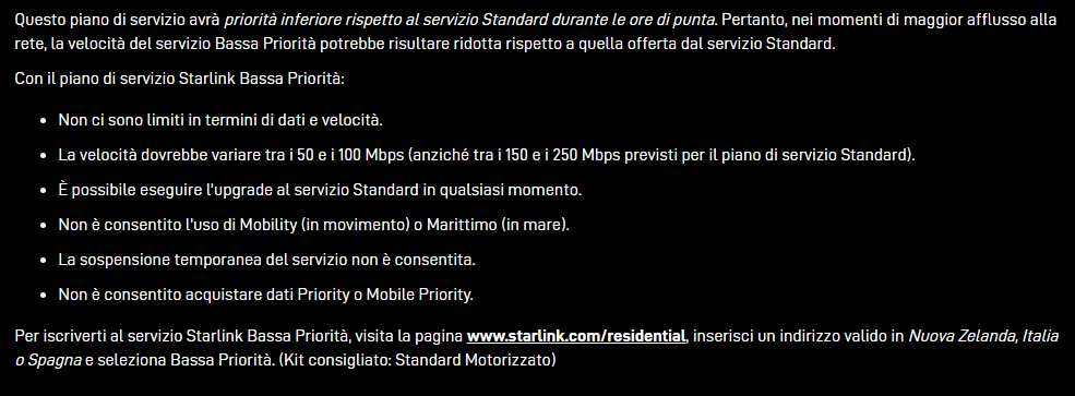La novità dell’ultimo periodo è proprio l’abbonamento “a bassa priorità”, costa 11 Euro in meno al mese e Starlink non è molto chiara su quelle che sono le differenze rispetto al piano standard. Il punto principale è la diversa priorità nei momenti di maggior traffico. In linea teorica immaginando una congestione nelle ore serali, Starlink toglierà banda e velocità agli abbonamenti “bassa priorità” garantendo invece performance superiori per gli “standard” e i “priority”, con questi ultimi che dovrebbero riuscire a navigare sempre al massimo quando sono all’interno del loro pacchetto dati prioritari.