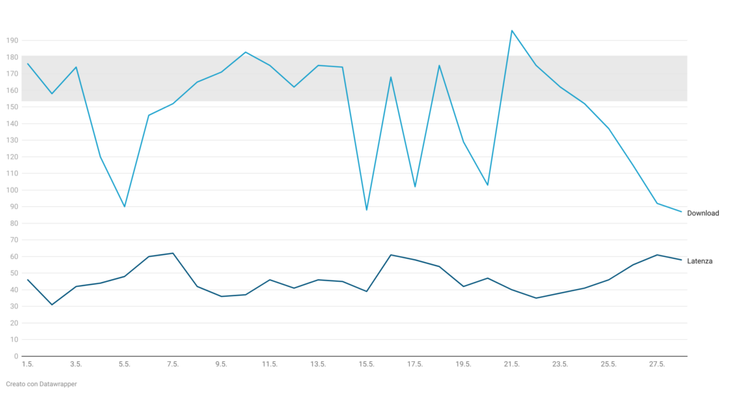 La fascia grigia evidenziata è quella media in cui ricadono la maggior parte dei test di velocità di download eseguiti, tra i 155 e i 180 Mbps. Abbiamo utilizzato sempre lo stesso server di destinazione e ripetuto il test più volte per minimizzare cali di velocità casuali. La linea blu scura è quella relativa alla latenza, sempre attorno ai 50 ms ma non è un dato che varia tra abbonamento standard e bassa priorità.